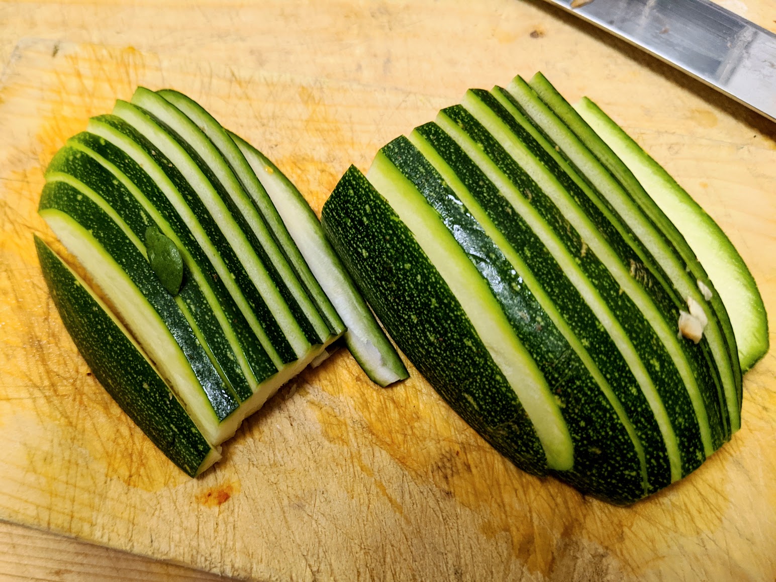 ...and then cross-slicing. Slicing gives more even cooking throughout.