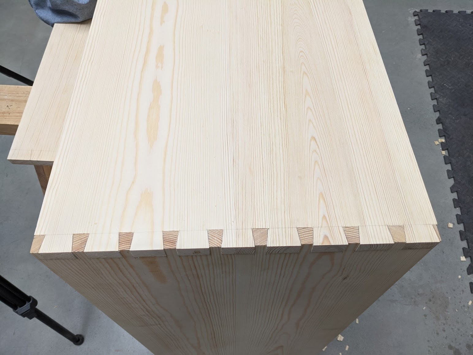 As my dovetails seated into their individual recesses I could see one joint that had a perfect parallel gap to the line resulting in a gap. With around 54 joint lines surrounding the pins and tails it was the only gap and it was about 1/10 of a millimetre wide. The gap was perfectly parallel. I should reiterate this because, well, it looked nice. Showing my work to a hundred people, I am sure everyone's eye would be drawn to this 'imperfection' and, as my work often does in videos or photographs on my blog, would induce someone to make comment assiduously on my erring saw cut. Smiling as they say, "I am sure no one else will notice but I did perceive a small gap there in the dovetails." and tapping the side of their nose to say, "Your secret is safe with me!" Fact is, for me, what was perfect was that the joint's efficacy did not depend on that joint aspect being tight. With nine recessed dovetails in place the joint will remain together for 300 years. Why would I worry? It was, indeed, perfect!