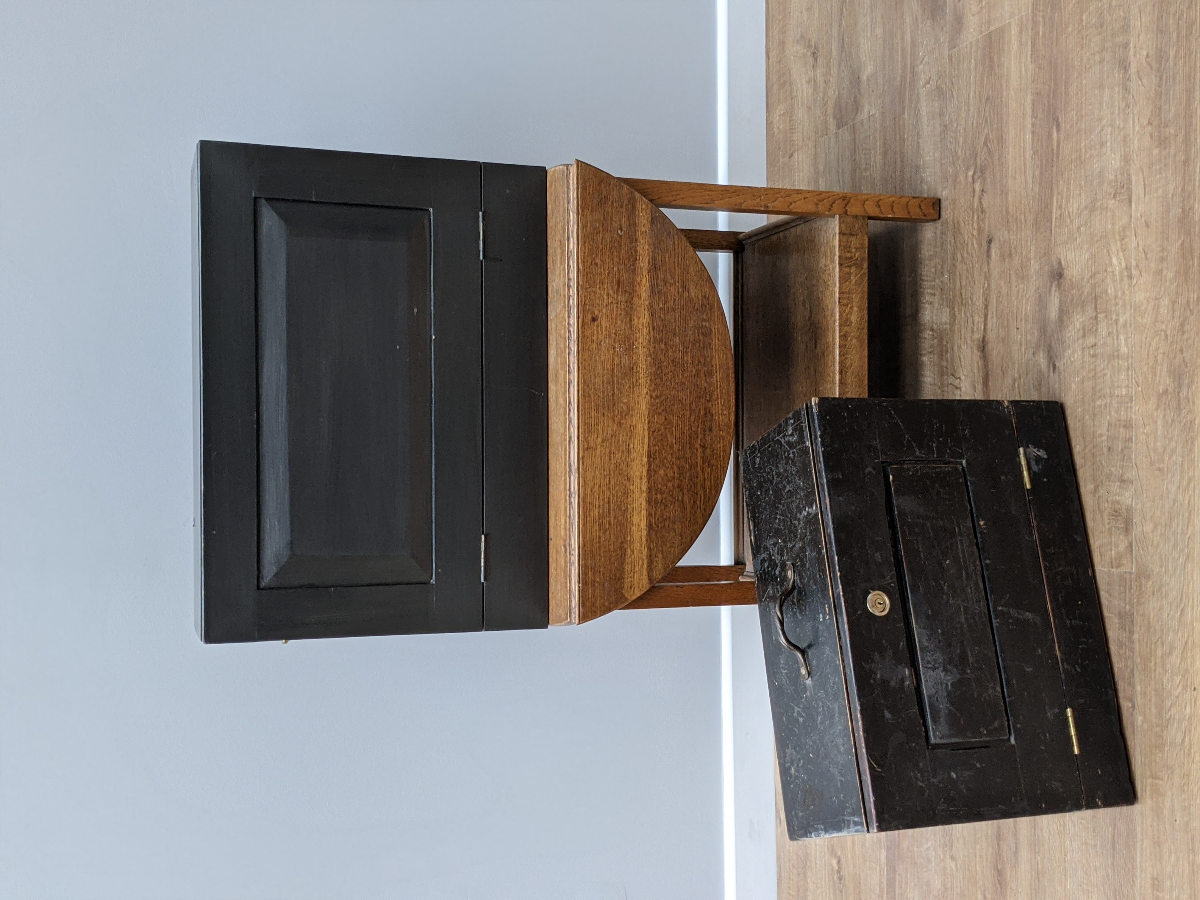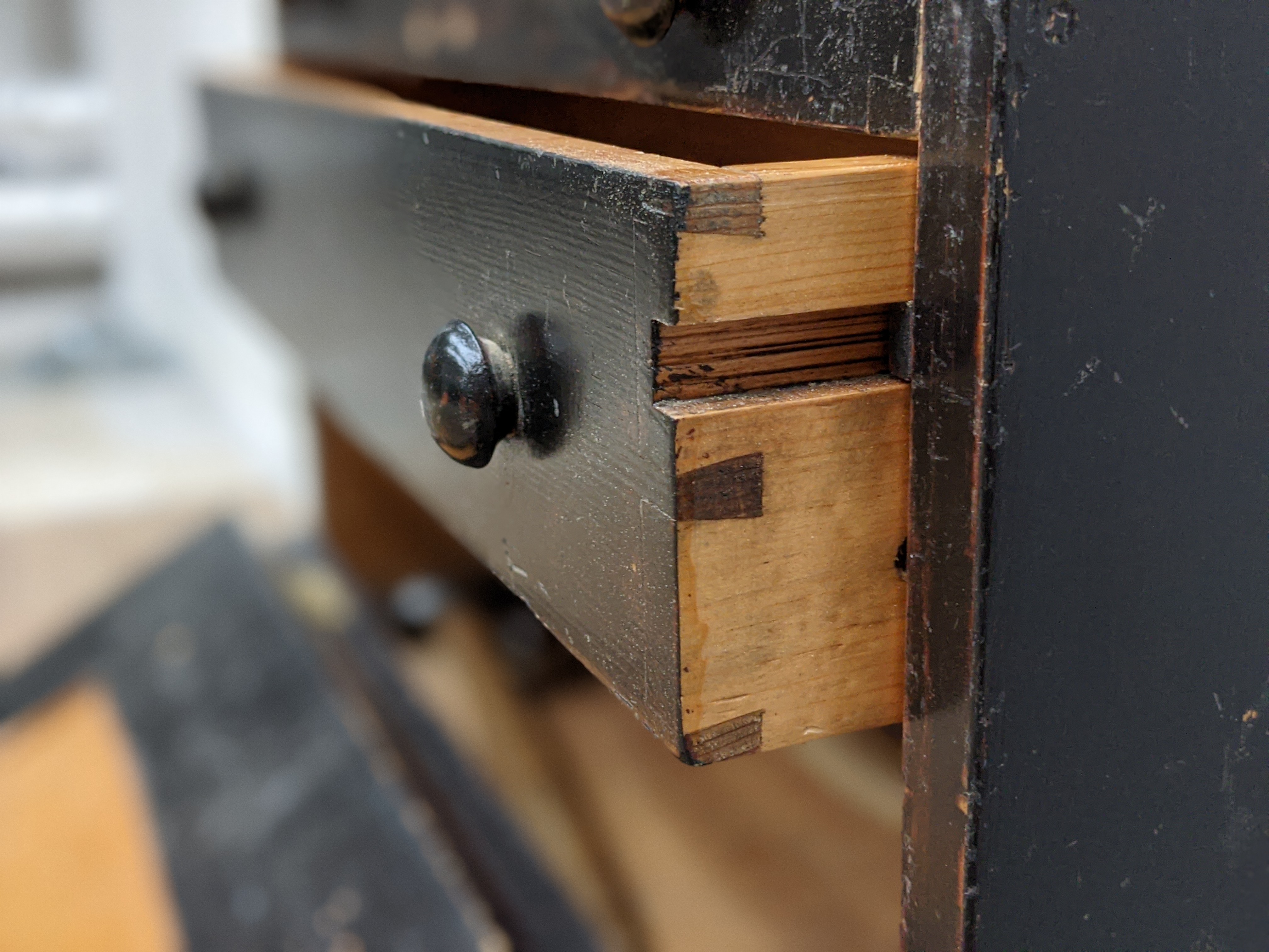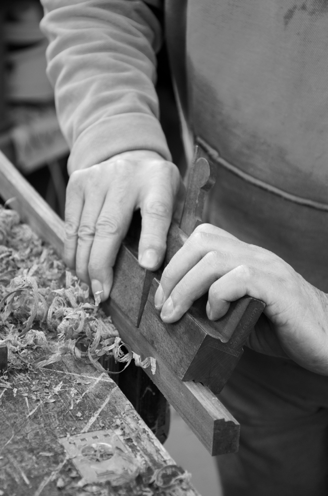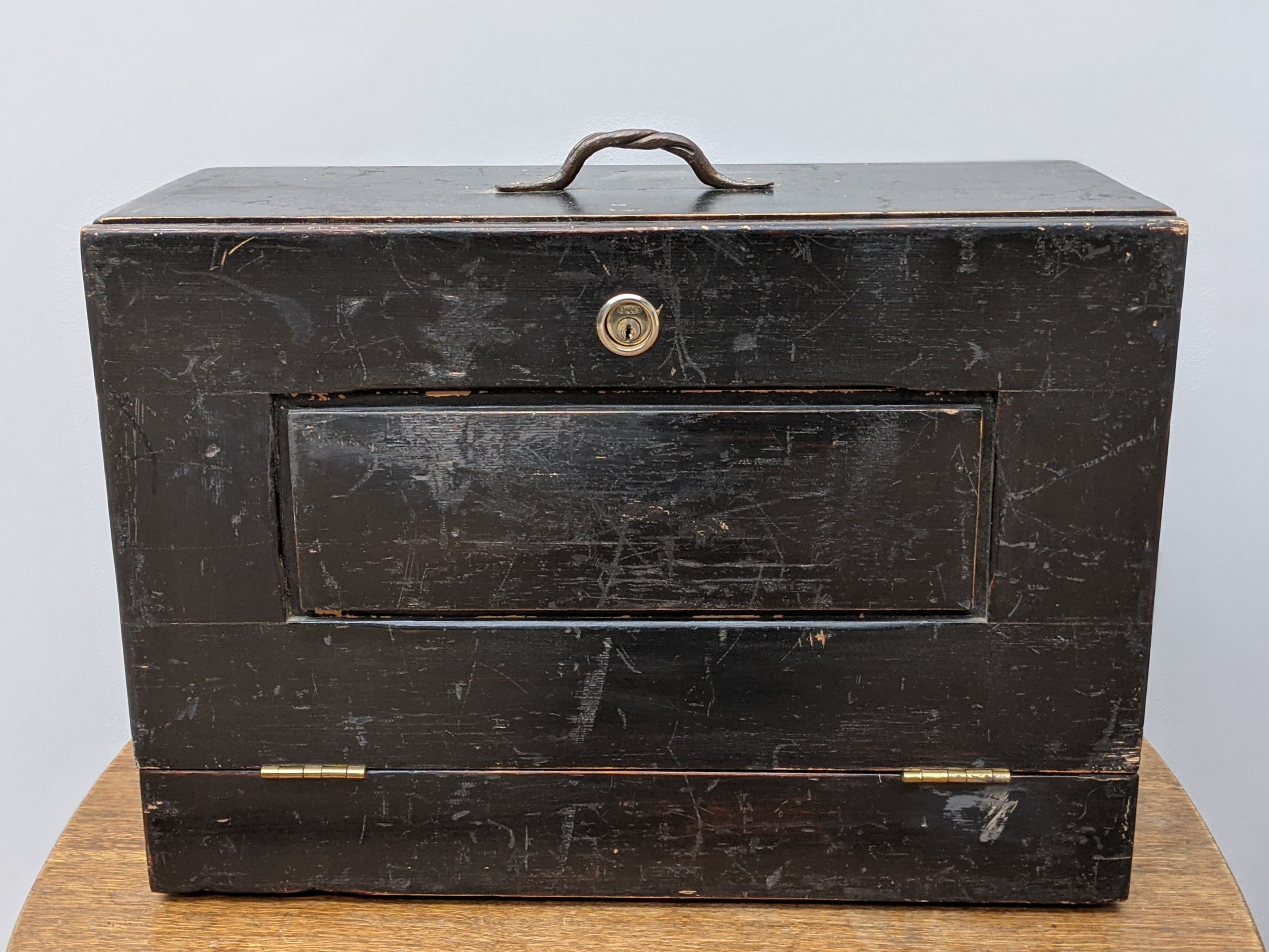 I redesigned the toolboxes of the day to create something with added longevity and a hidden quality that equalled the value of the tools inside. Reach back into the history and most toolboxes and chests were painted and repainted throughout a century and two of use. Beneath the workbenches stood two or three massive boxes filled with hand tools. These were taken to site, office and house, but traveling toolboxes for repair work would carry the tools to site with greater ease. As I said, this box below and at top was my original, uncopied design. This one is the smallest one that I have made and the one above is the more traditional size. Remember that joiners working in houses and offices transported their tools on two-wheeled pushcarts, alongside other equipment, wood and such.