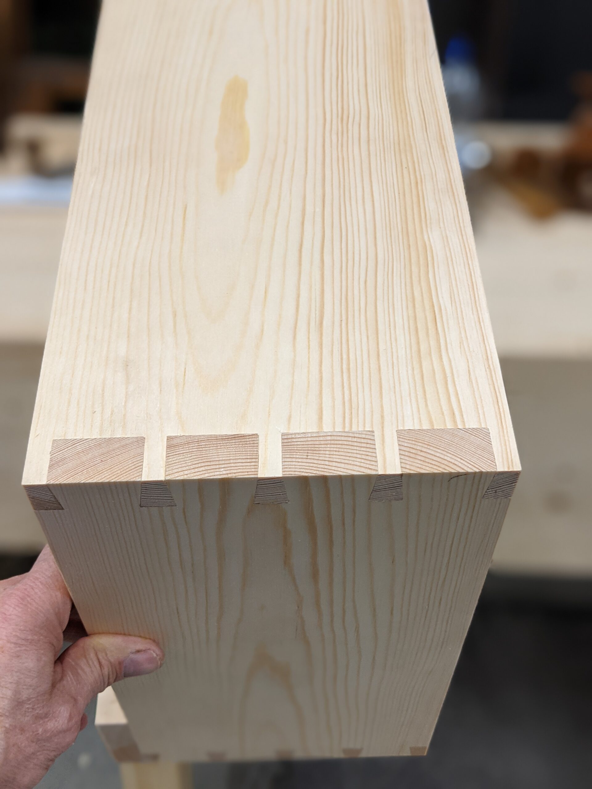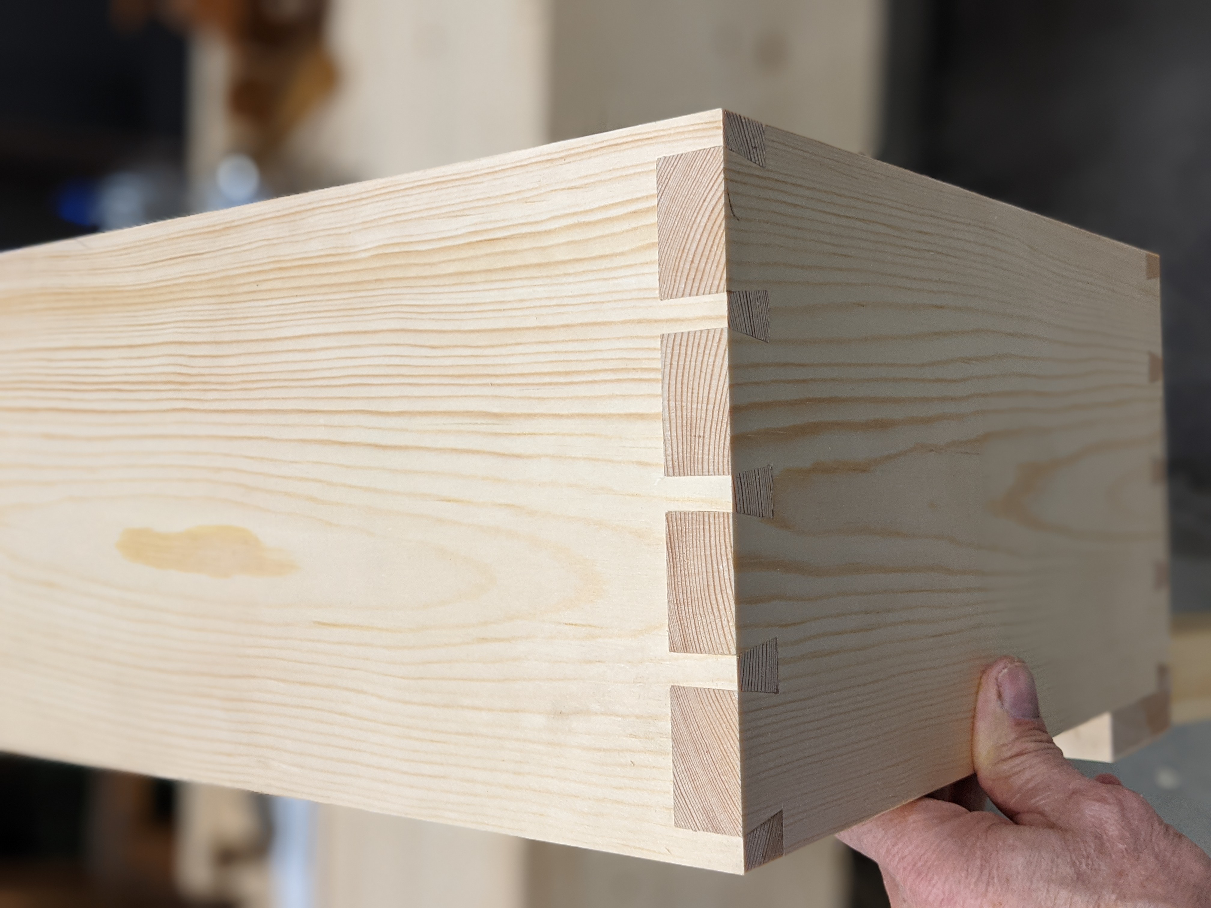 Being raised with machines alongside my hand skills for me meant choices. I could choose delivery using one or the other or a combination of both. In my apprentice days I worked with a dozen men who could create a dovetail in a few minutes by sight and with no more than three or four hand tools. I was taught the basics by them, yes, but the skills I then developed had little if anything to do with them. It was after I left them and my apprenticeship that I entered the sphere of creativity that demands investment and investigation. The questioning of how and why this or that made me think critically about what craftwork meant for me. I didn't want the easy path, I wanted to understand why I worked and what I worked for. It was not money I sought but a whole life existence. What did I value the most? Just how could I engineer my way of living and live what I believed in to be the best for me and my family. Soon I developed my own ideas and skills. I became at least as fast as others were using their machines and my neatness in execution continued to grow and grow. Skill takes time but then the satisfaction is incomparable. It was in my mid to late 30s where I needed to decide my future. I needed to ask myself whether my enjoyment creating with my hands could indeed parallel what I could produce in my machine shop where I had found myself mass making and being driven by machines. With four boys behind me, I did not want them to push stuff into machines. I trained them to work only with hand tools until they were out of their 20s. They all have a hand skill and a belief that they can make anything from wood with their own hands. My apprentices have all, all, been treated the same way. No power equipment until hand tool mastery is fully established. I think it is fair to say that in many woodworking businesses, using the machines would be seen as a mark of maturity in the same way young people might see driving a car in their teen years. Somehow such things seem apt to validate when in many if not most cases they substitute for maturity. Give someone a chainsaw and they will never drop a tree with an ax or a two-man saw. So it is with professional woodworkers. I found myself more isolated in the early days in the USA than I did at any other time in my life. When people saw me use a tenon saw they somehow turned away. That is at first! But then I got a call from a woodworker's guild in Mesquite, Texas where a small shop owner asked me if I would like to come and "show and tell" why hand tools work. Twenty men in belts and braces (suspenders US) stood in a circle around a very poor-quality workbench as I cut my twin dovetails in just shy of two minutes. There was a show of hands as several of them reached for the dovetail in unbelief. From that point, unintentionally, they were eating my sawdust. We each stood at the bench and cut a first dovetail. By the end of the morning, every man had cut his first dovetail and every man believed in himself from that point on.
