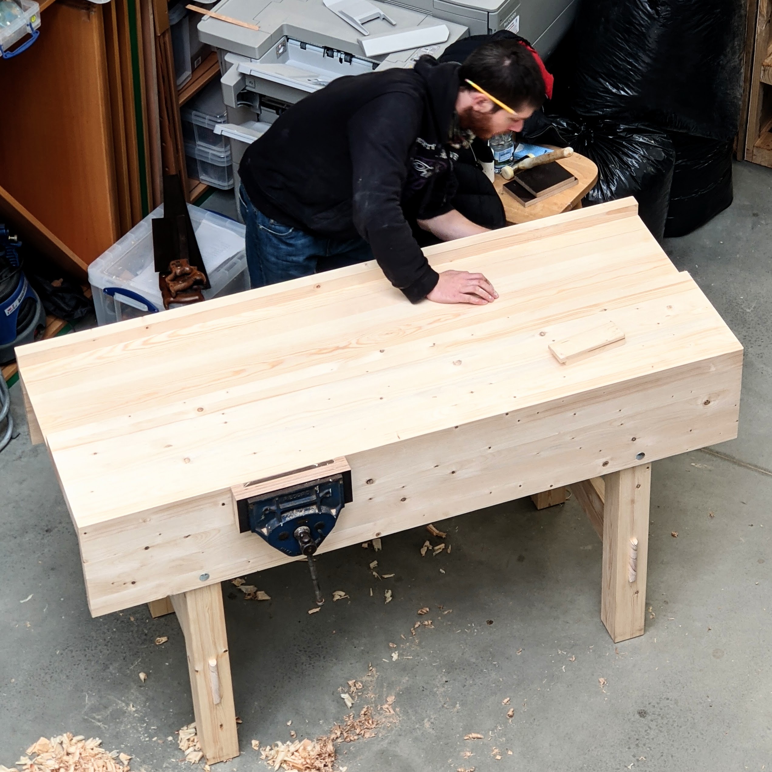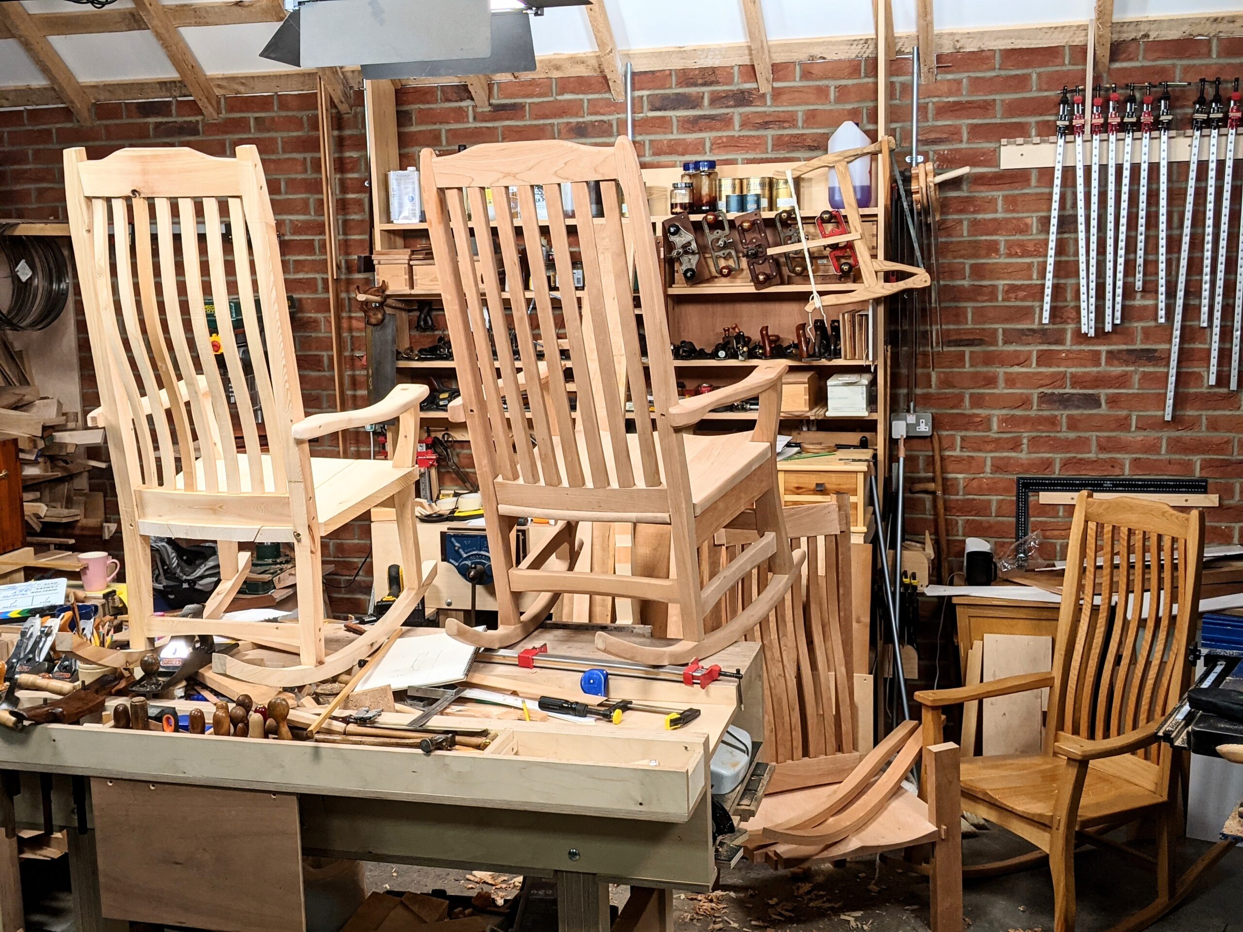 My creative sphere is in a pretty near constant state of flux. One minute I'm neat and tidy and the next a dozen clamps find space to rest on the floor after I just dismantled an assembly to release bent wood from its constraints in a caul. Several rocking chairs rest round me and I am busy on the final version as we film it.