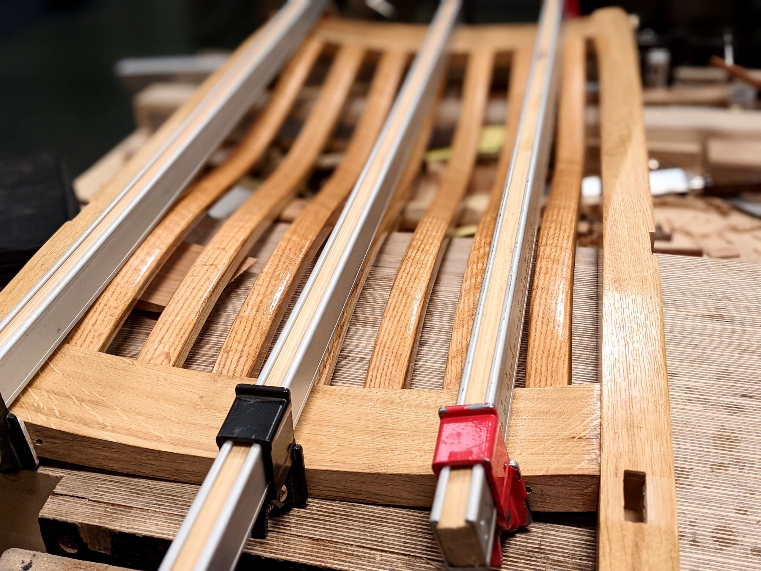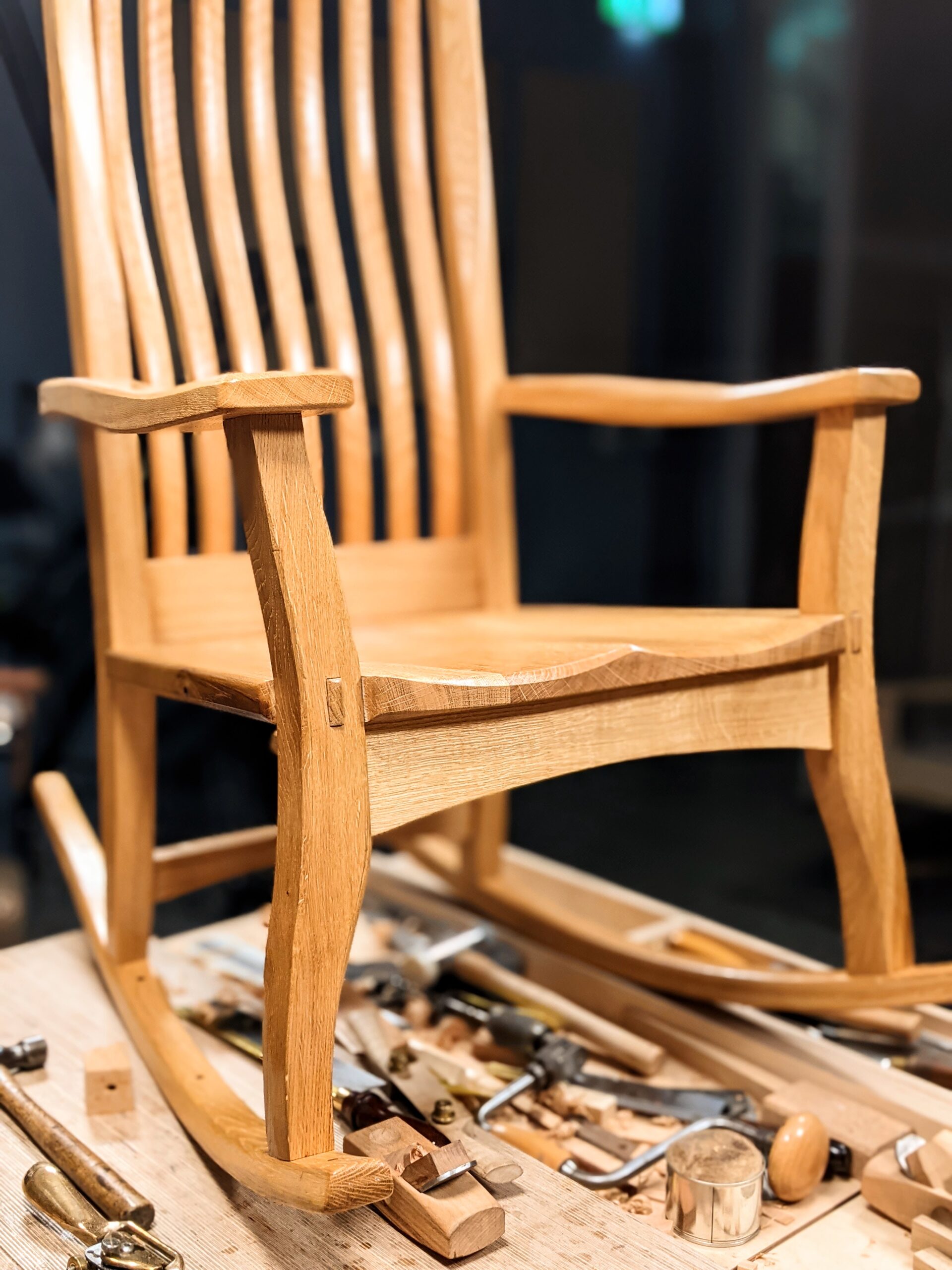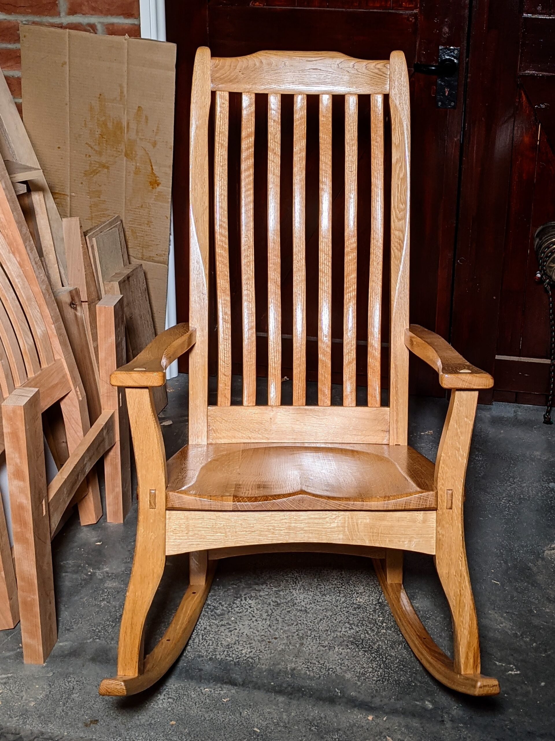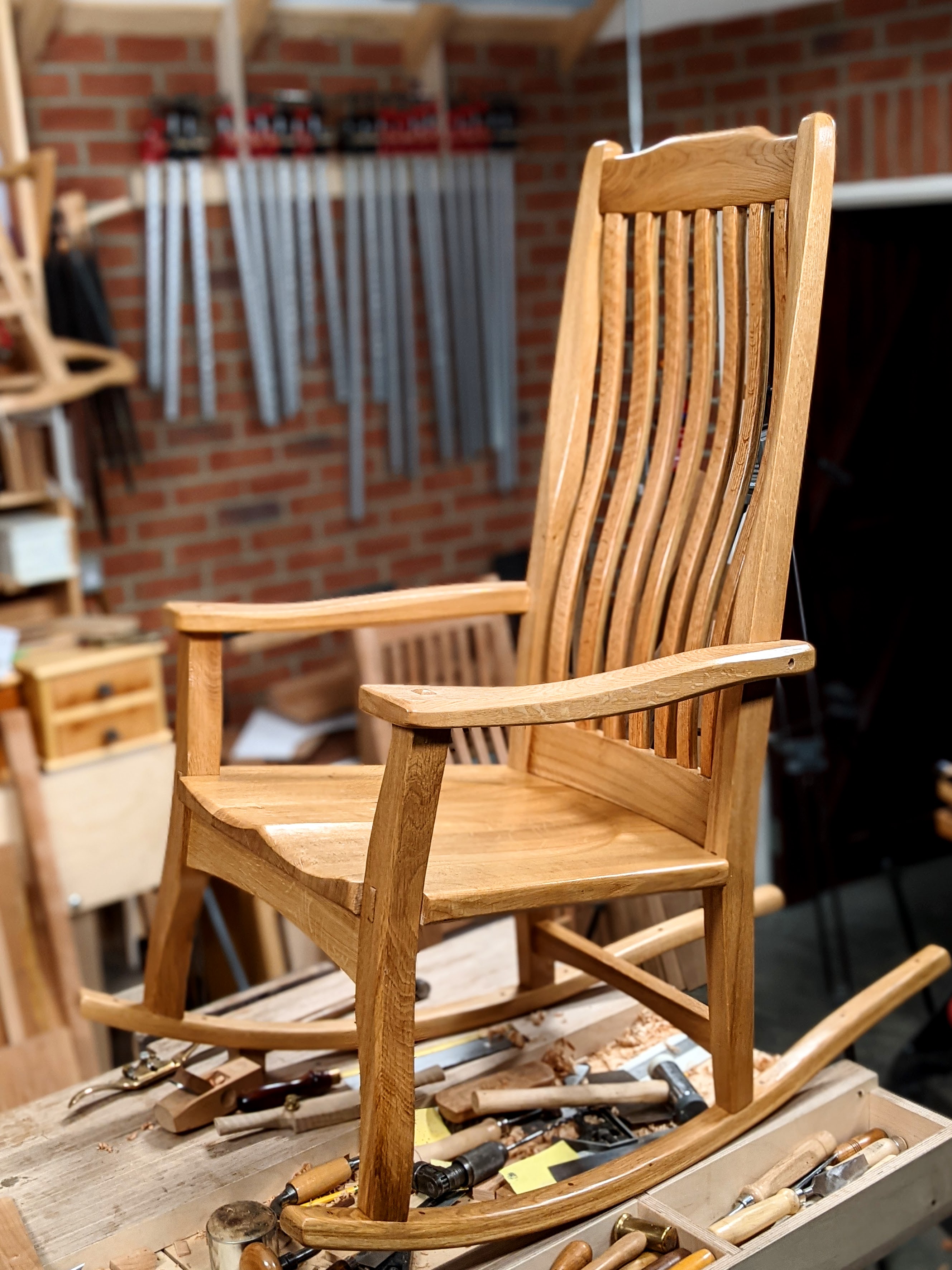 All my bends are laminations but additional shaping took me a whole day with a spokeshave, a rasp, file and a scraper. I have customised it to fit me but it will suit anyone smaller and some bigger. I think anyone making this chair will find the work interesting and rewarding. I have made one in a mix of softwoods, the initial prototype, a second prototype, this one featured here, in solid oak and currently I'm making the last one in black cherry. This will be my fourth rocker in 6 weeks.