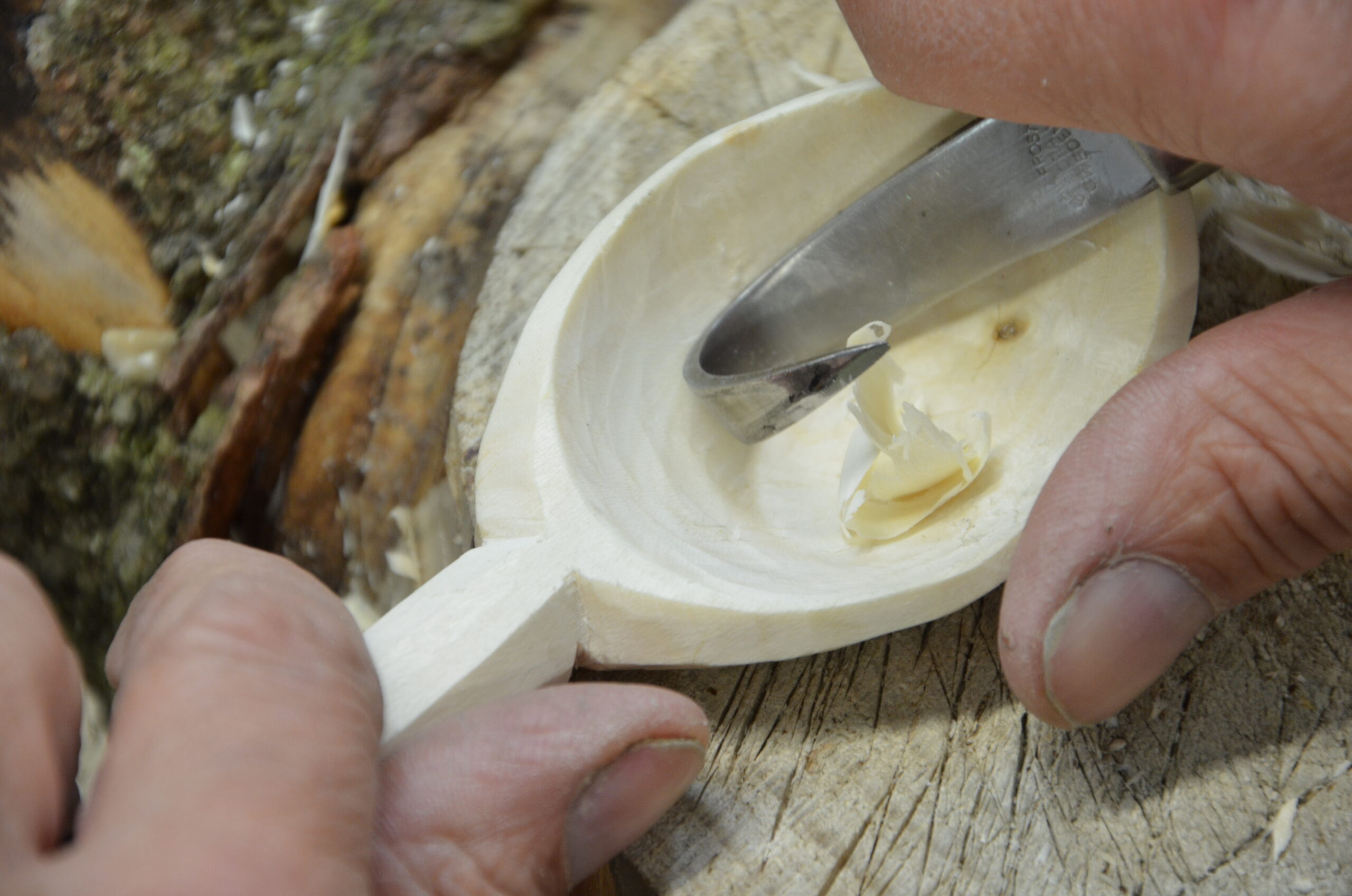 This man also carved spoons with a bent, curve-bladed knife. If he wanted to make a living from this, he'd chosen a hard row to hoe. That said, one or two have done that. Finding enough buyers in an idyllic country village made it impossible to generate a living from walk-in footfall. His skills and abilities were in reality quite limited for a long-term career path; some can make it this way, but the majority cannot. Buying a spoon in beech for under a pound makes it hard to compete when the hand-carved spoon does no more for the user in a bowl dough mix than the one you might pay £30 and up for This is where reality hots. And therein was the problem. Was it enough to take a two-day course in an English coppiced woodland to then launch yourself into generating income from whittling spoons from windfallen limbs and so-called "free wood?"