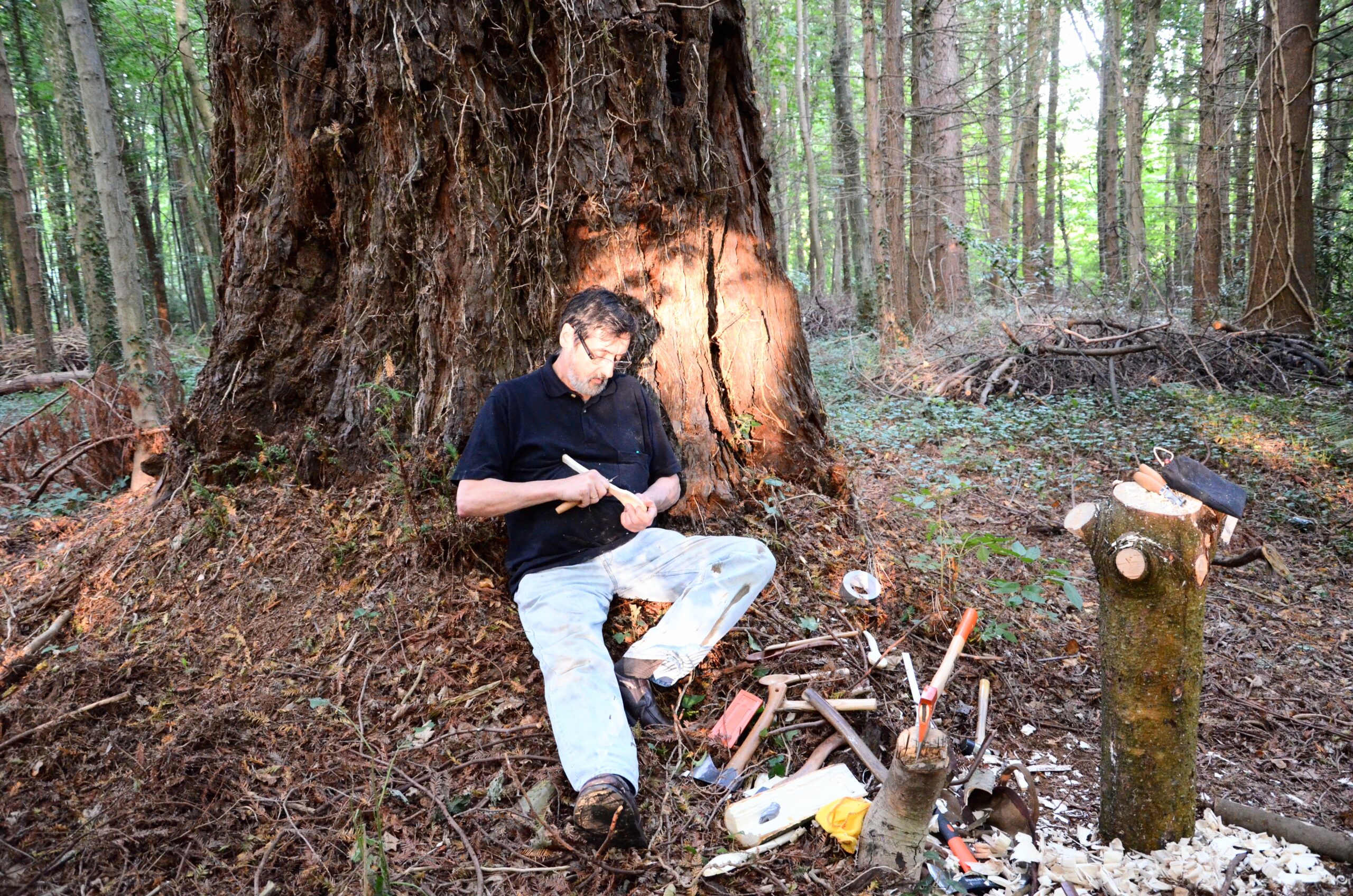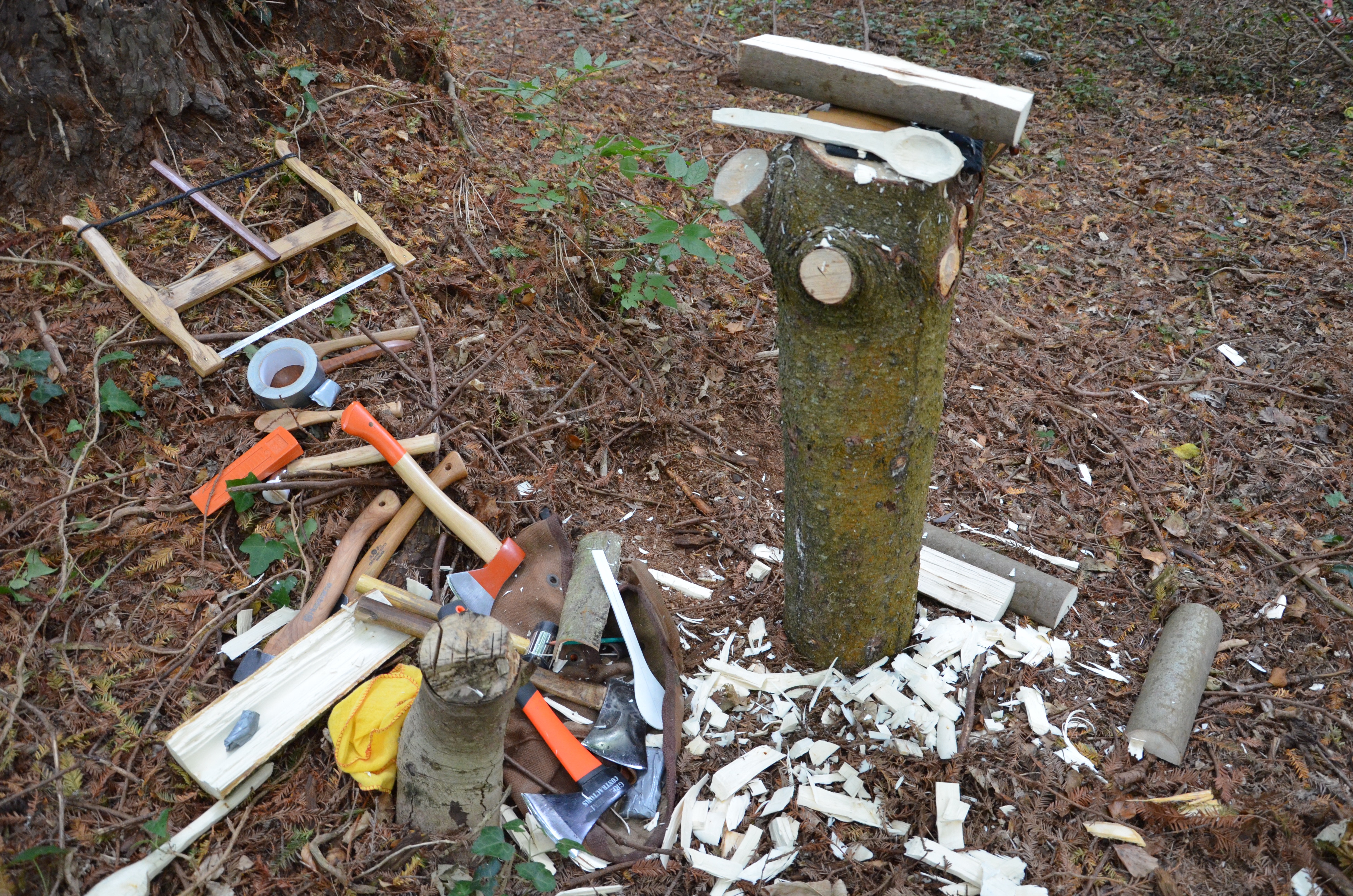 As it is with many things, actually earning your living from what you love to do is rarely that easy when working solely with your hands. Those who can work creatively this way are often asked if they will teach someone as they watch them making. The maker then convinces a following that they, you, can indeed do such a thing. In reality, they might well be able to after many months of establishing the skills needed, but it seems to me that most never give up their day job or they rely on support from a partner or spouse working in something called "the real world!" I have yet to meet more than the odd one or two that could actually make a living wage from their craft. But one thing they can do is persuade others that they did and were selling the wares they made for princely sums of money; that they were selling all that they made and that it was a good life. In actuality, selling classes was easier than spoons. Given half the chance, most people would like the challenge of making a spoon from a split limb of green wood. All they needed was an instructor. It doesn't take long to see that ten students paying £300 for a three-day green woodworking brought in some good supplementary income. It doesn't take too long to see that nigh on everyone who learns an element of any craft often becomes a teacher within their woodland sphere. Thirty years ago there was no such thing as a green woodworking course, today they are everywhere. It's is an interesting thing to chip carve a wooden spoon or a spurtle. Ask any dog where a good stick is and they will find you a dozen. Free wood is everywhere.
