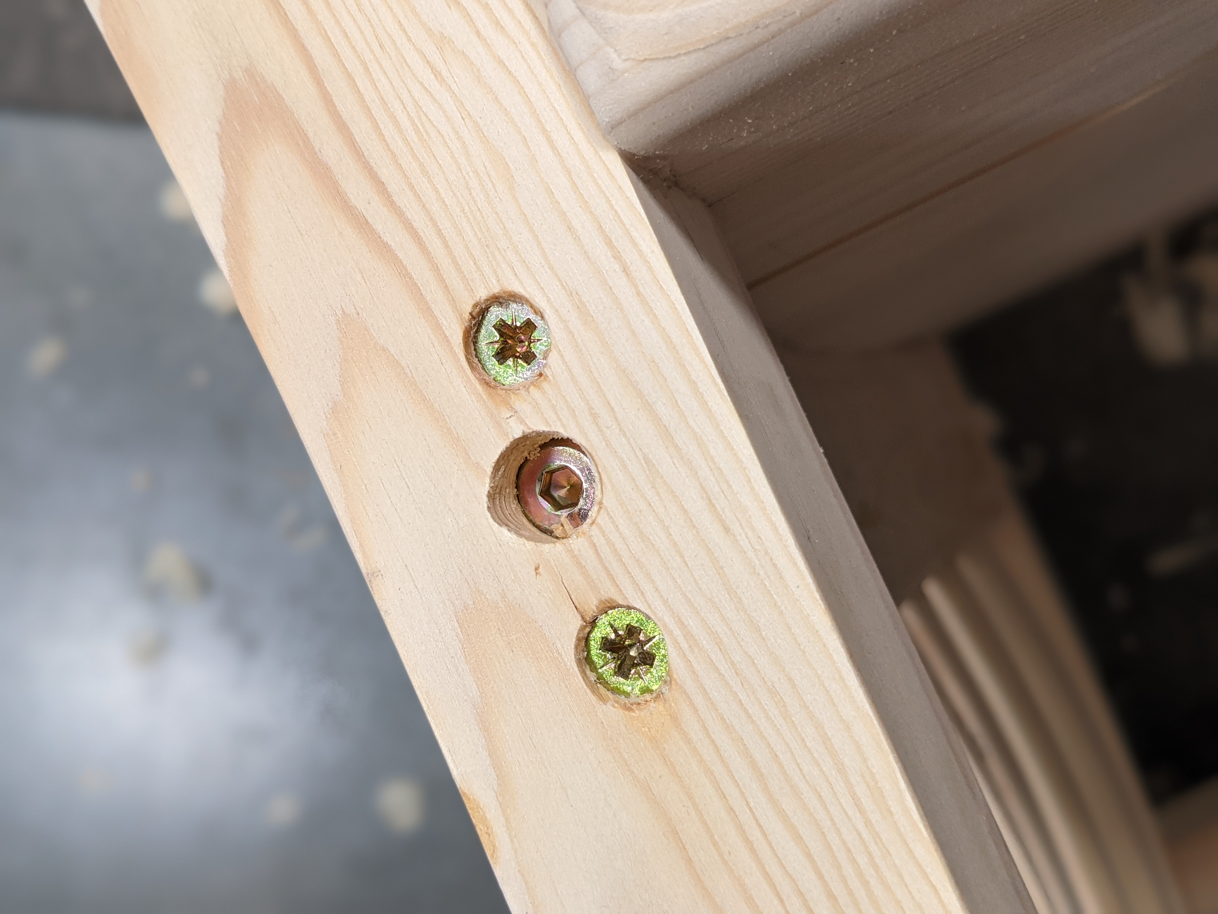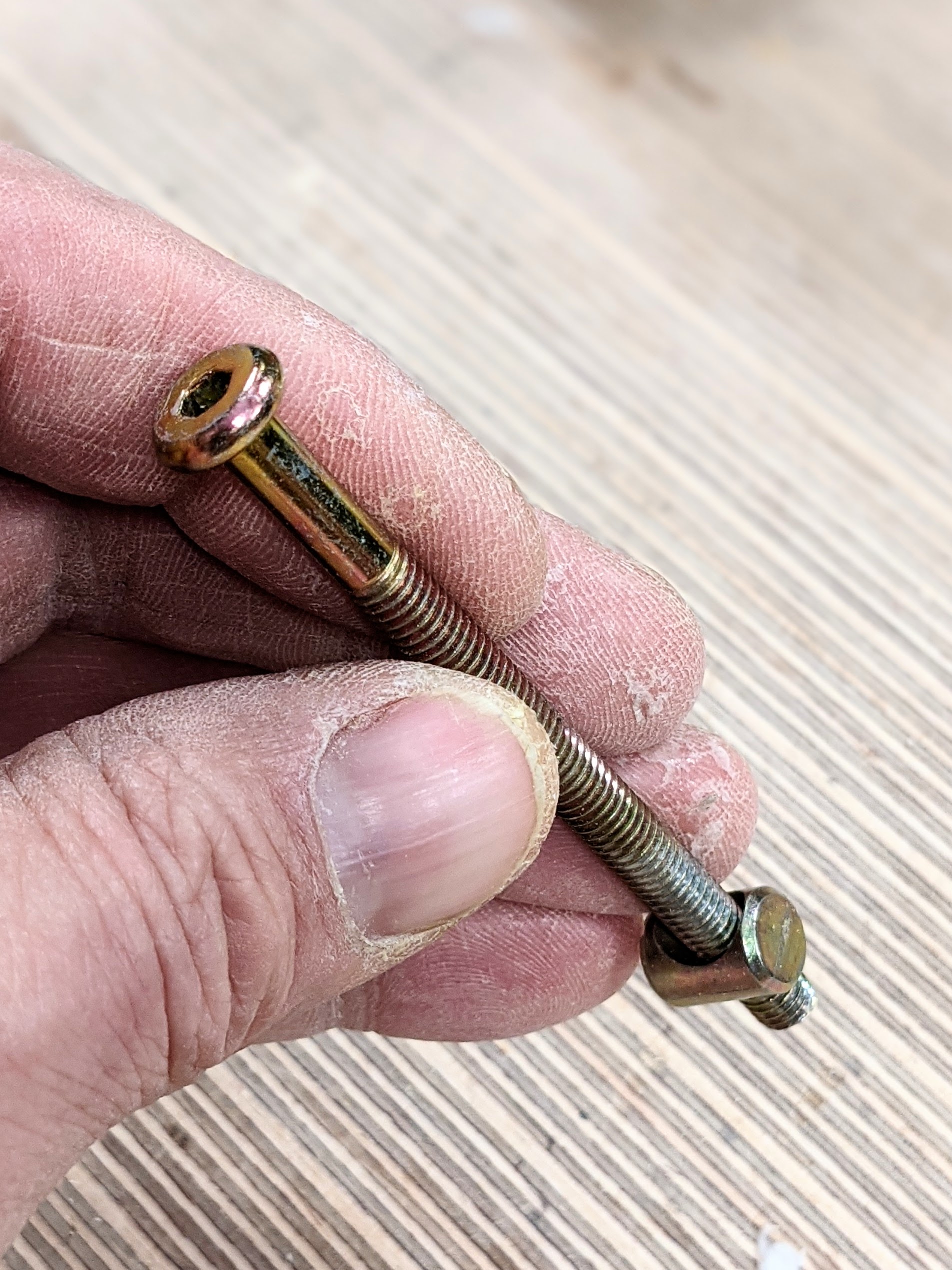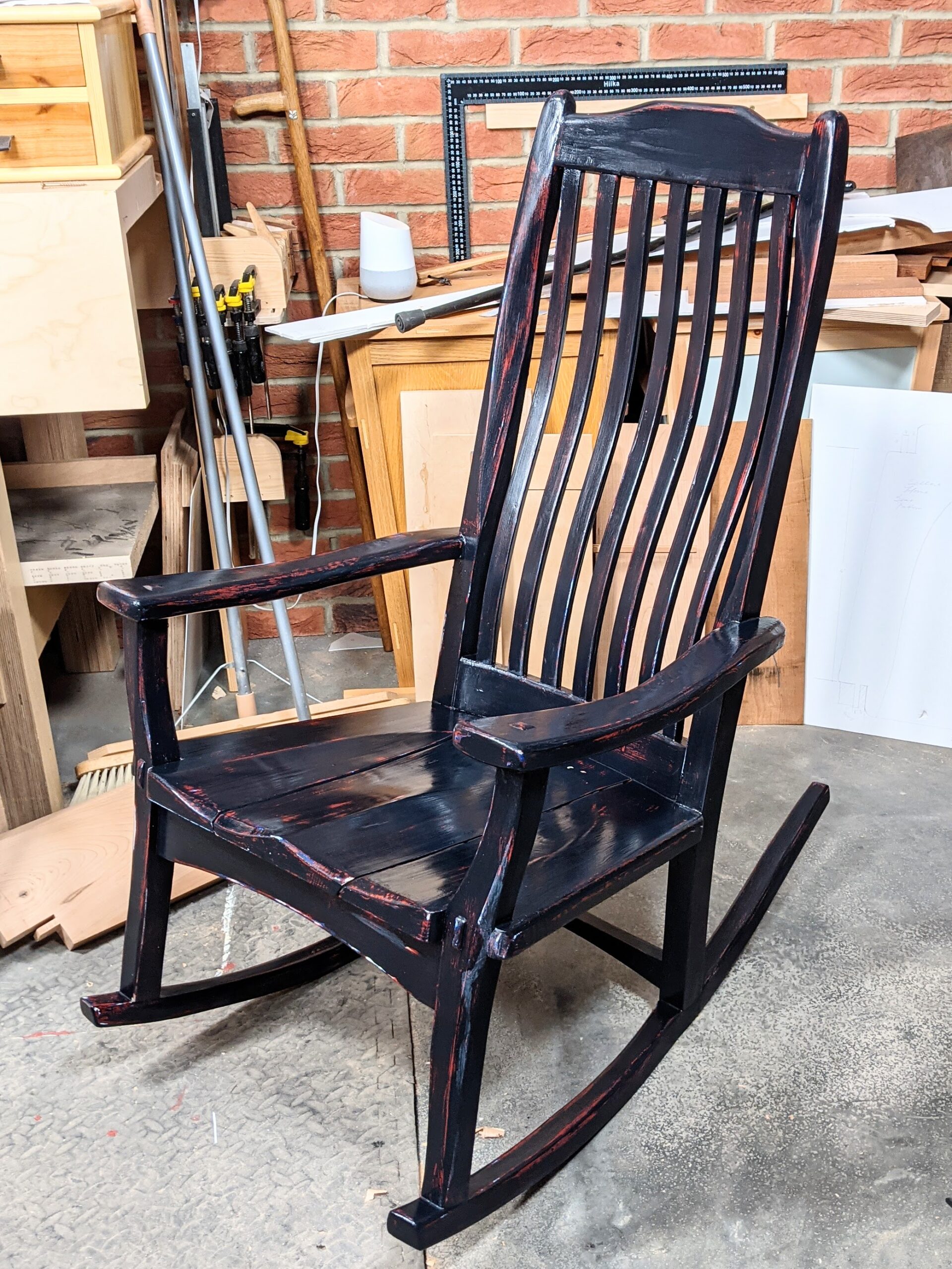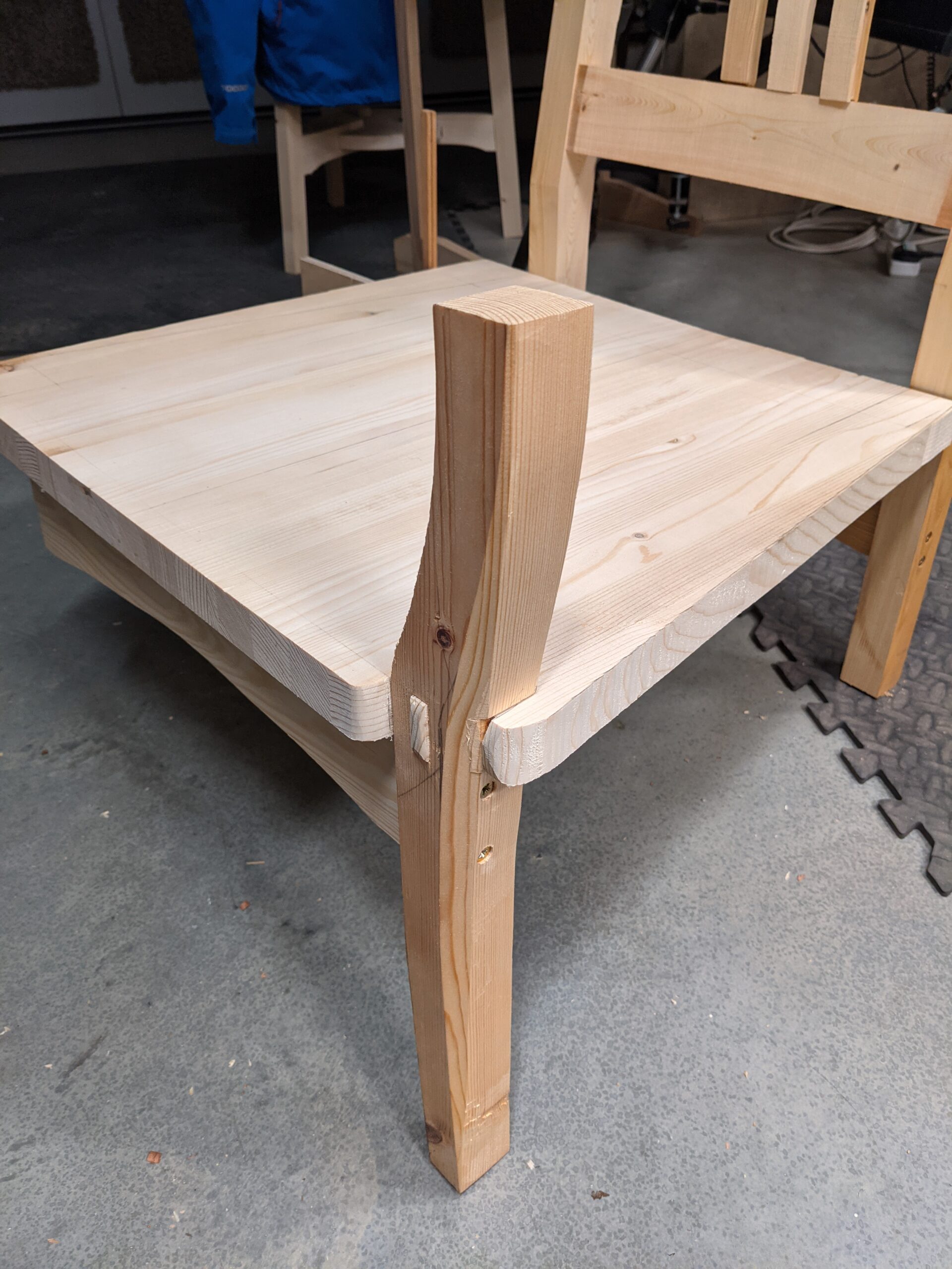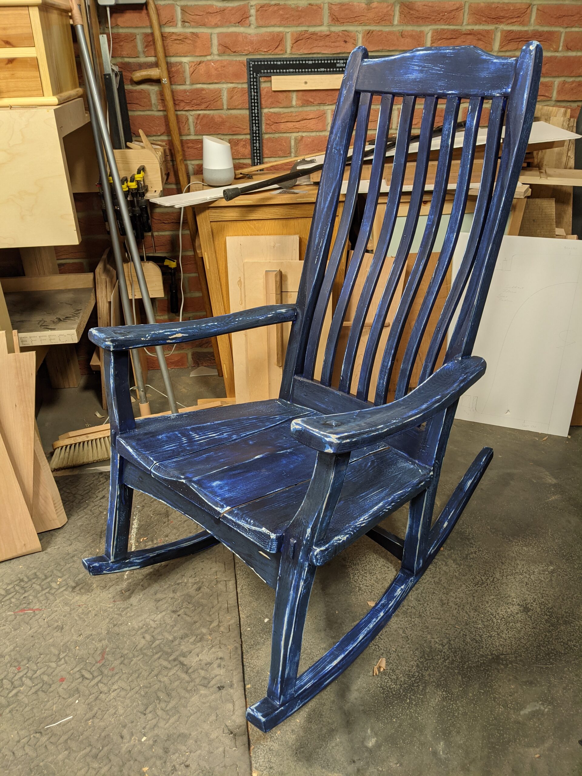 Butt joints with screws will ultimately result in joint breakdown and especially is this so in chair construction where the rigours of daily use soon takes their toll. For testing out, this is fine. I decided to finish out the chair for use and replaced or added fastenings where I could not change the butt joint to a full M&T joint, hence my decision to paint the rocker midnight blue with shine-through to reds and lighter blues. When I made my first workbench stool design I did the same. I am still using the glued-together-and-screwed version even though I never used bolt fastenings of any kind. I am surprised that it is still totally functioning with no degrade at all. All I really needed this version for was to get the shoulder-line angles together. I sit at it most days to sharpen my saws. I am not a sit-down-at-the-bench woodworker. Not yet anyway-
