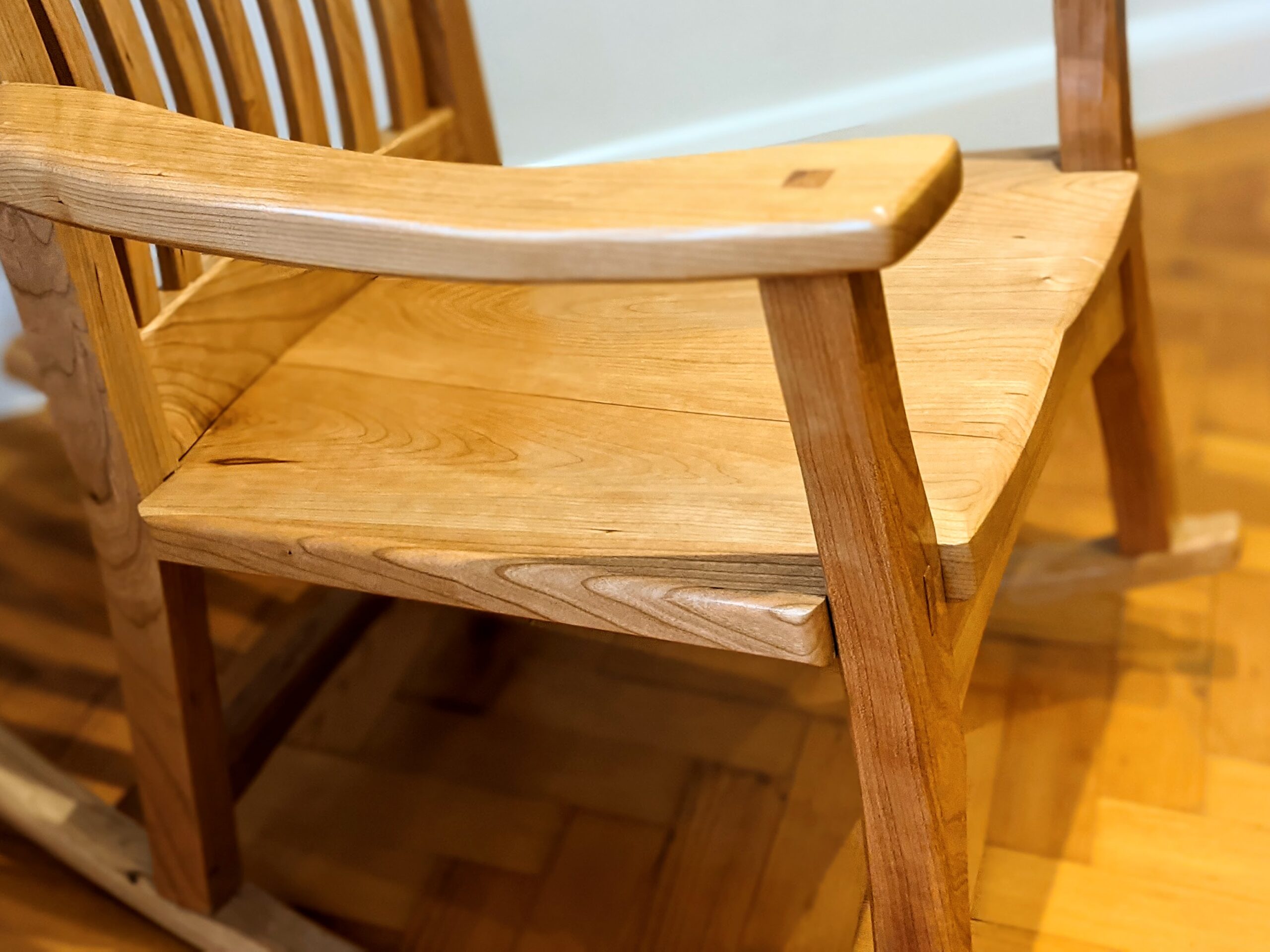 Though that first chair was more a throwaway version intended as a stepping stone, by the time I had shaped it and shaved it to represent the final version it became a working rocker I had sat in it on and off for two months before the final cherry version was pulled together. It did necessitate making many joints within its framework to test out whether this or that joint would actually work. The screws in some cases represented and replaced the glue so that I could take things apart, tweak, shape, shave and put back together for trialing. It can be wearying.