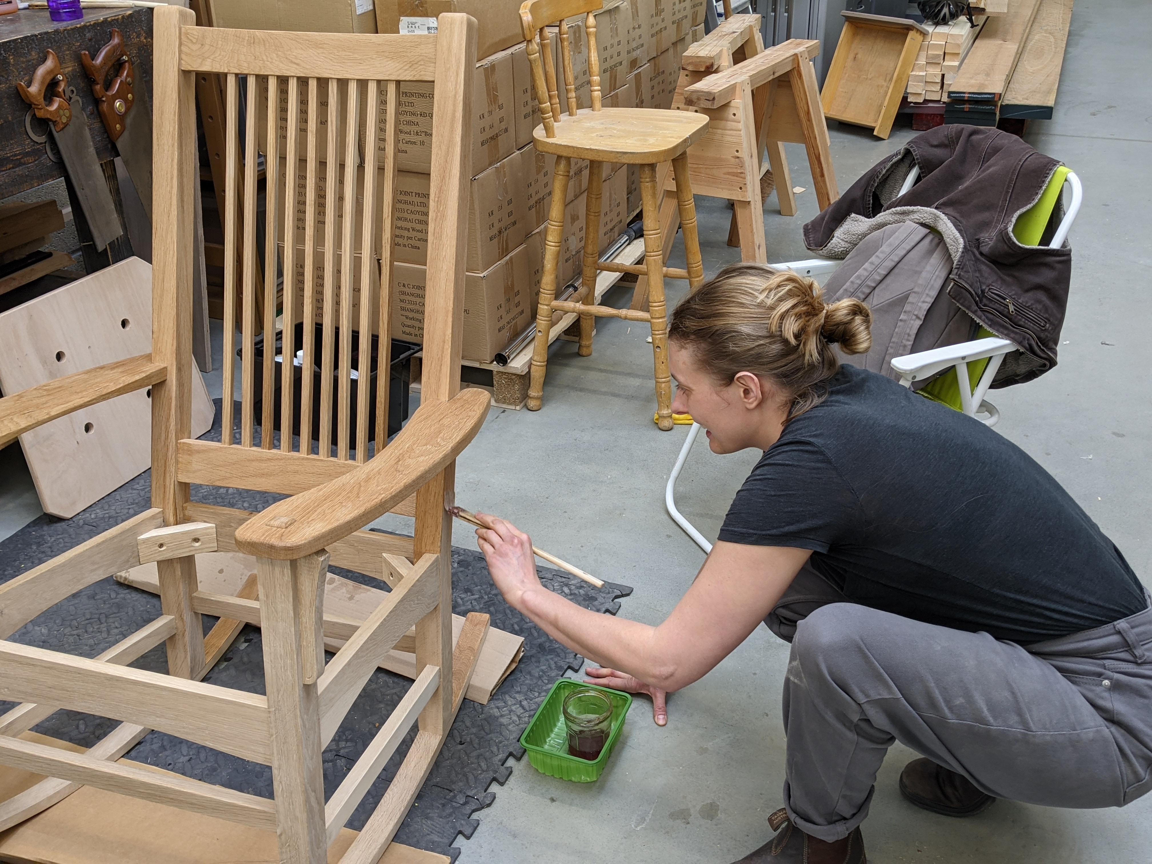 Today we all ate lunch on planks of cherry pulled atop two sawhorses. We kept our distances and the fresh, home-made soup and nut roast tasted better for being in the workshop surrounded by our life. Hannah's rocking chair now has shellac on and Jack's both its shellac and cork upholstery. He chose this as an alternative to leather while Hannah is awaiting delivery of the hide for hers.