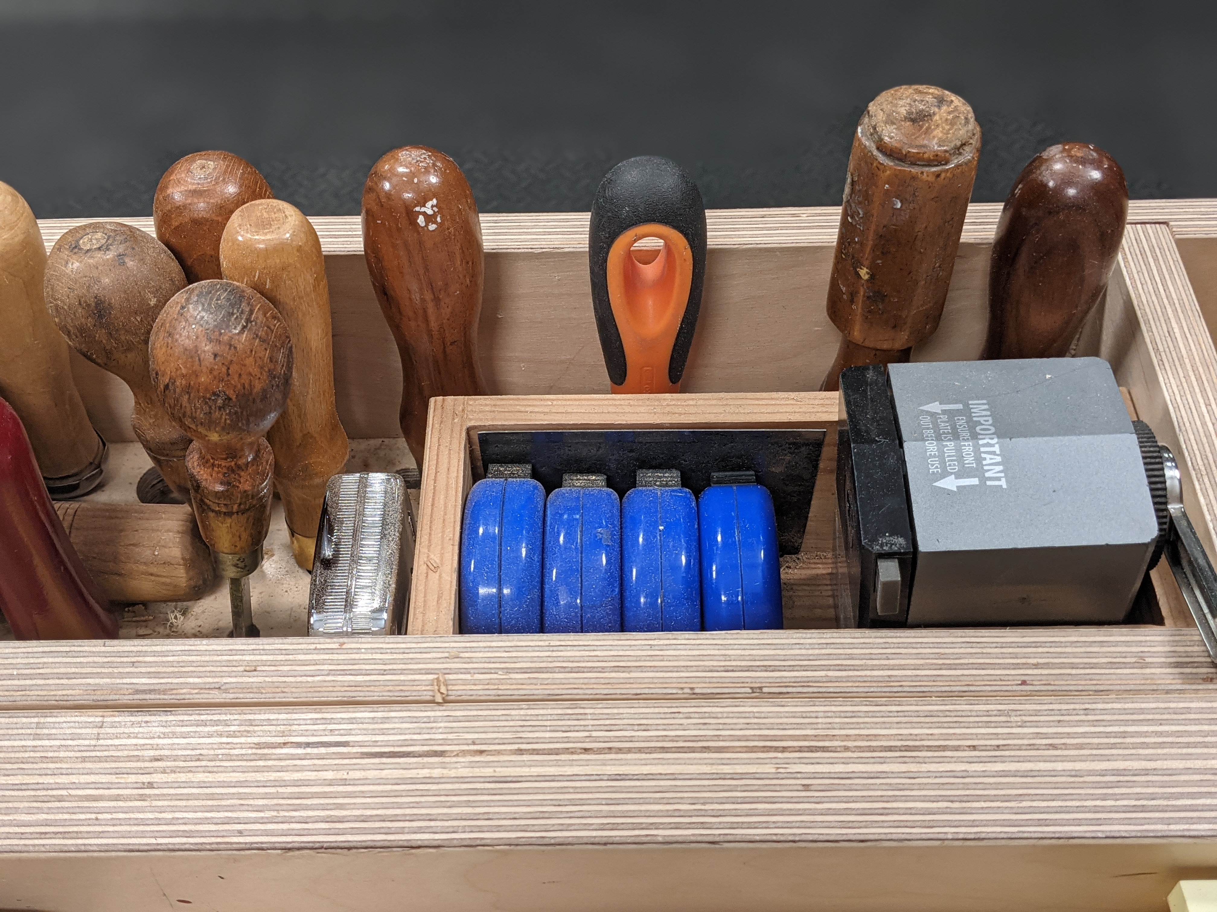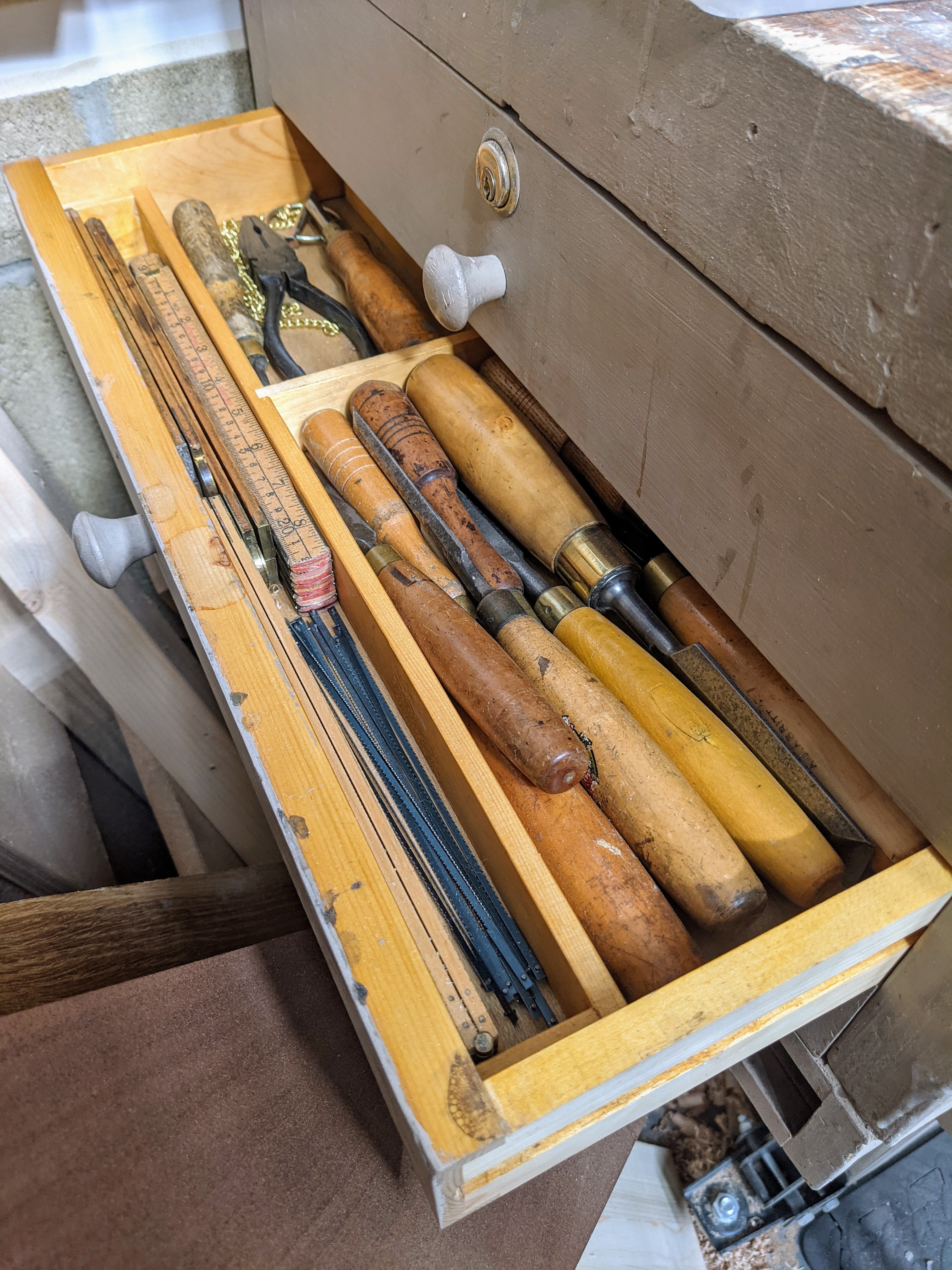When I lived in the US, I had an open-door policy. People could come into my workshop to visit and see me as I worked, together with my completed work. This was back then my bread and butter lines were small pieces that could be carried off easily. Tourism was a mainstay and a wonderful cash flow. At the ends of my workbench were two wide but not too deep tills fitted between the aprons. They carried what my apron drawer takes care of now and were packed with small tools that seemed not to fit anywhere else at all. Inevitably, to the inquisitive, not knowing what the drawer held was just too much and the drawer was regularly pulled out that one-eighth of an inch too far. Six inches is not very deep for a drawer, and all of my precious tools were spewed out all over the shop floor. The problem was that that was not the only problem. Getting them back to my comfort level might take a week or two. Red-faced, the perpetrator held up their hands as guilt crossed their face. My comfort and my control were both gone.