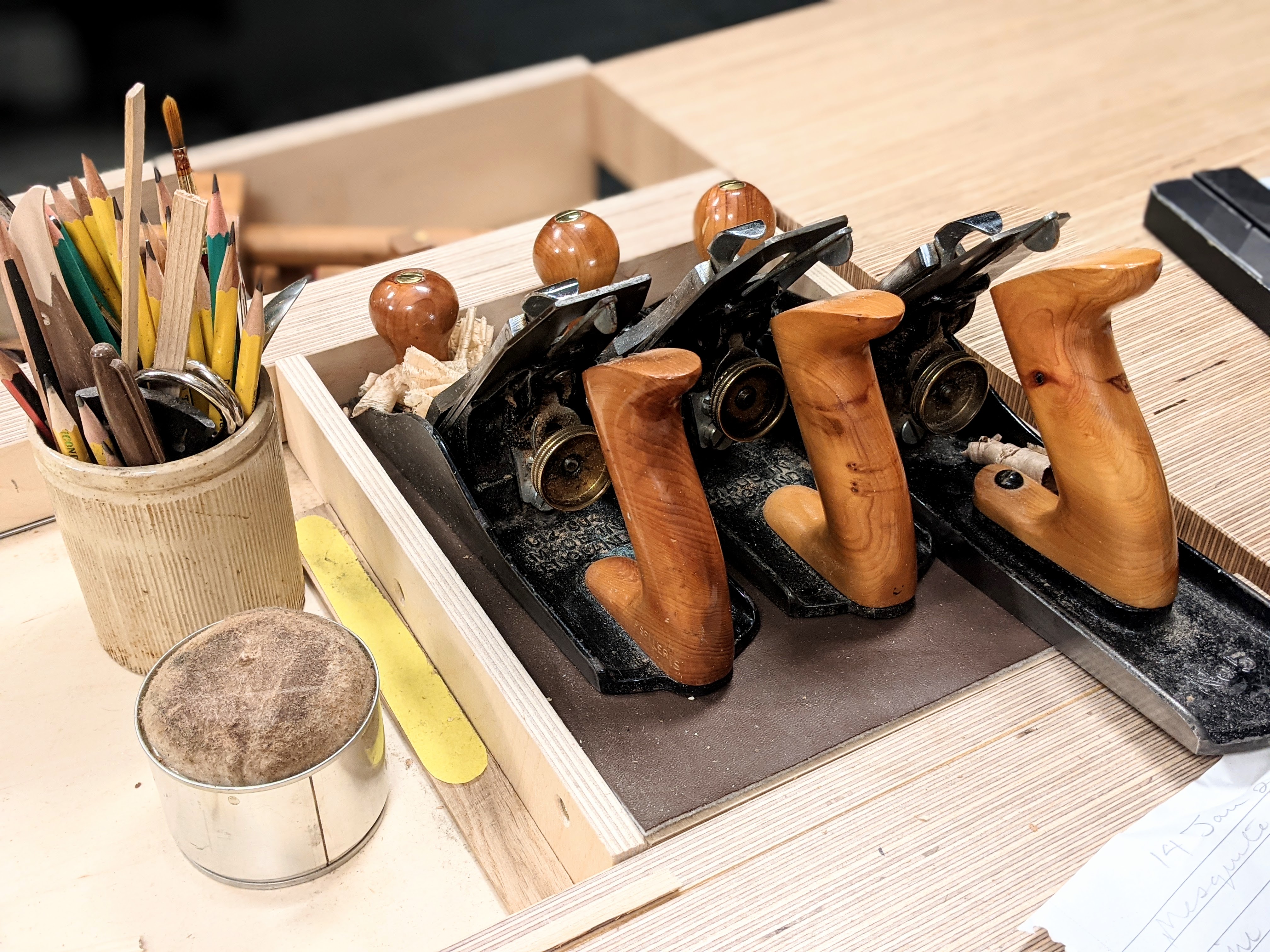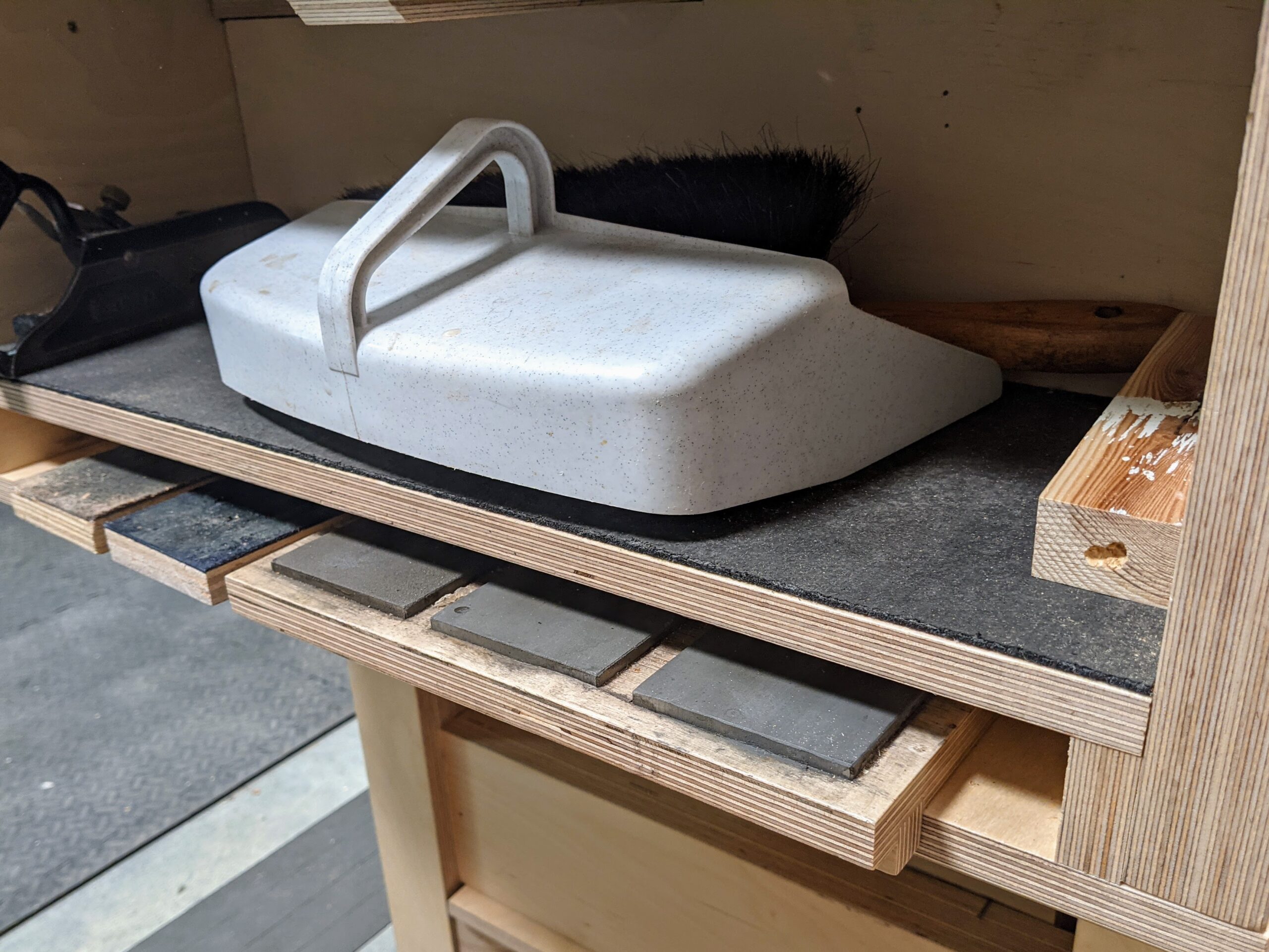 Today, my tools are as well placed as it will get for me. I doubt that I will change much now. I can pull any of my three most used planes to my hand and switch them out in a split second and so too my saws, chisels, dustpan and brush, sharpening plates etc. Comfort and control all in one.