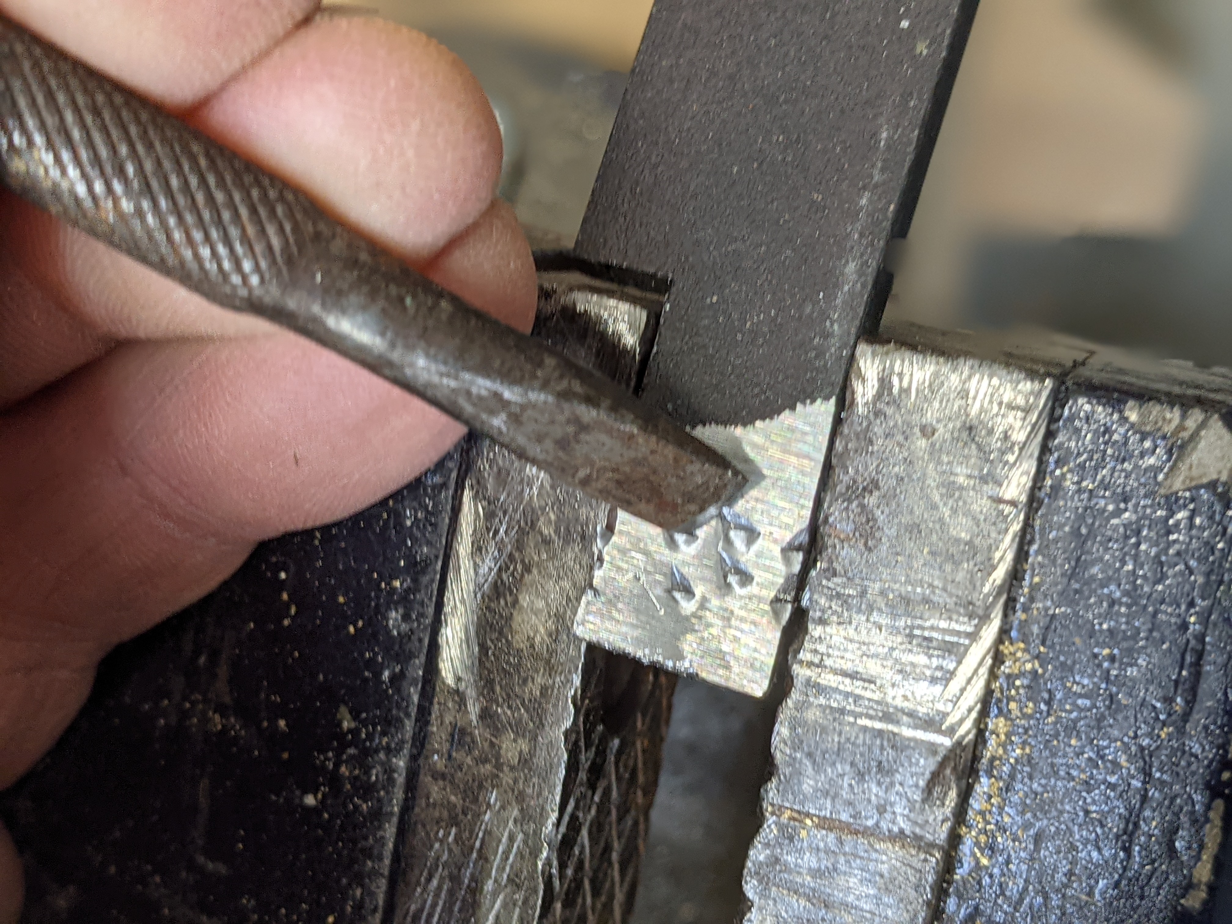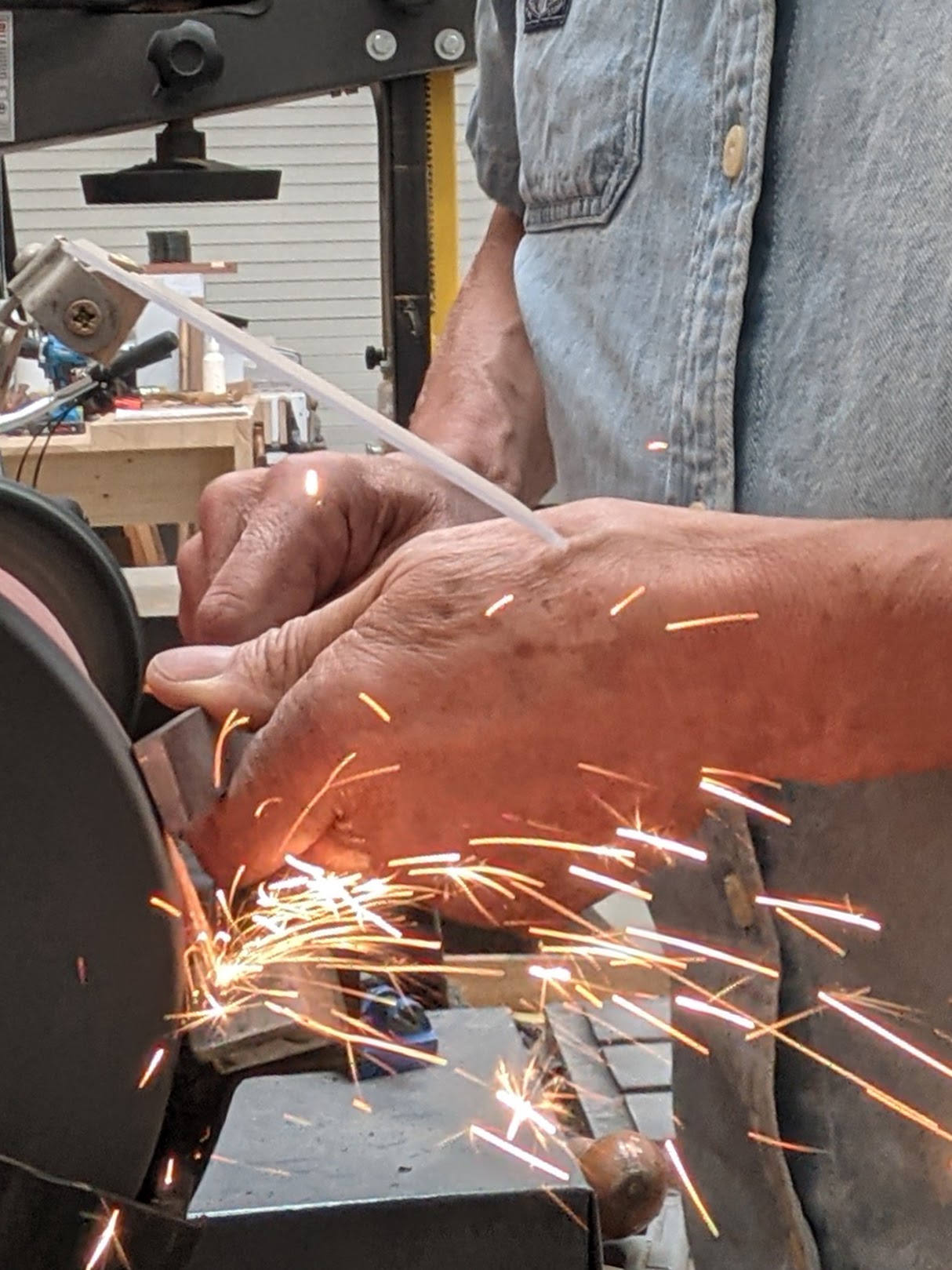 Take a piece of mild steel and grind a shallow wedge. My steel is 1/8" (4mm) thick. Best to do it on the length of steel for safe handling.