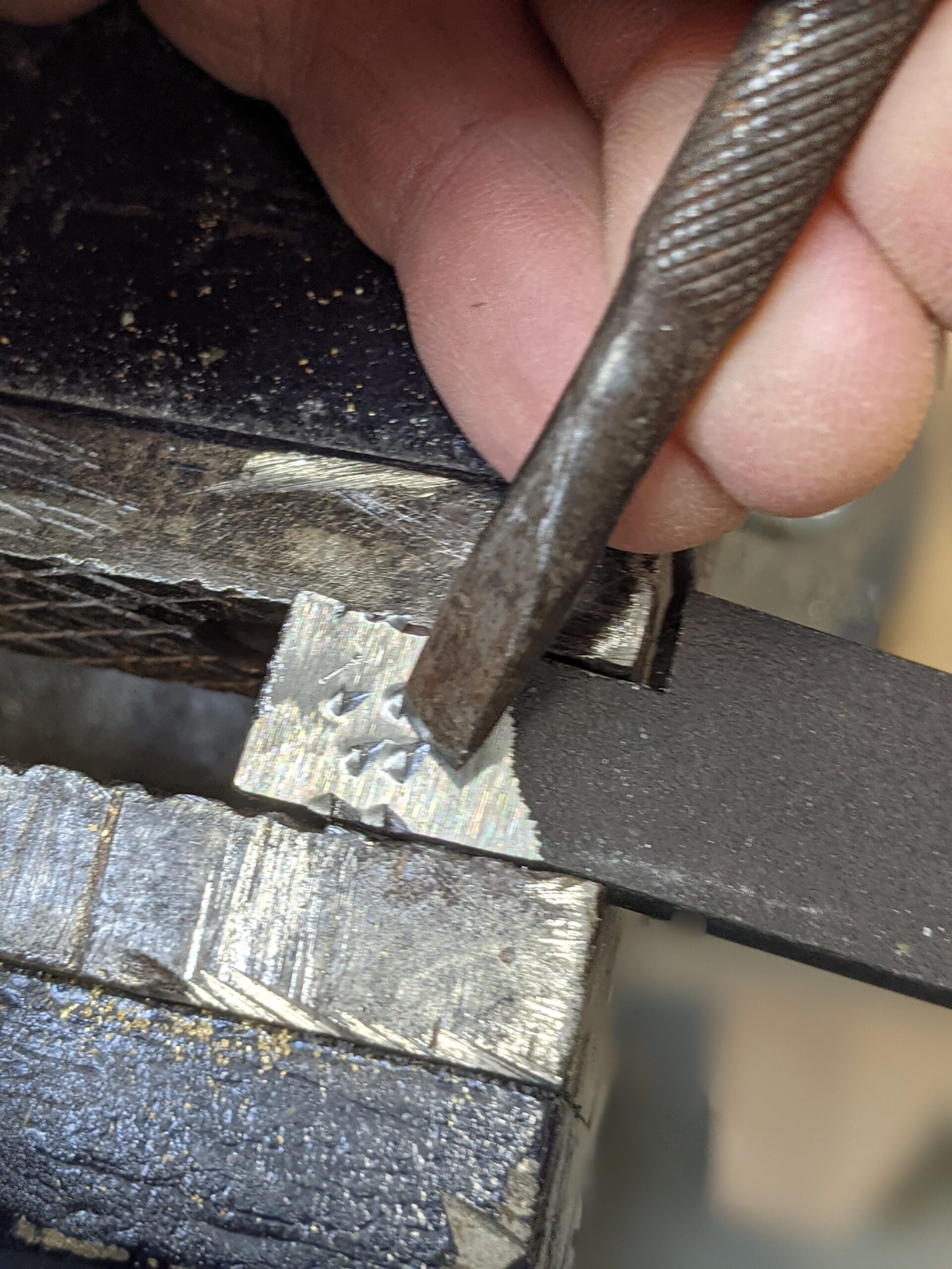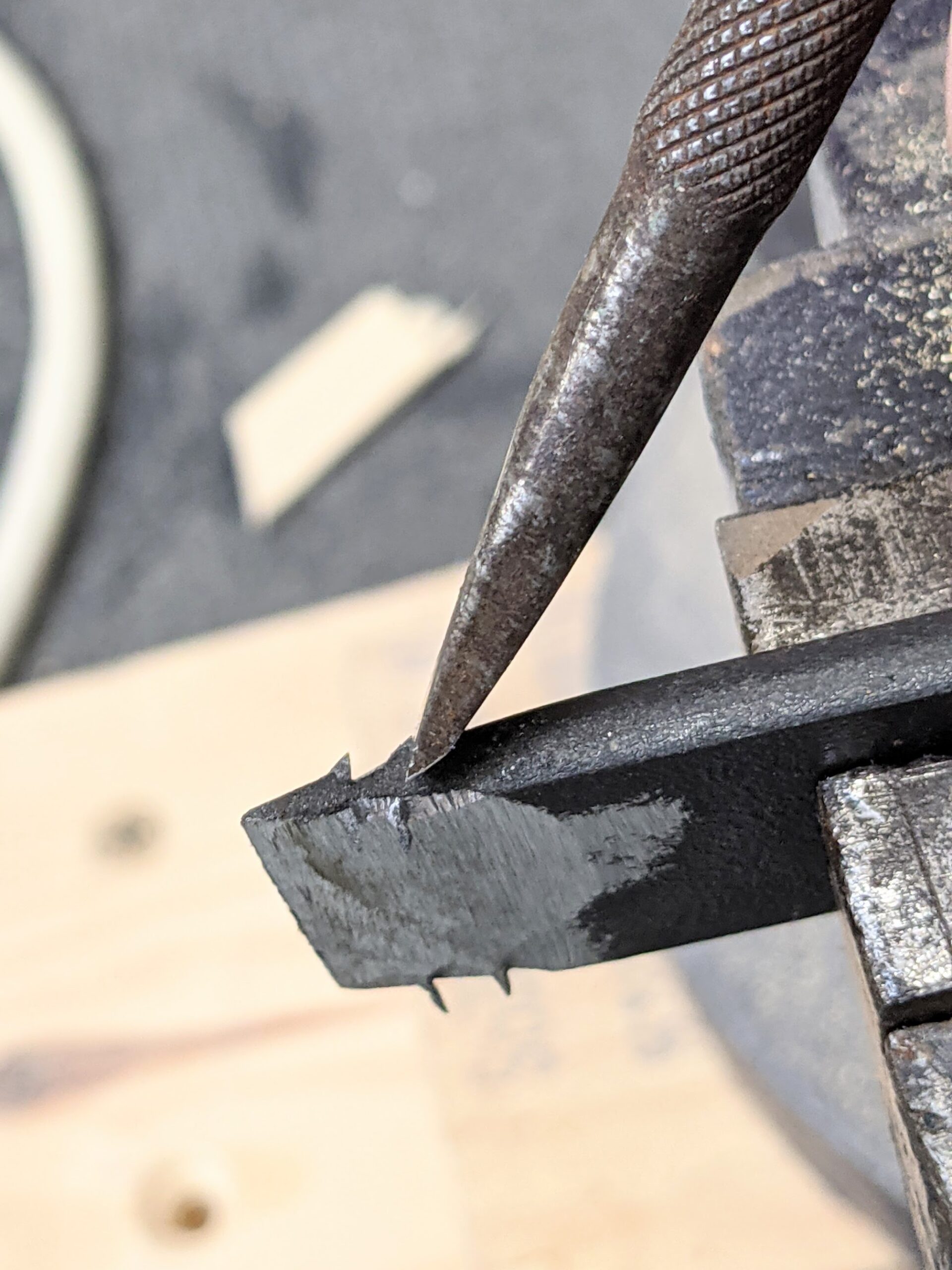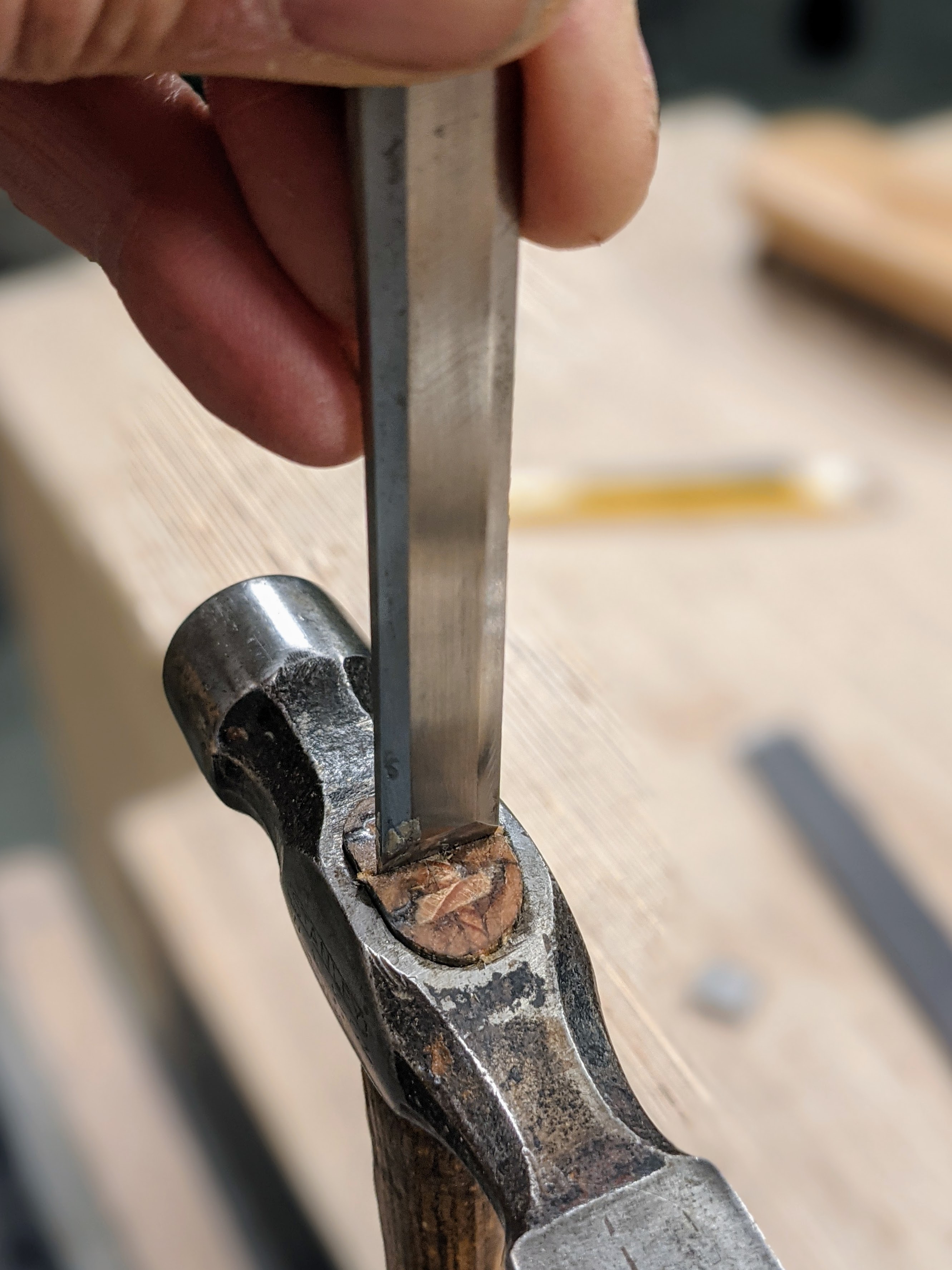 Use the corner of the cold chisel to make more barbs on each wide face of the wedge. As the wedge is driven in, the wood yields to the one-way barbs and beds into the wood.
