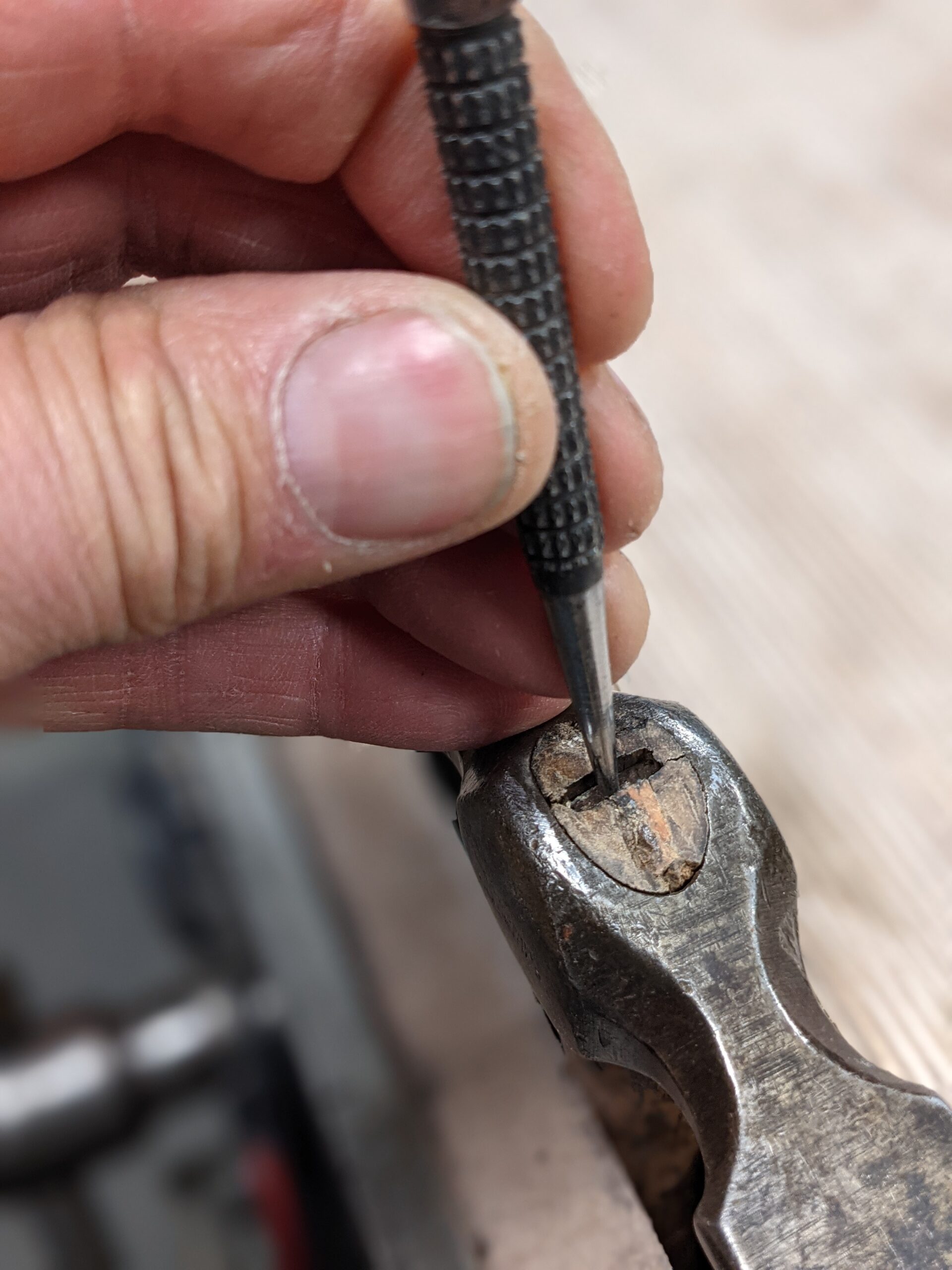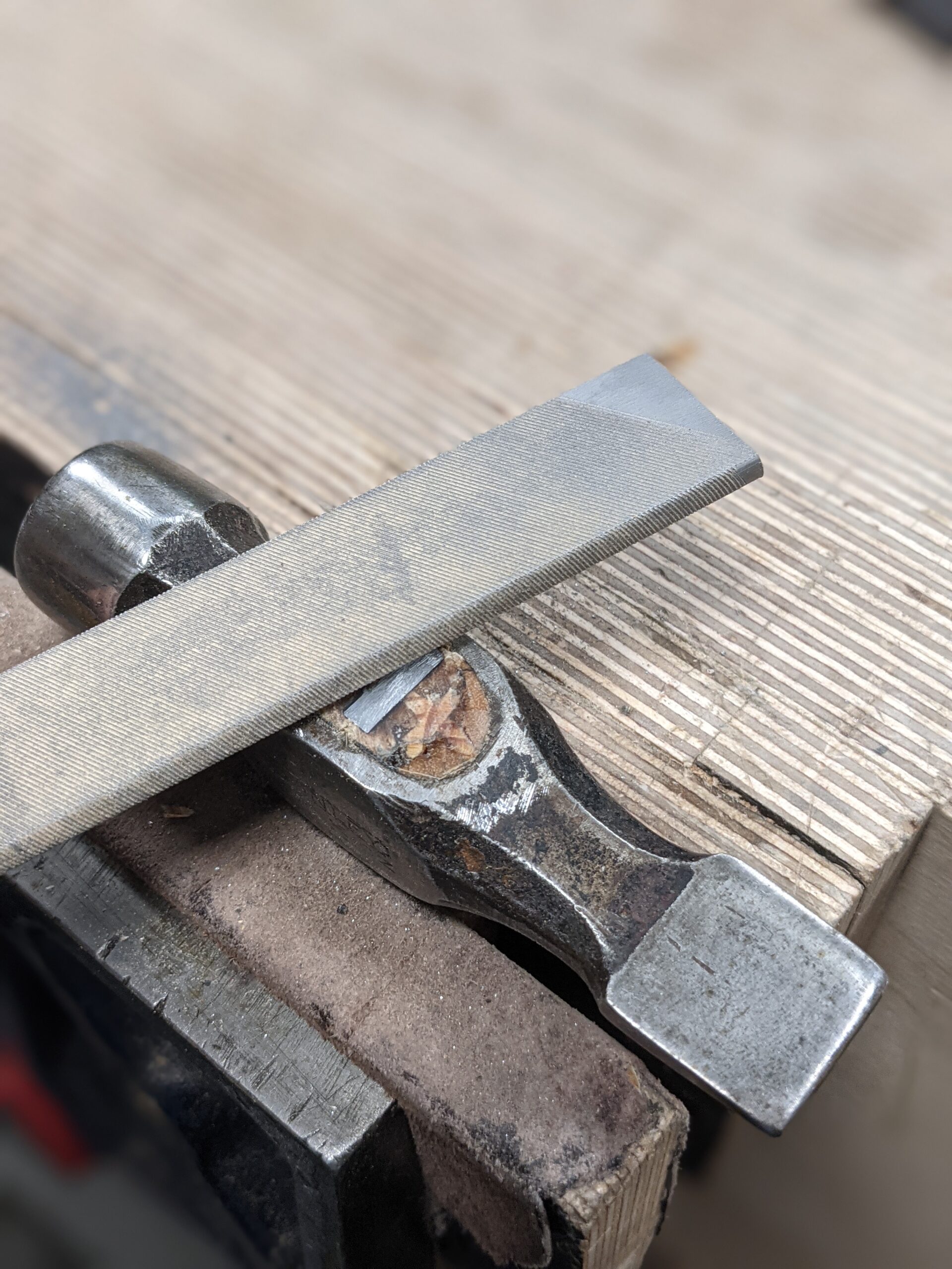 Within a few weeks of my arriving in Texas and my tools being in dark green storage containers from a sea voyage on the sunny docks for a few weeks, the heads of my hammers and axes arrived loose. I did not have any steel wedges for my Warrington version so I used wooden wedges and surprisingly this worked well for my 23-year life living in or near the Texas Hill country in central to south Texas. Since I arrived back in the UK the head has come loose. With steel wedges, this is usually just a question of striking the end of the hammer shaft with another hammer to shock the head down onto the bulb of the shaft, the part just behind the inside of the hammer head. Once shocked on, the steel wedges can be driven deeper into the eye of the hammer head to spread the wood intro its dovetailed profile with a nail punch (set US).