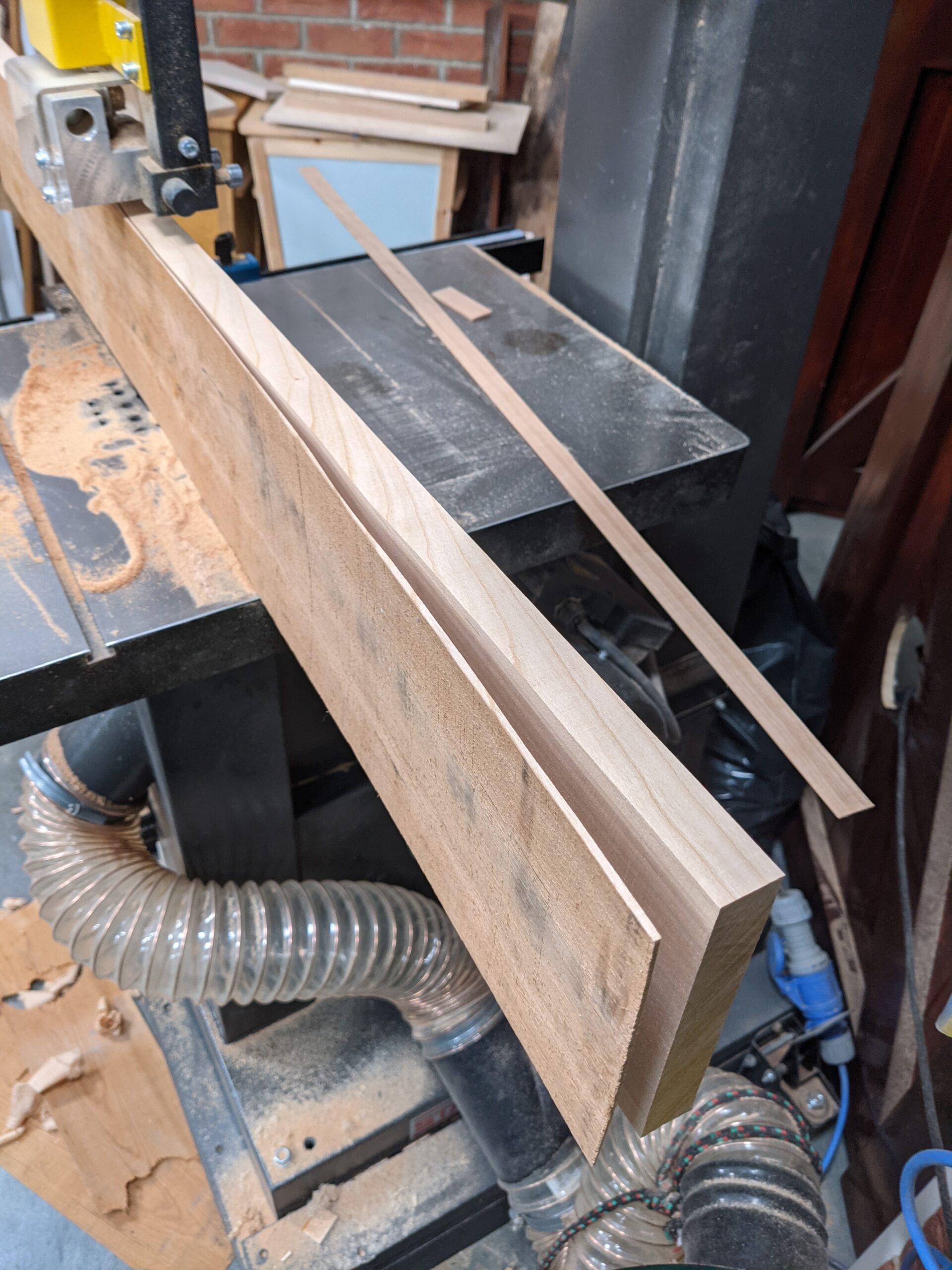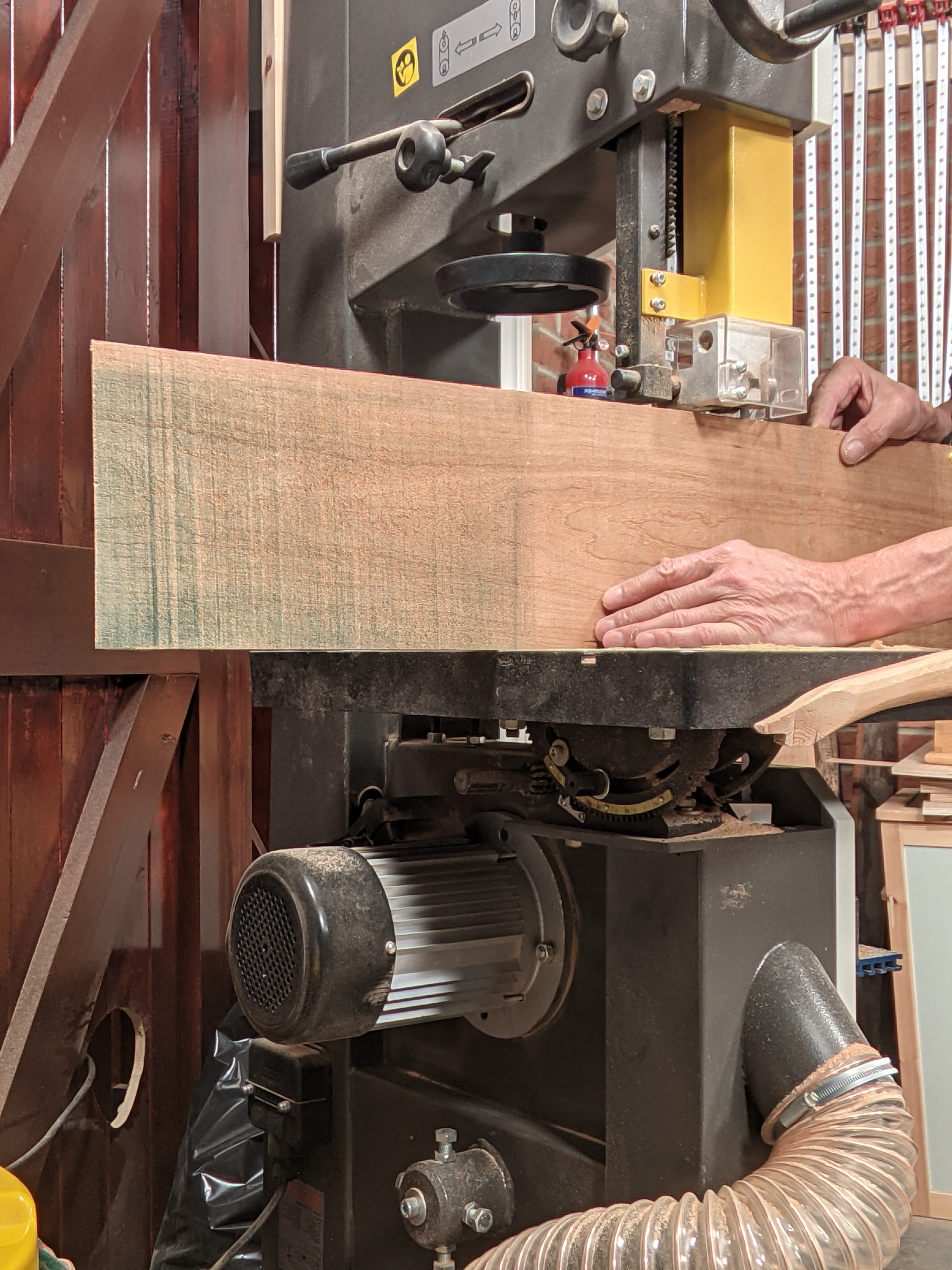 Today, the only machine I really use is my bandsaw. I also have a drill press that I have thought of taking out to free up valuable garage space for my moving around and not to install another machine, I use it so minimally. It's handy for drilling perpendicular holes, making a hundred wooden plugs and such, but is the handiness worth the loss of space it takes? I don't think so. On the other hand, the bandsaw makes perfect sense to me. More than any other machine. These last few years, since setting up the garage workspace and preparing for the sellershome.com series of pieces, I have relied mostly on my bandsaw only. I have gained weight, but not in the way you might feel negative about. My weight gain has been in added muscle mainly. My chest, legs and upper body have become more muscular because I am lifting beams and heavy boards to crosscut and prepare for the bandsaw and then used the bandsaw for roughing down large stock to workable sizes. Some sections with wane on have been 24" wide, 2-3" thick and 10 feet long. All of my work in this area is on my own. I think that this is especially important for those following and engaging with the sellershome pieces. I think I need to show what it really takes to convert the wood in safe ways. So no one supports the wood for me or lifts it with me. I use leverage and a moving table to place the wood near to alignment and then I remove any excesses first. Excesses means rotten sections, splits, wane and so on. If it is crosscutting, I use a handsaw only. This is very simple and effective, always fast and always a safe, no-nonsense way with sawdust that drops to the floor and doesn't puther into my atmosphere.