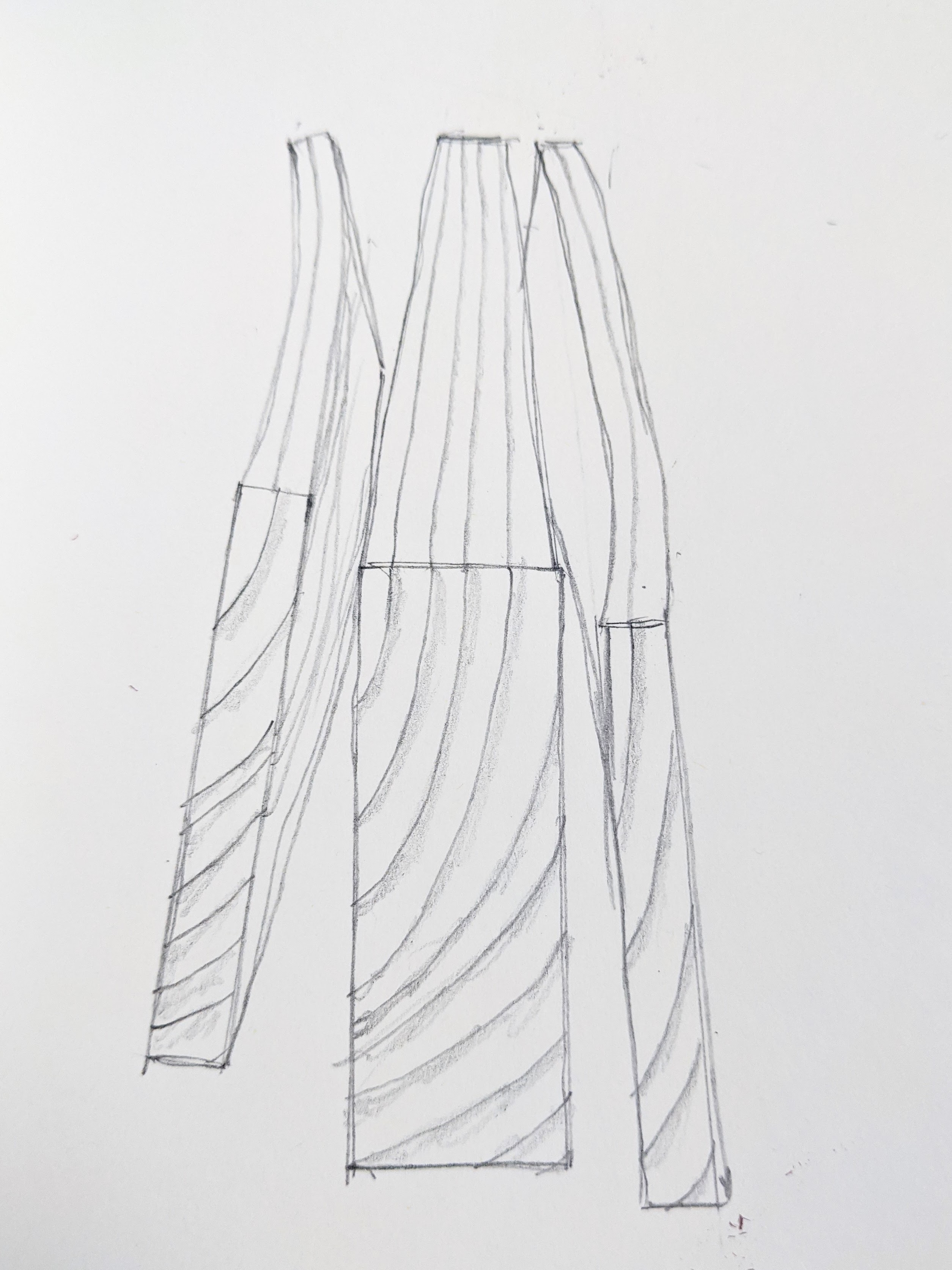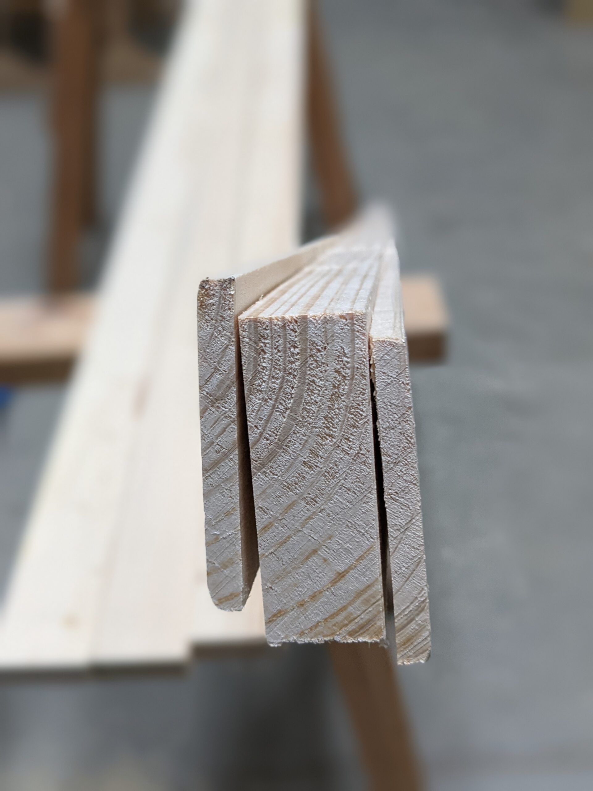 This picture below is a good example to see how the wood pulls away or curves in at the exit side of the blade. In this case, you will see that the wood to the outer left side is twisting as stress is relieved by the as-yet incomplete ripcut of the bandsaw. This relieving in a sense destresses the wood so although we see twist, cup and bow as distortions in the wood, they are the actual relaxed condition. In this case, we can see the twist taking place and also the bow forming, so by the time the piece is cut away, the remaining pieces will all have distorted to some degree.