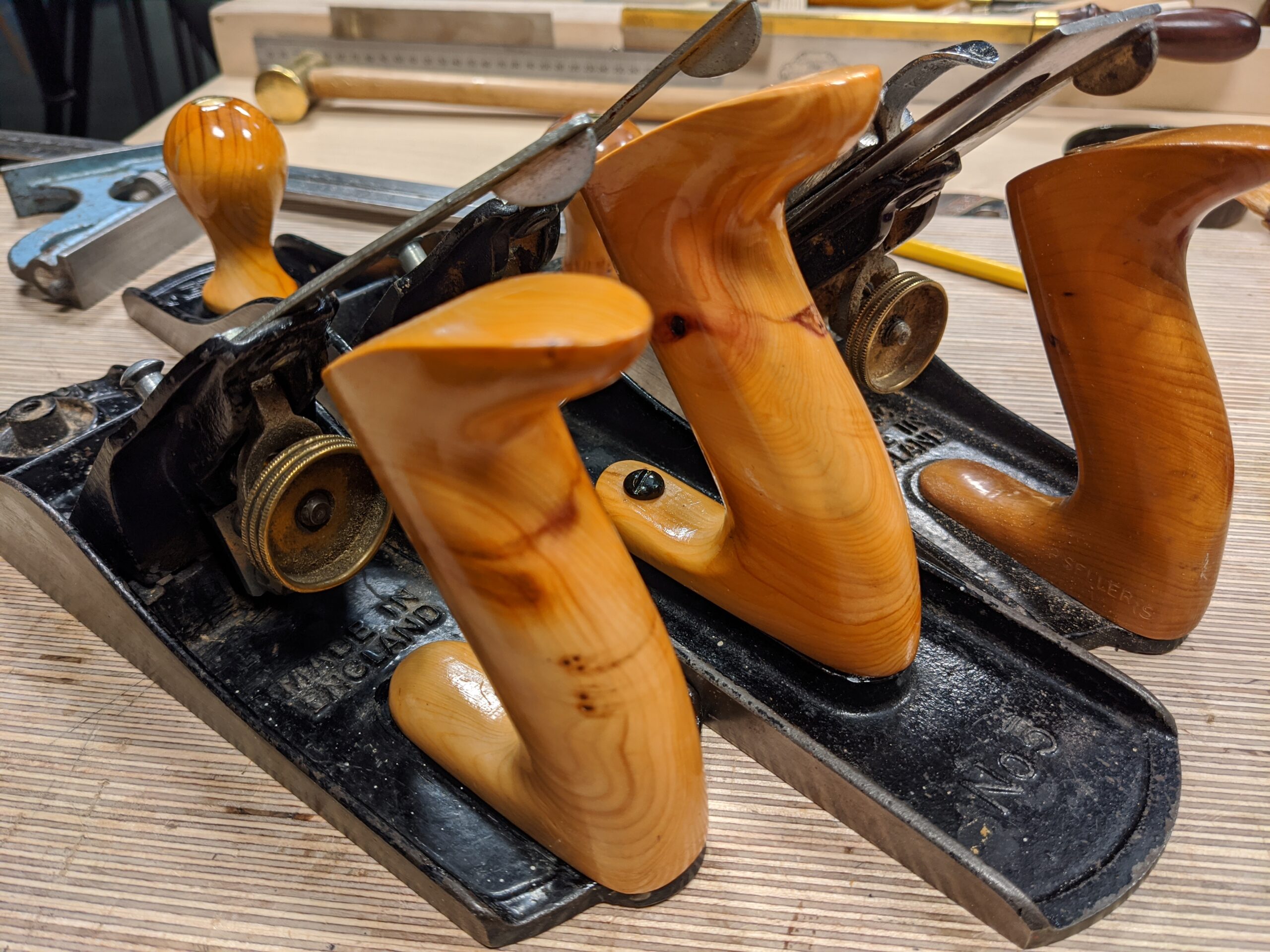 It's a strange thing that both handles fit my hand like a well-worn glove, but the greater significance for me is that the feel tells me exactly which plane I have in my hand as soon as my hand slides around the handle, something I never could tell with plastic or the mass-made wooden original plane handles. Does such a thing really matter? Well, to me, here at the bench, yes, it does! These two planes have two purposes though they both plane wood. I switch between the two according to task and by this, I have defined what they do. The most customised of the two is my Stanley #4 smoothing plane. By that, I mean that I spent more time on shaping the handle and fitting it both to my hands and to the tasks I expect of it. It is the most perfect fit with its finely shaped tote and knob. On this plane, the tote is refined and defined to flip and flex in use. Its slender profile is comfortable to me and I can and do work with it all day long. The second Stanley #4 is the one I use as a scrub plane and the main difference is that I have refined the whole plane by changes around the cap iron and the cutting iron which is now shaped with a radius to remove rough or heavy material from a surface more quickly. You can watch the video on woodworking masterclasses for free here and also get the downloadable pdf for the handle shape and also for on YT here.