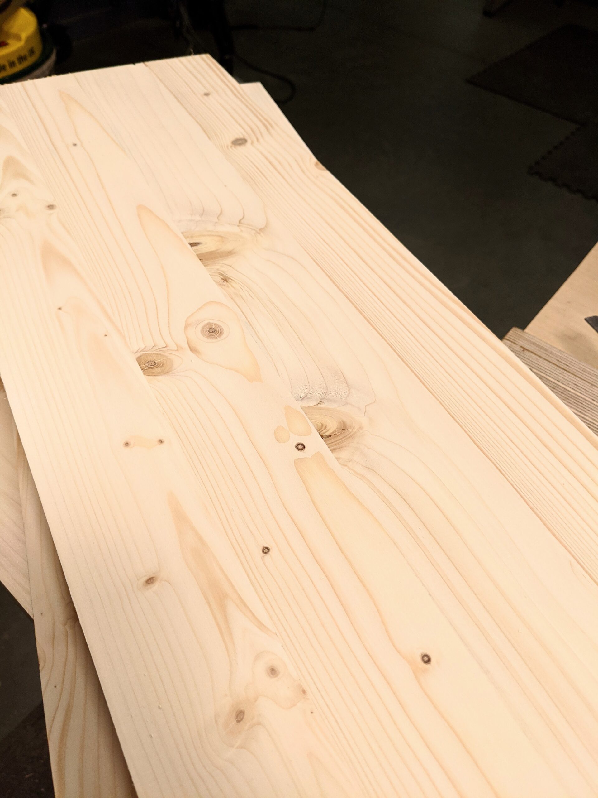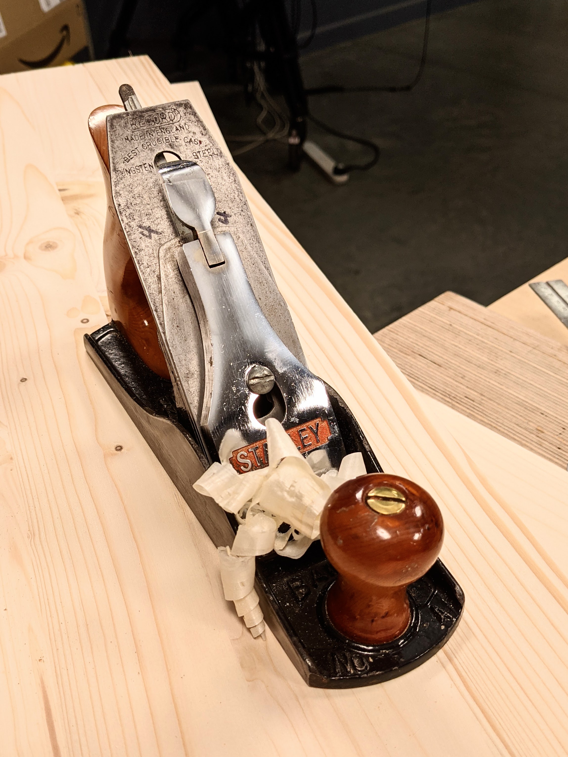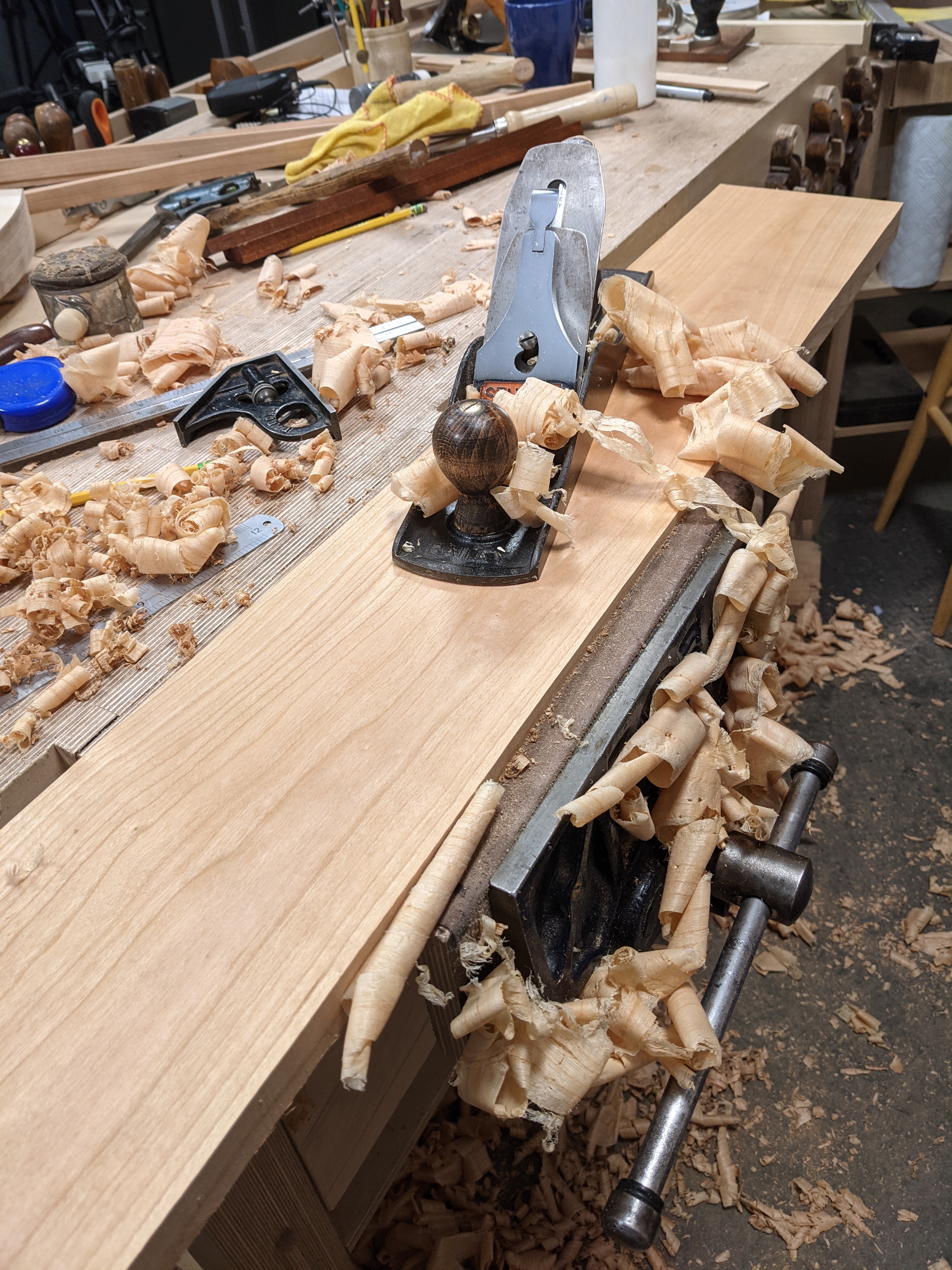Hardwoods like cherry and oak are very nice to work because of their consistency. Spruce studs are a very uniquely different experience. Those hard knots that jar your strokes every few seconds can be more than just a distraction. But I got there by perseverance and fortitude and I wanted the workout anyway, no matter what. So, I ripped my studs down to 15/16" on the bandsaw and then I edge-jointed all the joint lines using both a #4 and a #5 or #5 1/2. After glue-up, I surfaced all the 10" wide, 8' long boards to level any discrepancies to both sides. Three large bin bags were filled with shavings at the end of the day and there, centre stage, sat my #4. I sharpened all three planes between four and five times throughout the day; that's more workout working that I did not mind at all.