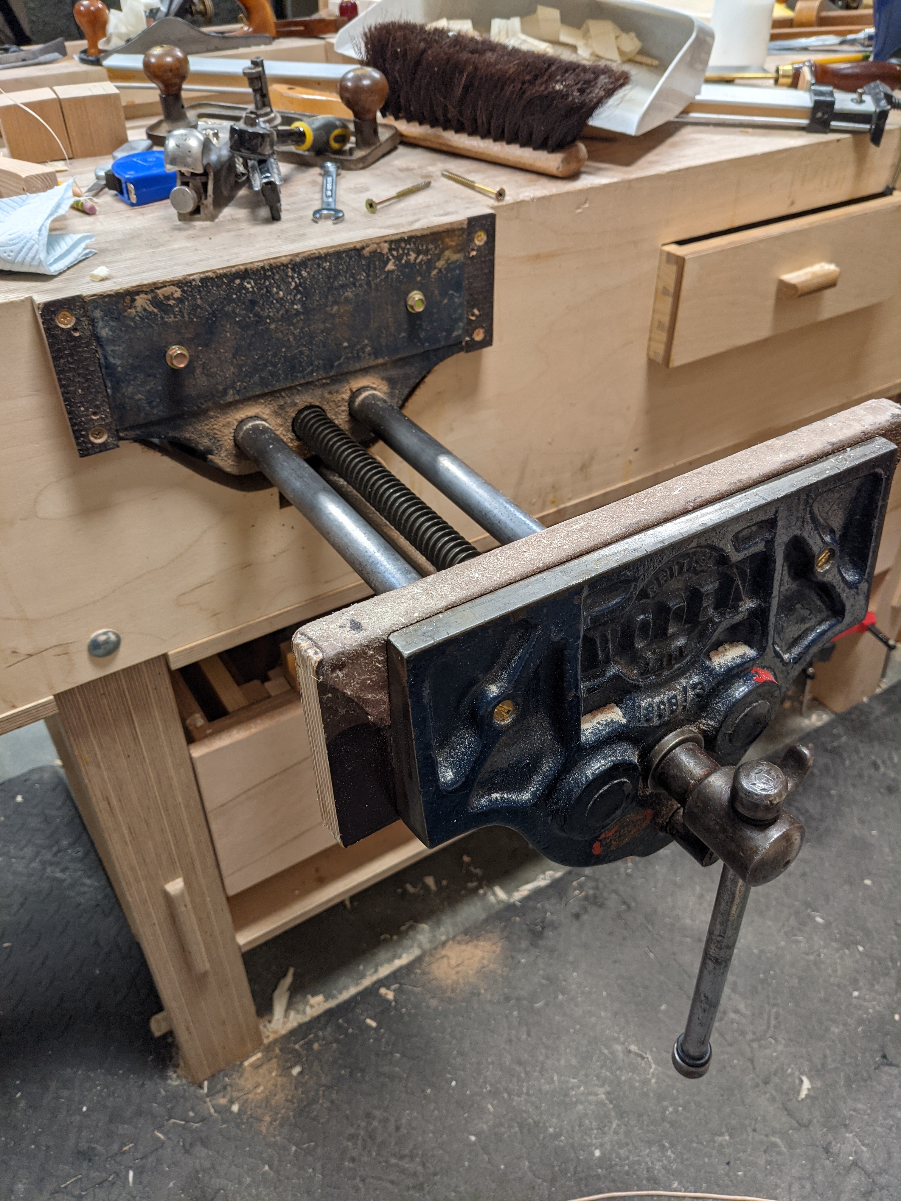 Yesterday I pensioned off my bench vise, a Woden I found secondhand on eBay that was already fully restored. My old vise was showing signs of wear and as with my other tools I did not want to see it breakdown altogether. `i will install it in another, less used workbench. The new-to-me new one will take a little breaking in. It is quite stiff as it is a little-used one and everything is still quite tight. This is a celebration for me. Paying £130 with shipping for so fine a quality vise is a small price to pay. I doubt that there is a maker worldwide that matches such quality anymore. Sadly things have deteriorated in our exporting manufacture to other continents so that we can have cheap good and cleaner local air. A vise I once bought from an importer from Asia made a comparable vise. It was top-notch. But, well, the USA wanted it cheaper so the exporting manufacturer went back to the design and created a slightly lesser version within the brief for less cost. The new version rattled in the ways and the threads skipped when winding. Still, it was, well, OK. But guess what, the chain store of woodworking retail wanted it cheaper again so the maker went back to the drawing board and cheapened production all the more. Was this so that the franchise supplier stores could pass on the savings? Oh, that wasn't the plan at all. No, no, no! The price stayed the same throughout the decade. We cannot blame the exporters for cutting prices and quality. It's the importers who know nothing about craft, art and the art of making anything but money!