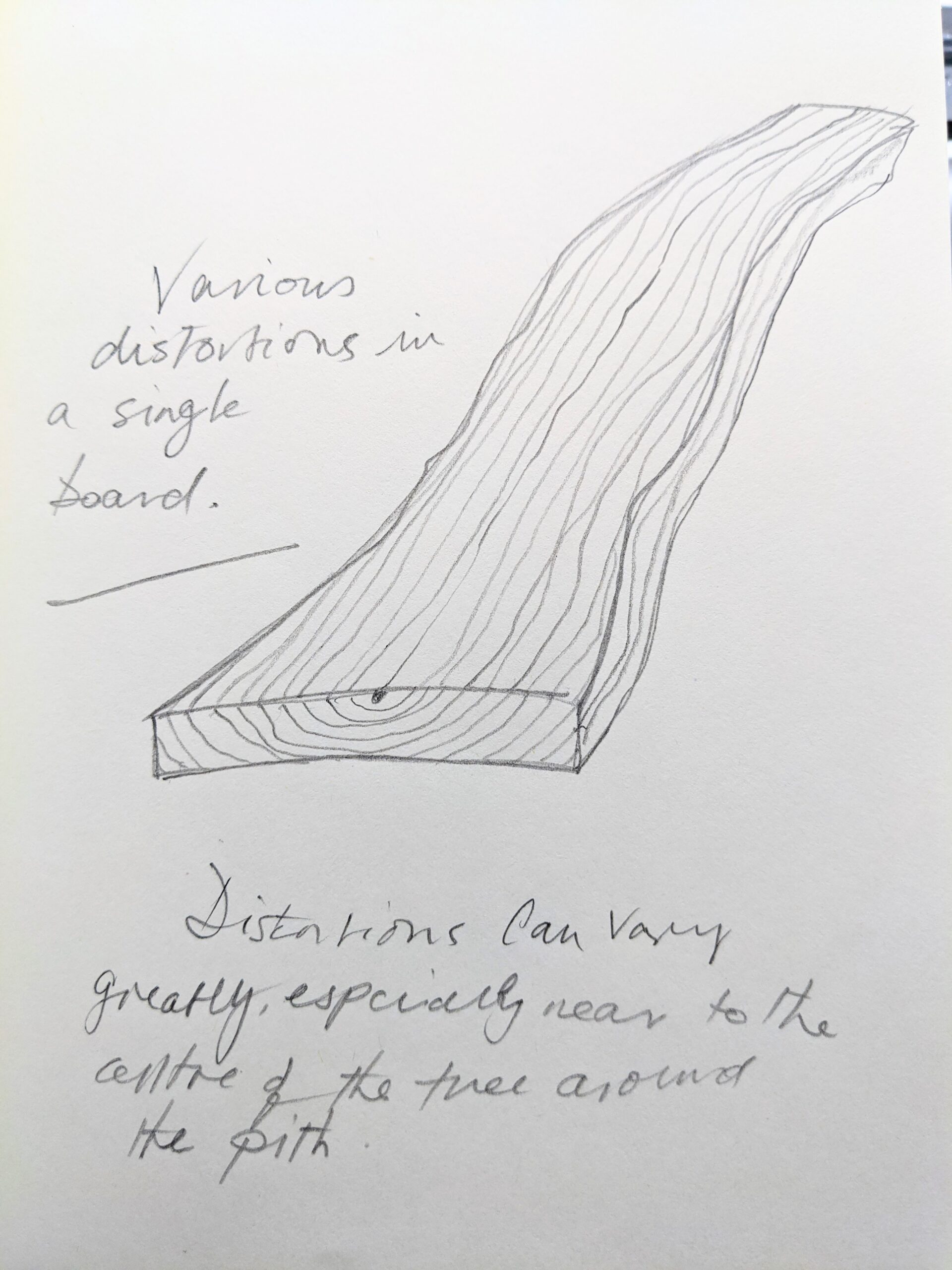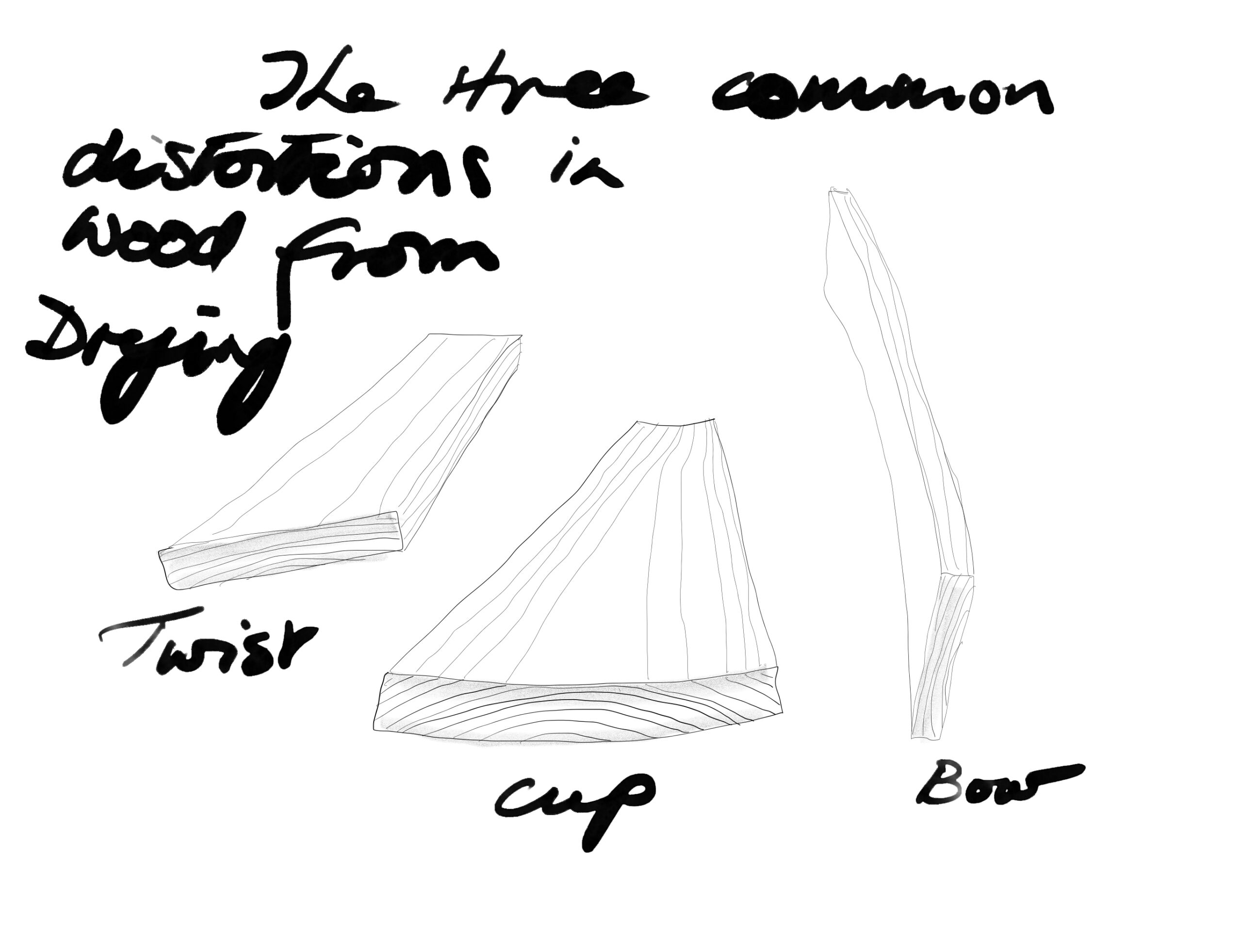 It may be tedious to see the same drawings depicting the ends of a sawn log showing the end sections of planks and beams in dotted lines that in turn delineate expected distortion but they are indeed worth studying. From these, we can see that rectangular sections often dry to diamond shapes and then too that the nearer to the outside of the tree stem that we take our wood the greater the amount of cupping. Also, the twisted stem of trees will indeed yield twisted boards and though twist may visible on the outside of the tree, no logger will anticipate nor be concerned about you picking out your dried and twisted wood in the timberyard. On the one hand, I might advise anyone to reject twisted boards because there can be a lot of loss after correcting a full-length distortion. If short sections are needed, then the loss will be much less and the board may well suit your needs. This is true too of long bowed pieces. For short sections needed in chairs and such, there will be little if any loss. Especially is this so if the parts are lathe-turned for whatever piece you are making.