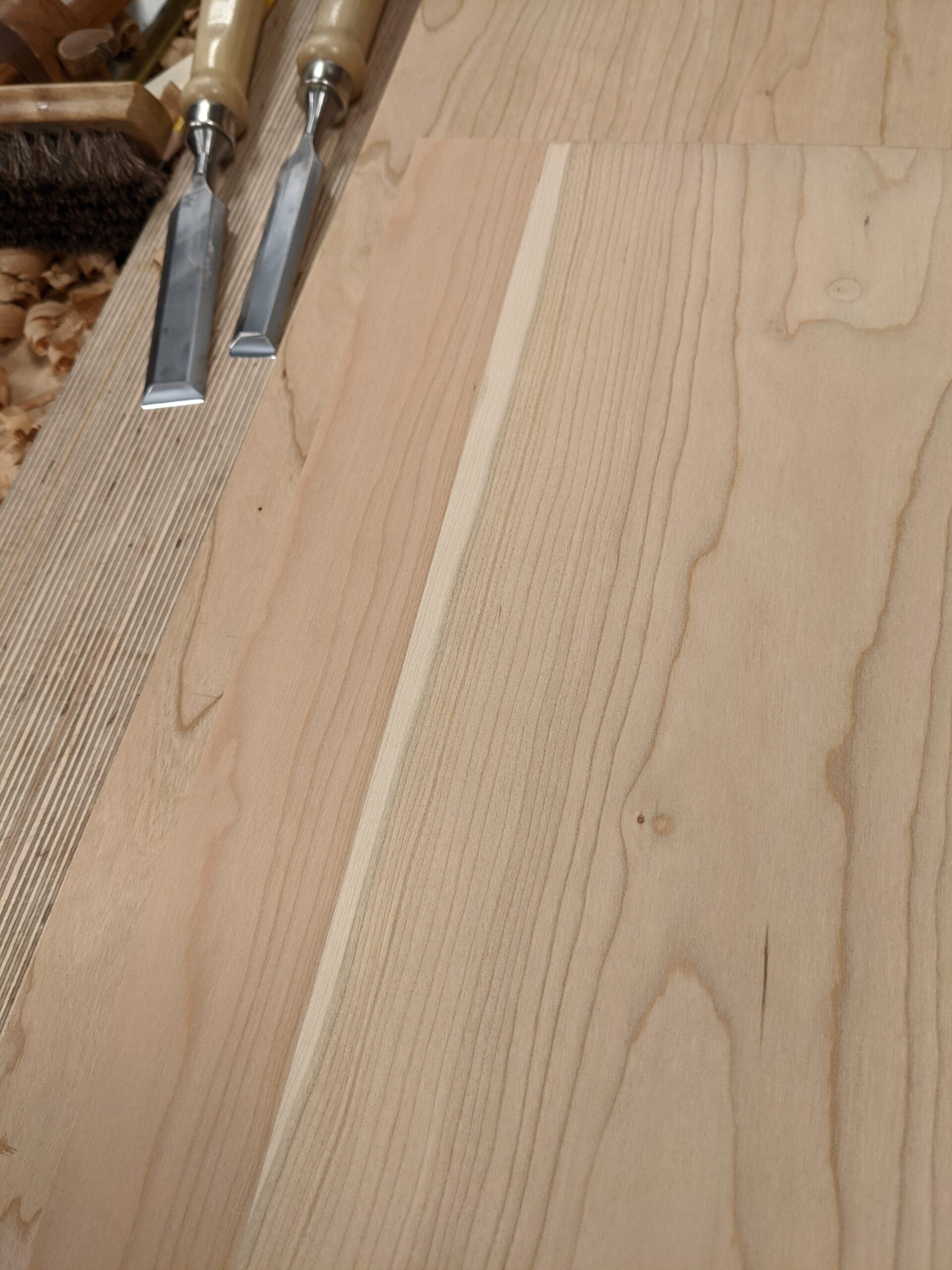 Just as planning ahead by drawing, enables you to plan buying by taking off a cutting list from your drawing, so too thinking about the individual parts to your piece will help prevent a crash in the middle of the whole when done. A panel with cherry sapwood that can sometimes not be detected in a newly cut and planed surface and edge can almost always be detected in the end grain.