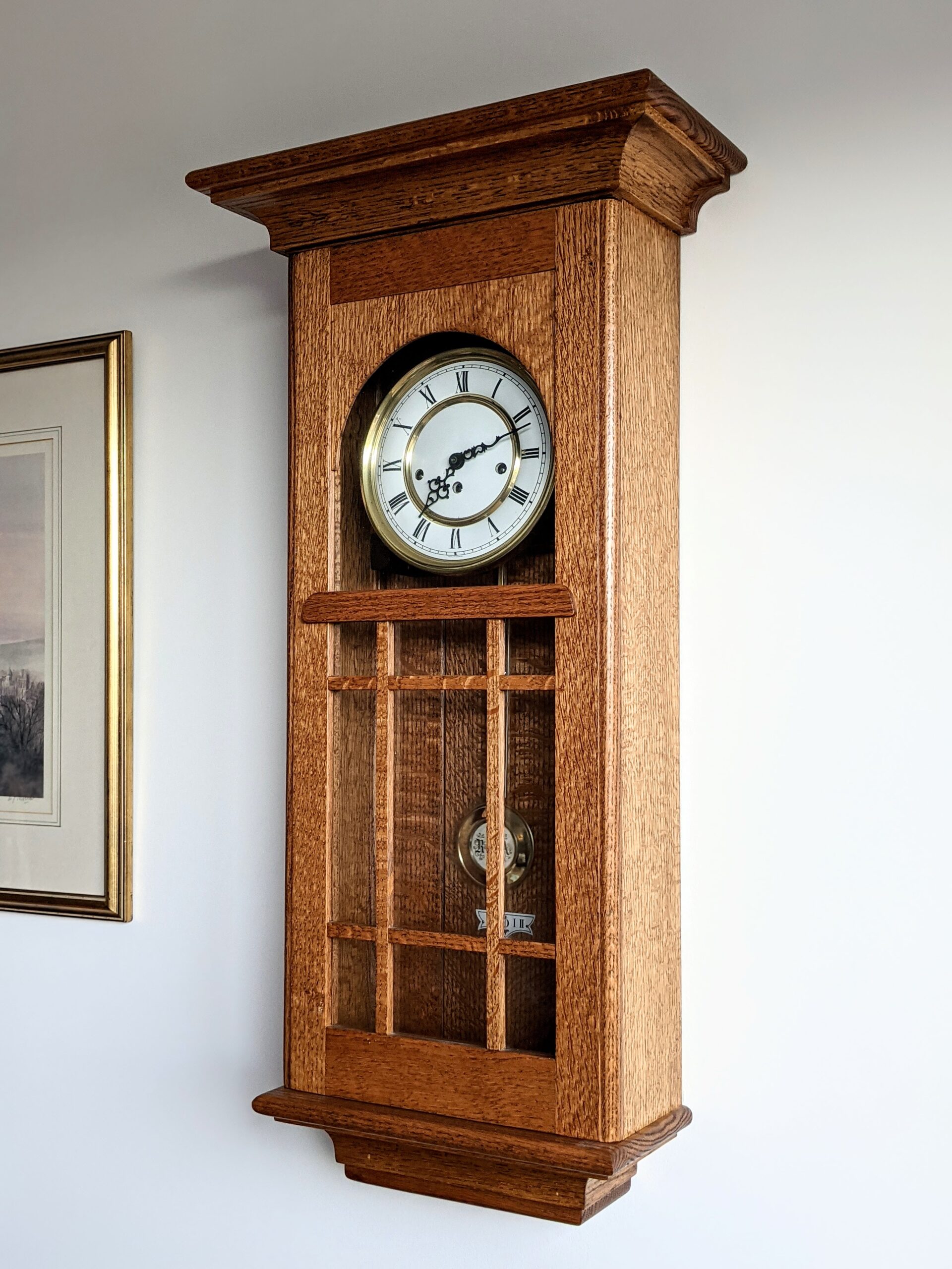 Here is a clock I made 15 years ago from quarter-sawn American oak. There is something uniquely special about making a clock case of your own design and then too taking it into the house and hanging it on the wall in time for Christmas. The pleasure for me was two-fold - the whole process of designing it and making it - and then the pleasure of giving it. In this Hermle eight-day clock movement I wanted the Westminster chime, and then something that needed winding every 8 days so that it could be wound each Sunday as a ritual with the Monday as a buffer for forgetfulness. Surprisingly for some, it is as perfectly adjustable to high levels of accuratcy as well as being perfectly charming and elegant. Well worth the effort of making for so great a reward in service.