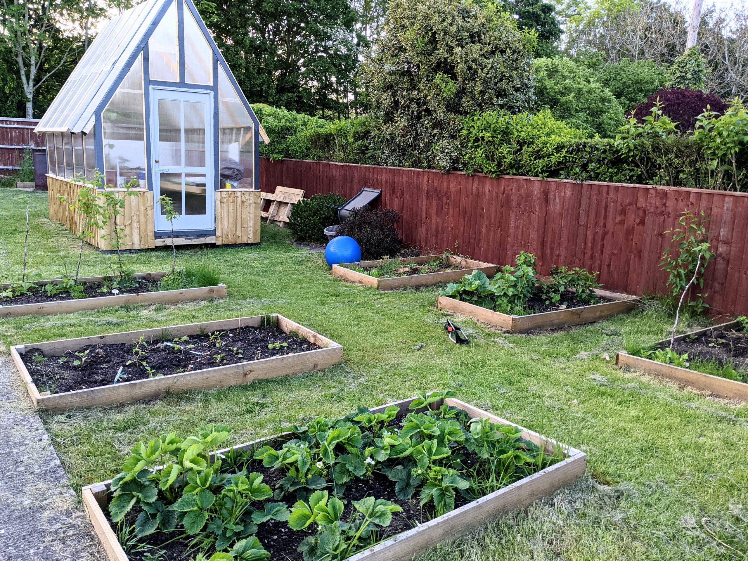 Beyond the brick walls the garden seems a little later this year. With a wet and cooler start to our spring, and lots of rain and cold, things are not popping quite so soon as the last two years, but the greenhouse is a wonderful addition and is now in full use. The vegetable beds and growing boxes are filled with emerging plants of onions, shallots, garlic, potatoes and much more. My tomatoes from my window sills at work are well under way in their new home and the yellow flower-heads promise an abundant cropping of tomatoes.