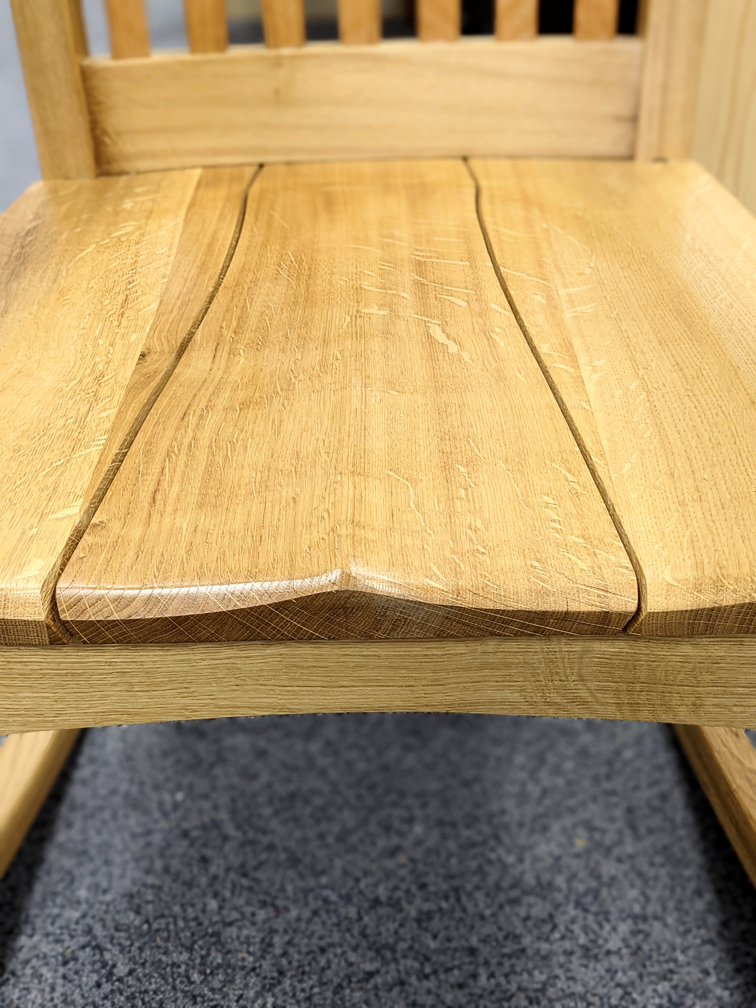 The timber yard usually stocks dried wood. Even so, we must go the extra mile and make sure that our newly attained wood is acclimated in a suitable environment. Wood dried down to 5-7% will readily wick up atmospheric moisture to double those levels in just a few weeks. Shrinking our wood for good reason can soon be negated by damp and wet working environments. My shop in my garage is dry. This is worth dealing with early on in establishing our workshop. A benefit of a wood-framed, shed-type workshop is that you can line it, insulate it and thereby best maintain humidity levels. Older bricks and mortar buildings can retain high levels of water in the bricks and concrete floor. Dry-lining will help here, together with a wooden floor on top of the concrete. My recent addition to my garage workshop is stick framed, insulated all around and then lined with plywood panels. It's easy to keep dry and it is here that wood is best stored. Even so, my oak rocking chair with its spit seat continued to shrink after it was completed three months ago. I am glad it added the angled split seat design element because had I not the seat would indeed have likely cracked. On the other hand, my cherry rocker seat expanded to close the gaps I made.