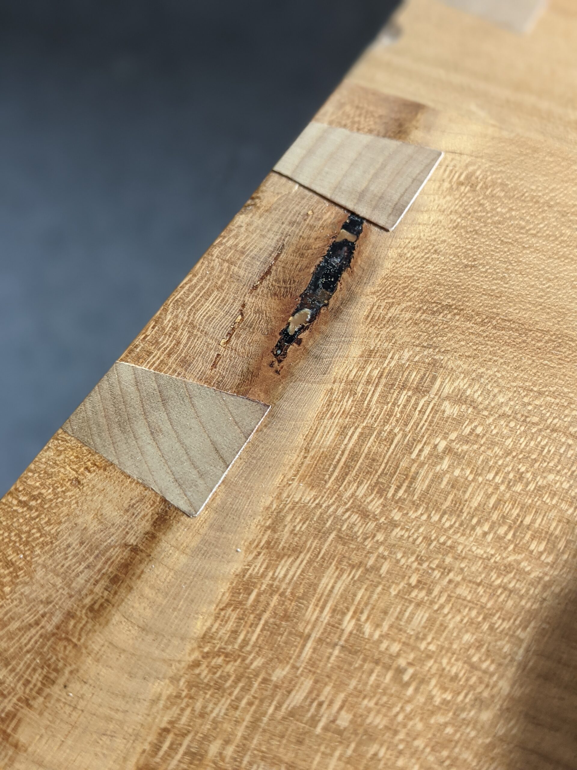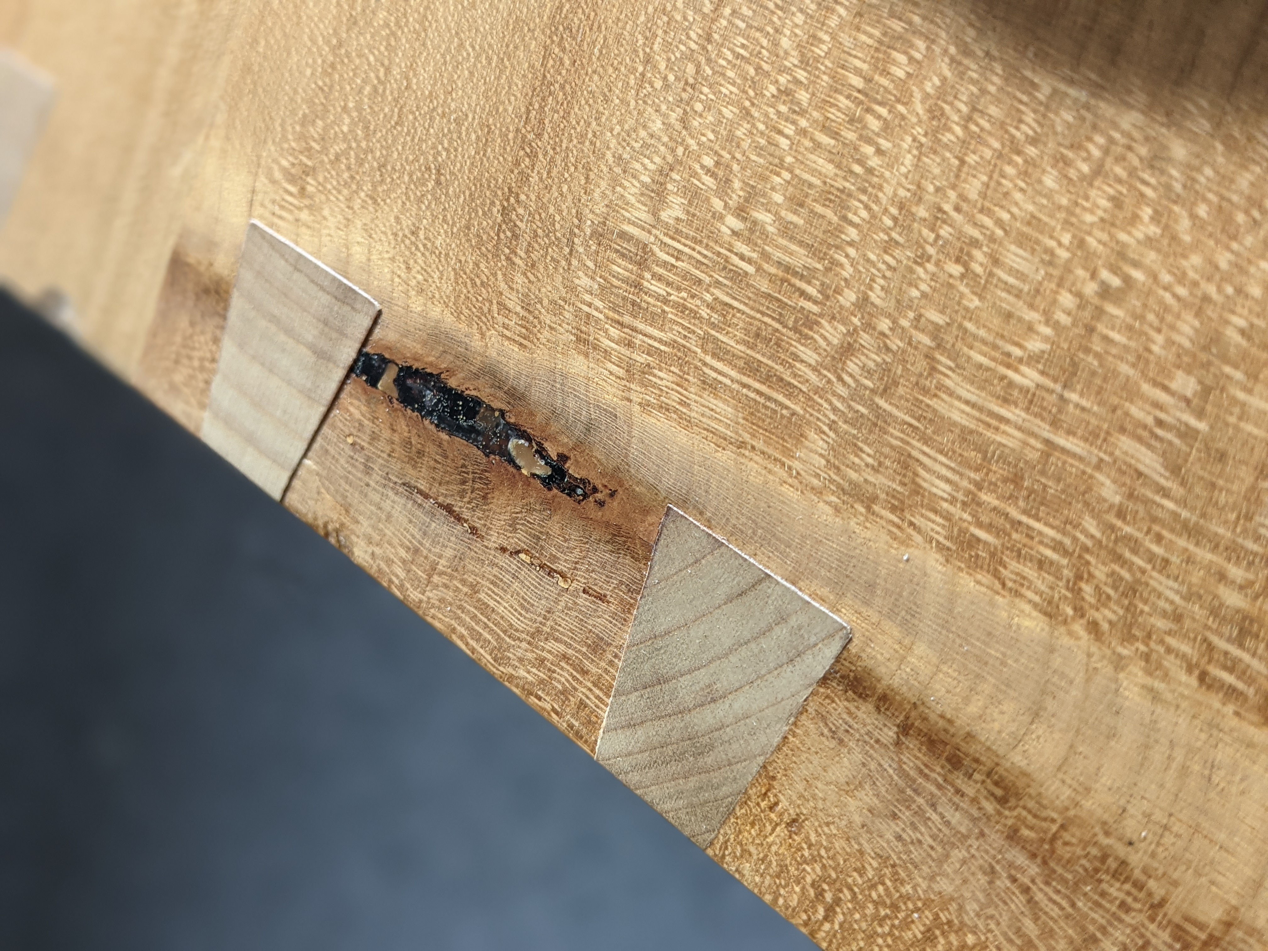 In this piece above I should technically have rejected this section of wood but I wanted to persevere despite knowing the grain surrounding the knot would emanate into the joint areas and cause me difficulty. The wood was very dry at 5% and yet it still shrank to a level that I could feel the pin's slight protrusion. In this piece, I, liked it. In others, I might not.