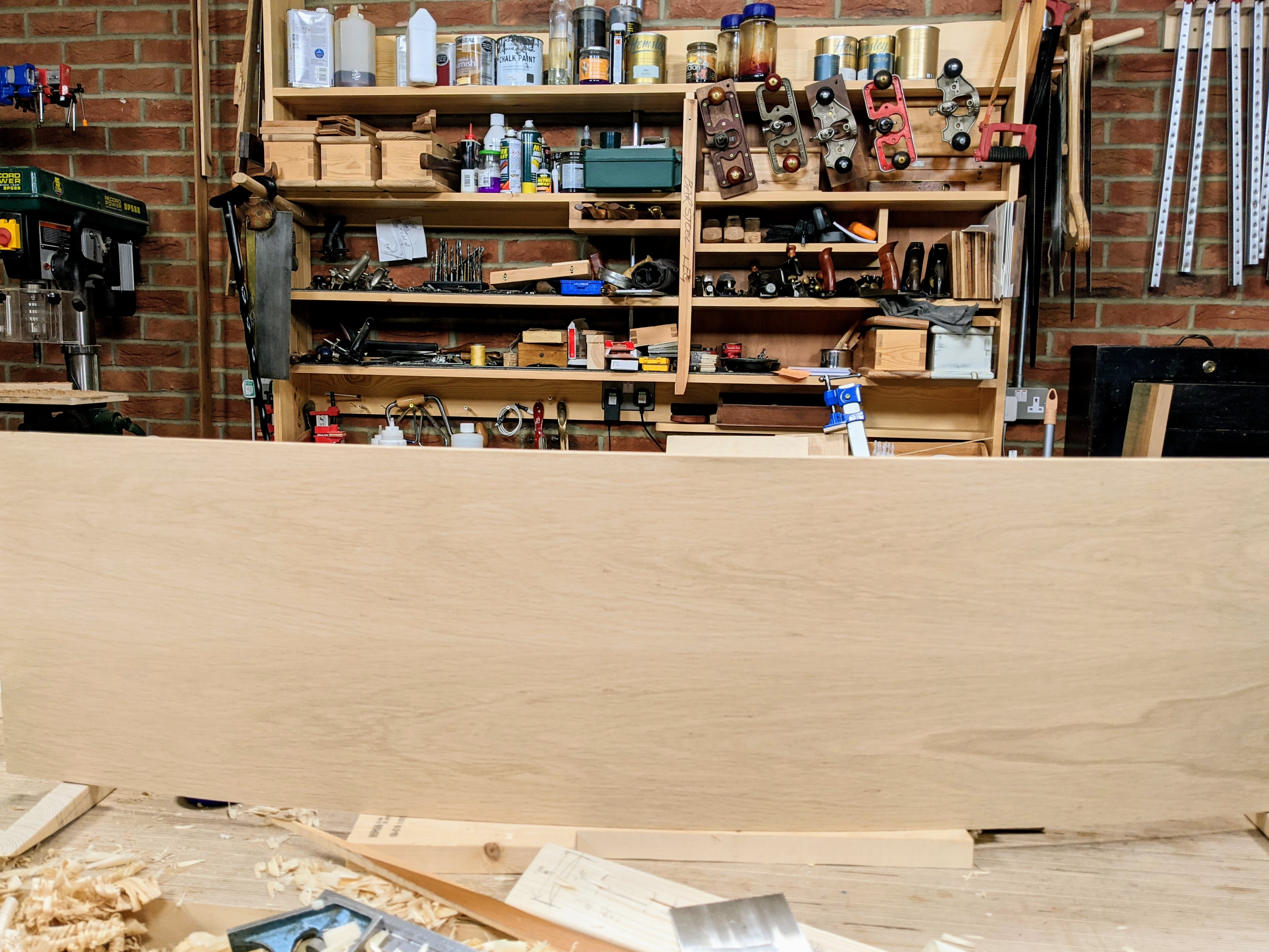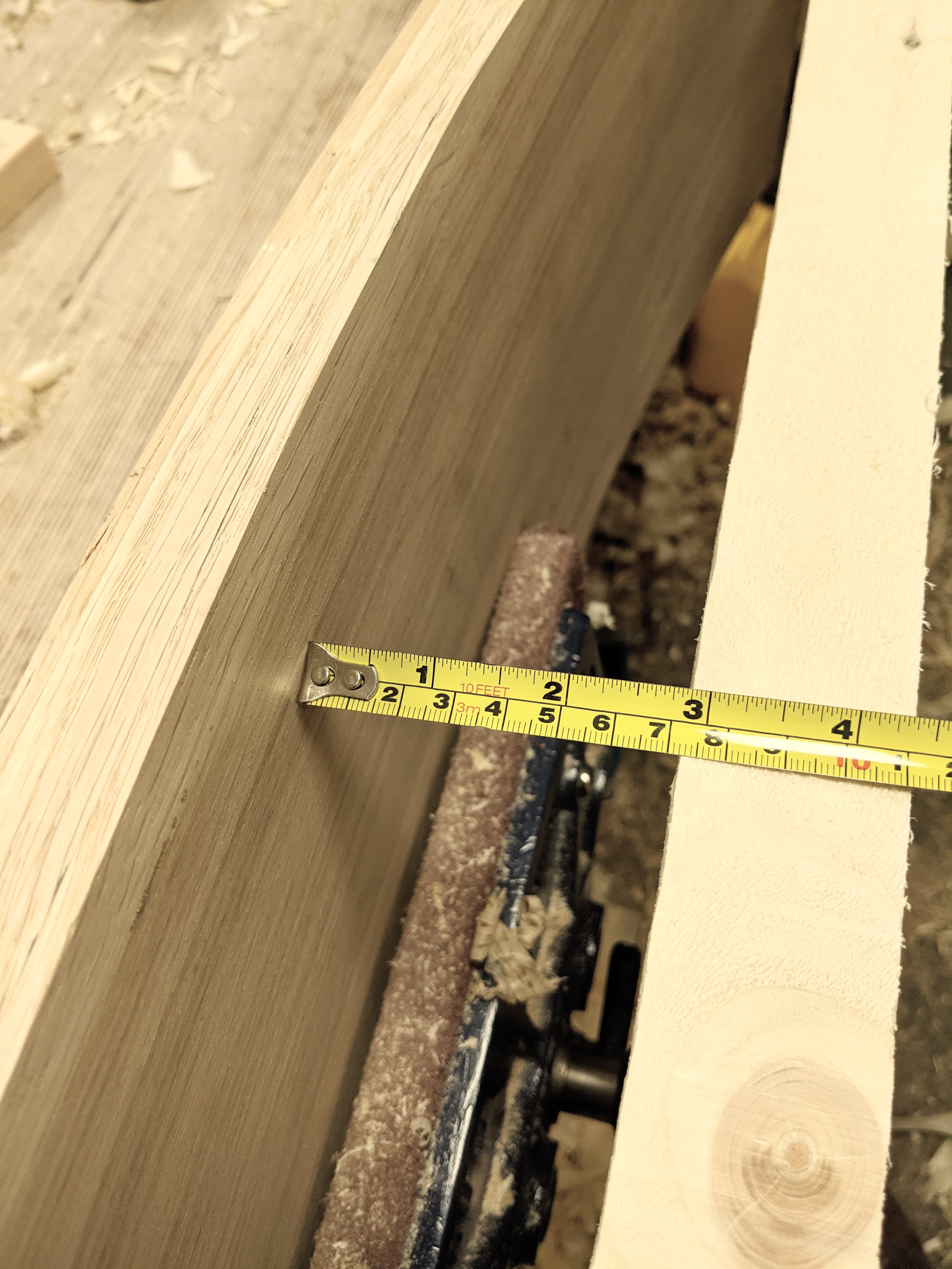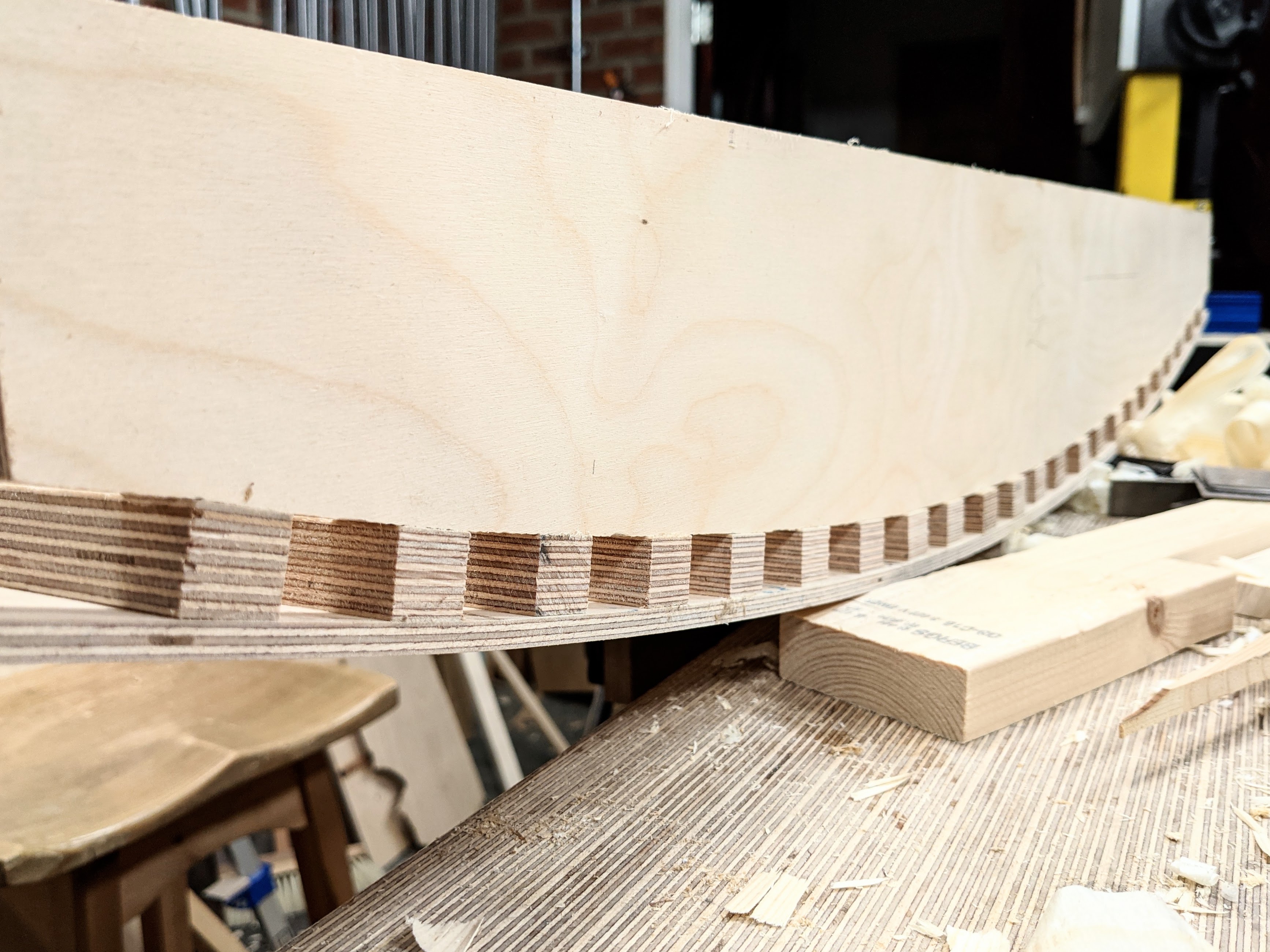 I built a platform from 3/4" plywood that gave me the rigid resistance to any flex that I needed. Experience told me that the thinner the layers the more readily the wood would conform to the bending process and more importantly that the bends would not spring back as much as when using thicker layers. Were I able to cut thin layers of say 1/16", retention of shape would be as near perfect as possible, but the issue then becomes consistency in thickness and the possibility of a certain amount of bandsaw drift, blade bulge and so on. A bandsaw blade, no matter the level of sharpness, no matter the tautness of the blade between wheels, feed rate etc, will usually still tend towards that inevitable path of least resistance. Such straying on so thin a material as 1/16" will often end up with the blade popping out the side of the wood. Going thicker resolves this and will also allow for further planing and scraping if needed or you choose to. Also, planing thinner stock that wide and that long can be problematic - one section in a panel with opposing or rising grain, a swirl here, a knot affected area there, will tend to tear or rip out all the way through the layer. (Those with a wide belt sanding machine, please desist from telling me you have no problem with such an issue. We all know!)