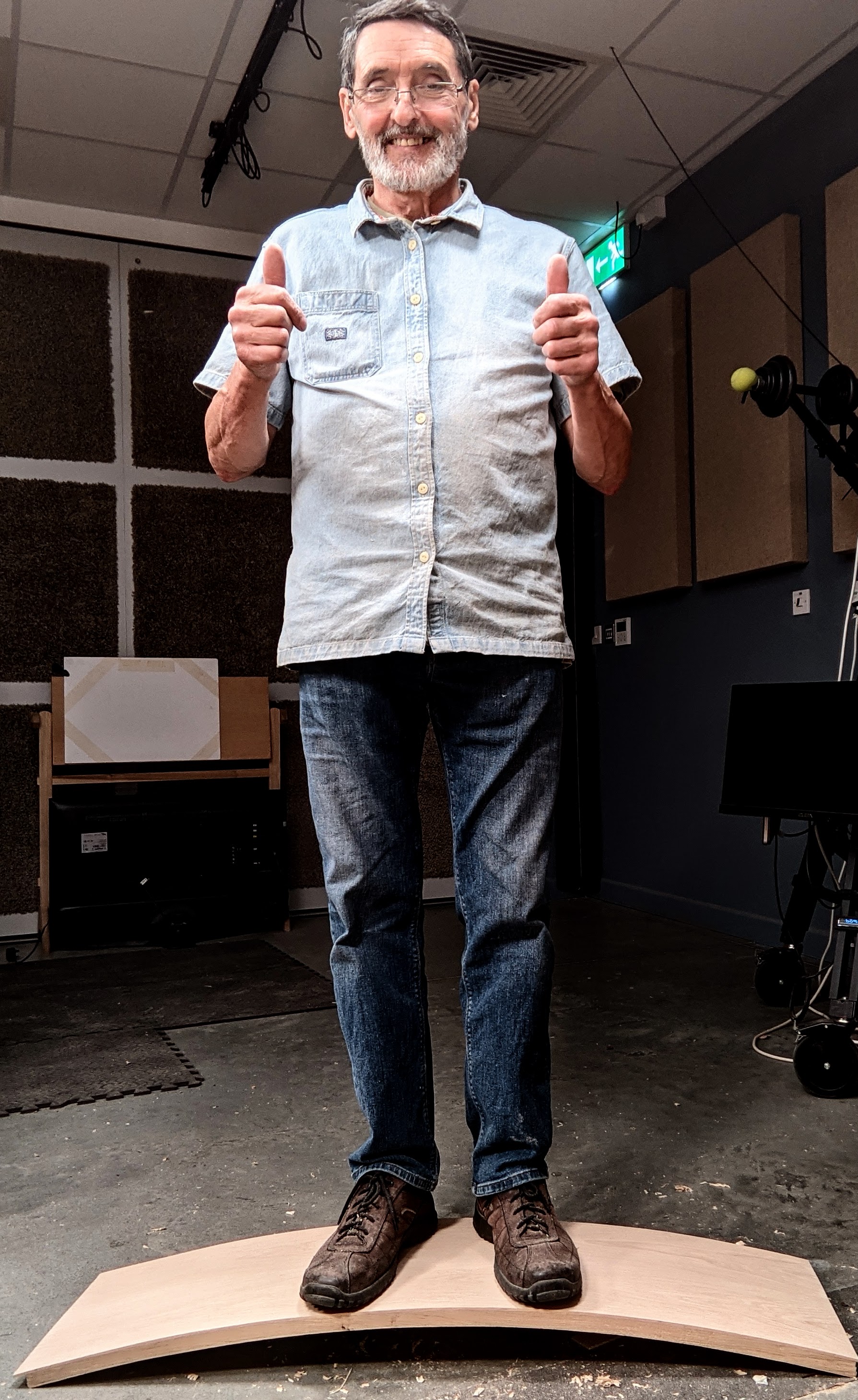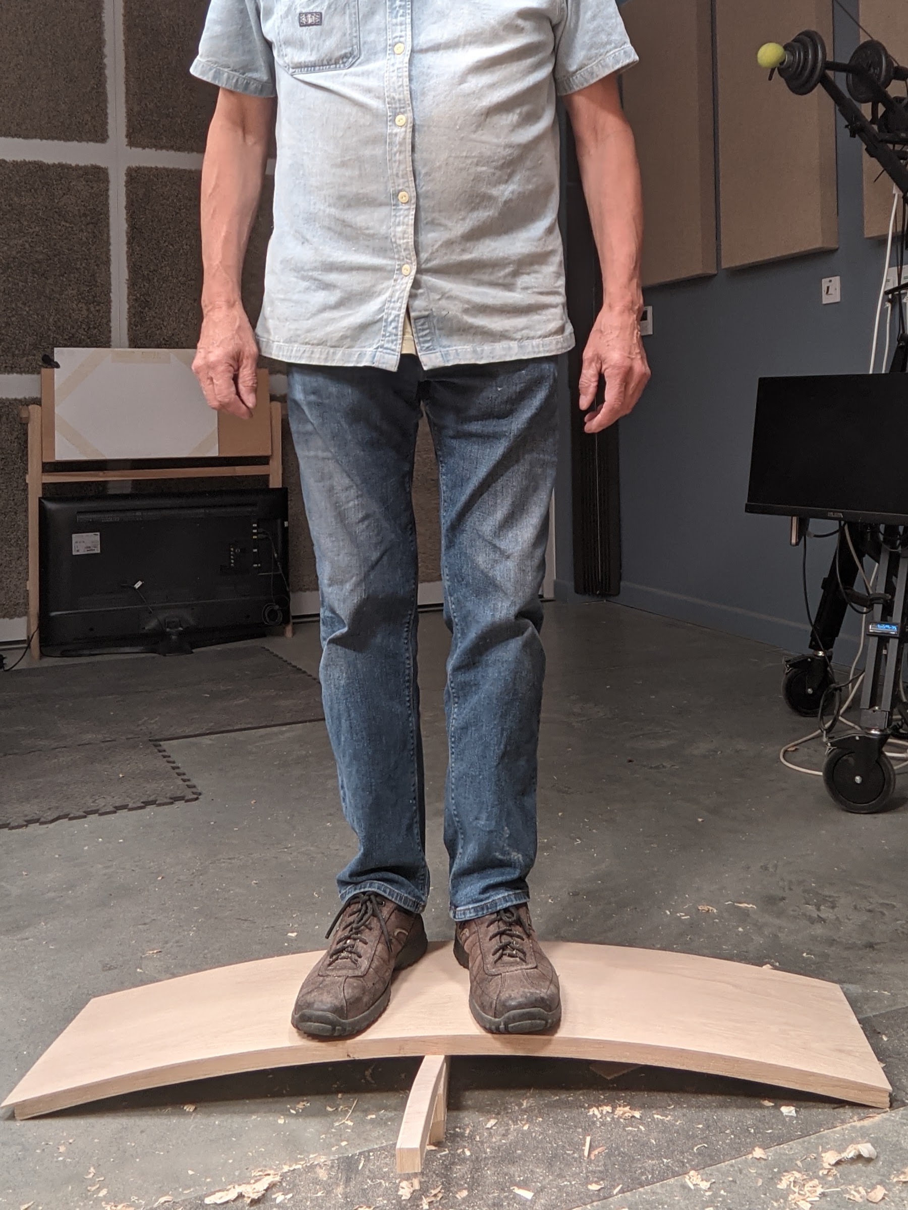 I ended up at just under an inch thick. The strength arching adds is incredible of course. My weight of 165 lbs (75 kilo) made barely any impact on the flex. In fact, it gave just 1/16" (1.5mm). It feels so rock solid when you stand on it as I did here. What will I do with the experiment now? Not sure, but it will get used I assure you