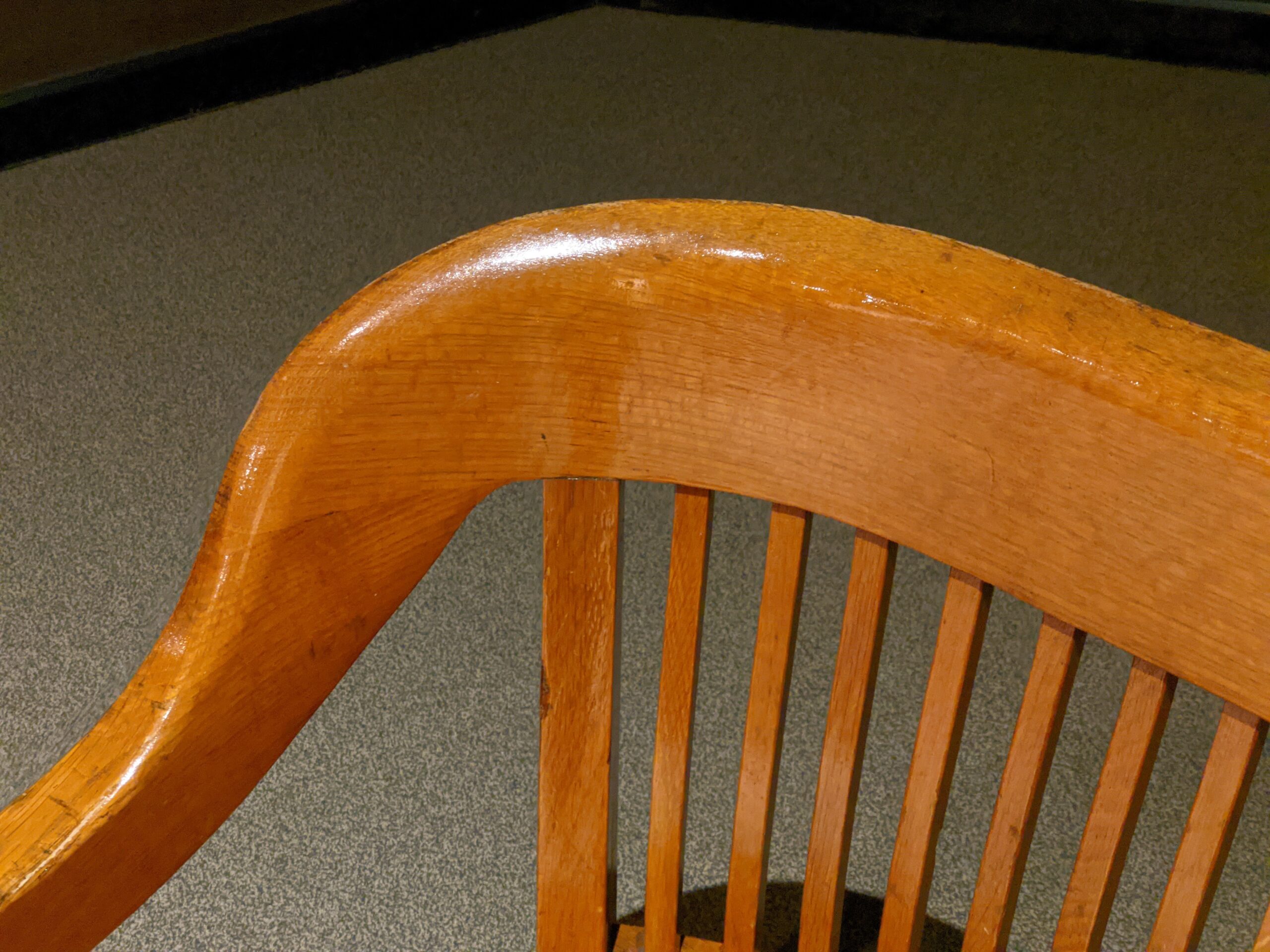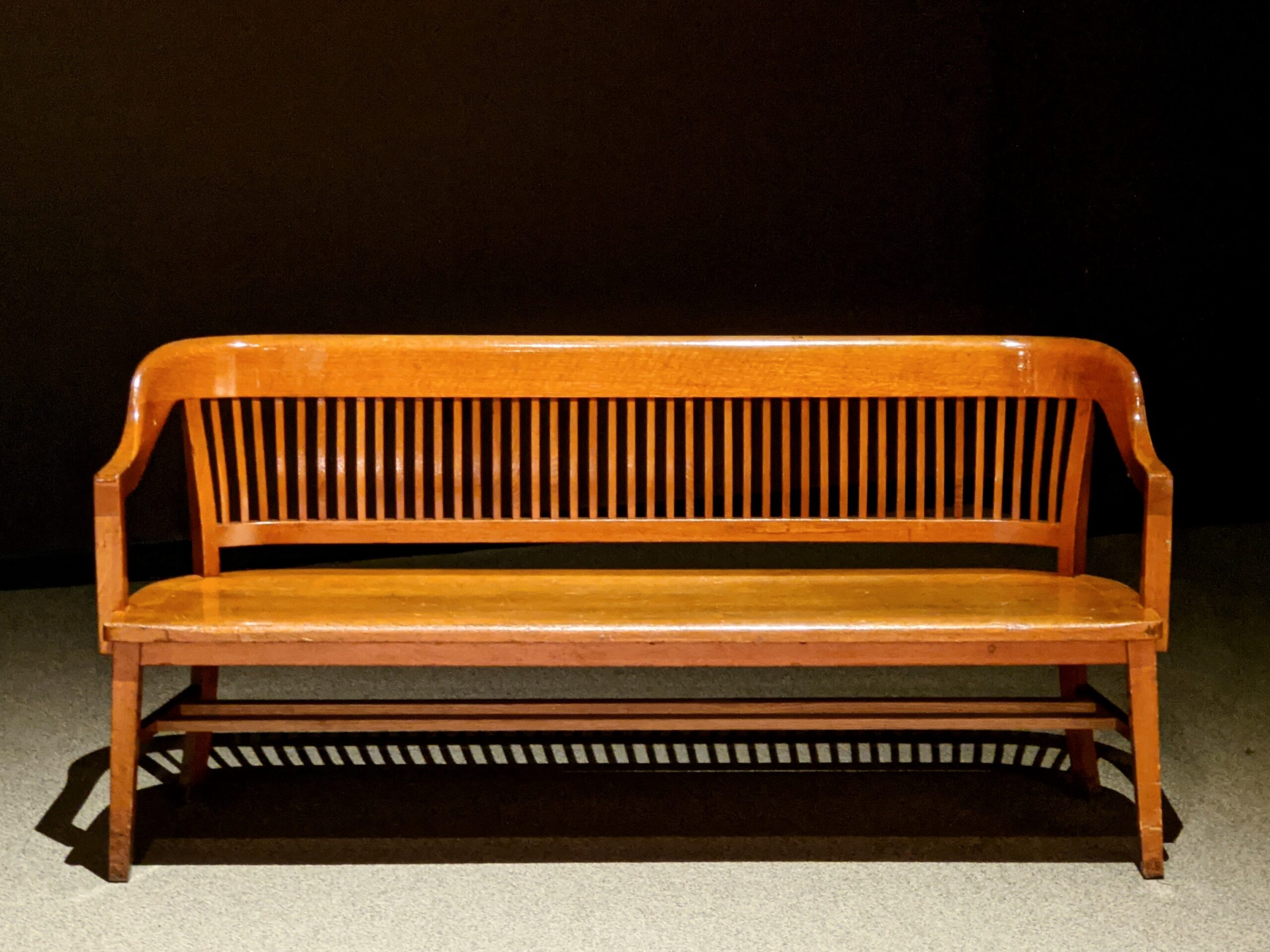 I'm standing beneath a giant skeleton of a dinosaur staring from its immense framework at another less dominant presence made by a man's hands some decades past and respecting his design skills in the form of what appears at first glance to be a simple oak bench seat. Though I may not be speechless, as I might be, thinking about a Tyrannosaurus rex, I am quite impressed by two impressive but far from obvious elements that pulled my mind from bone structures and mass naturally formed, towards a different kind of framework made from wood with joints that are fitly framed together. On the one hand, the joints are held together by glue and with some mechanical resilience, the joints were designed for. On the other, the joints would have been held in union by muscle, sinew and tendon yet with equal consideration of longevity. One consideration was the ability of its designer to create something unpretentiously simple that constrained the design with several hidden complexities that transferred stress and strain from one part to another to maintain integrity. Another perspective is the evident consideration in the comfort it exudes before you sit that expresses ergonomic form before your body is embraced by its built-in curves. Much more impressed me with the design. There they sat unpretentiously around the museum, like punctuation marks in human design, with people milling about around them who seemed to me to be totally unaware that the seats could also warrant their considerations and much admiration as the replicated stegosaurus they stood admiring for 20 minutes. I suppose in many ways considerations are perhaps tied more to the imagination as the huge giants command attention by sheer mass, imagined mobility and fictional films. I admit that I am often surprised that visitors rarely consider simple designs to be works of art expressing ergonomic design qualities that are all too often unseen. These bench seats express skilled design work that then evidenced crafting artisanry. I sat, relaxed, allowed my body to collapse, and allowed myself to become absorbed by a manmade frame I just loved.
