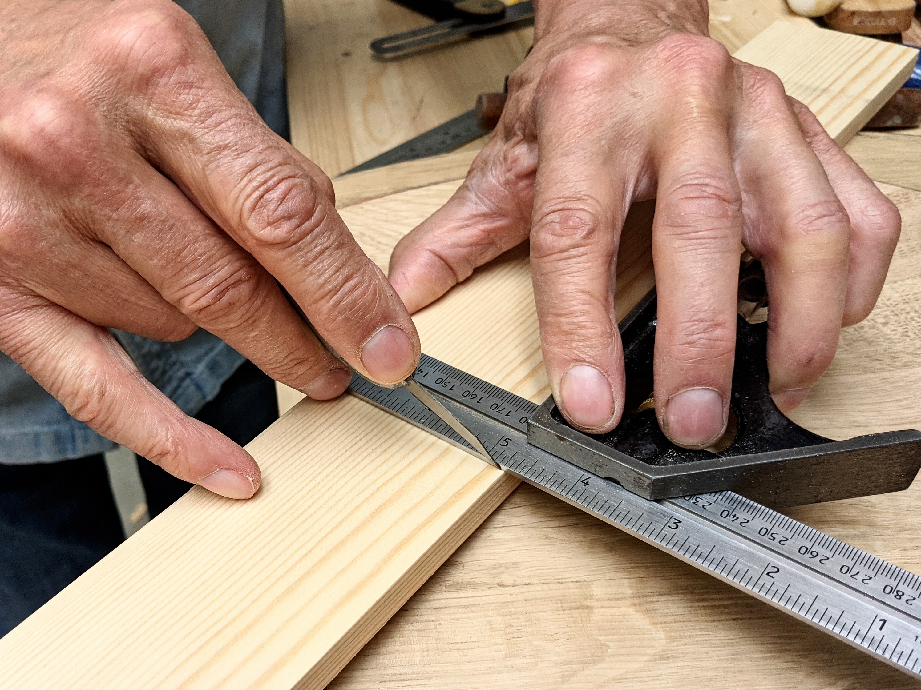Estimating the speed with which we learn to master techniques and skills can be difficult to evaluate and assess because it's time-related learning that can hardly be measured in bits, bites and bytes. Additionally, for many, that means short and medium jabs of working in small to medium segments of time; more usually, woodworkers work mostly part-time with many breaks in the continuity that would defy establishing skill-building more quickly. This is frustrating, of course, but we do whatever it takes because, well, we want the experiential learning we get in the doing of it. When I started teaching, I created exercises thinking the more exercises you did the quicker you would learn. I soon learned that, whereas my approach seemed logical, that's not necessarily the case. I found that project-based making adds a dynamic that cannot be quantified. The project itself becomes the dynamic that inspires people to extend themselves beyond anything they may have done before. Project-based learning carries within it an energy that highlights the need for extra care and extra accuracy in every aspect of the making process. This extra spin value compels students to investigate and seek out answers as they are in the saddle, so to speak. In this, they learn far more readily knowing that there is a project to be completed and at the end of a day's working they will have something by which they can measure the quality of their newly acquired skills. Whereas they were uncertain as to what they could realistically accomplish, I pretty much relied on the fact that almost all my students, those standing on the other side of my workbench watching me, would do just fine. The biggest input I made into the world of amateur woodworkers using and wanting hand tool woodworking was believing that within them lay dormant skills as yet untapped and unknown and unmeasured. I had worked out what the core essentials were that they would need immediately on starting the journey towards good craftsmanship. For many, telling them about the knifewall somehow unlocked and unblocked the logjam of doubt they had about themselves. They saw the sharp point of the knife go in, the chisel sever and separate for a stepdown and a saw follow a perfectly straight and vertical cut. When they saw this, I had them. They saw it, they knew it, and once they knew it they owned it. It was not something that I was ever taught but something I knew of before as simply 'marking' and 'striking and 'layout'. Knifewall was the term I coined to describe what was hitherto unnamed. It brought pure clarity to what had just happened. The misnomers of marking, striking and layout marks were gone forever. These terms gave no sense of severing fibres with slicing cuts and of course, a conically-pointed cone of steel did no more than indent the surface with an elongated, bruised furrow. Hence, back in the early 1990s, my students willingly adopted the term, and today, at least in the realms of woodworking, knifewall as a description is pretty well universally accepted; a whole new word for woodworkers and one that I established in my own vocabulary without ever realising the word would spread because it explained exactly what it created. It has become a word I have now used for these past 30 years.