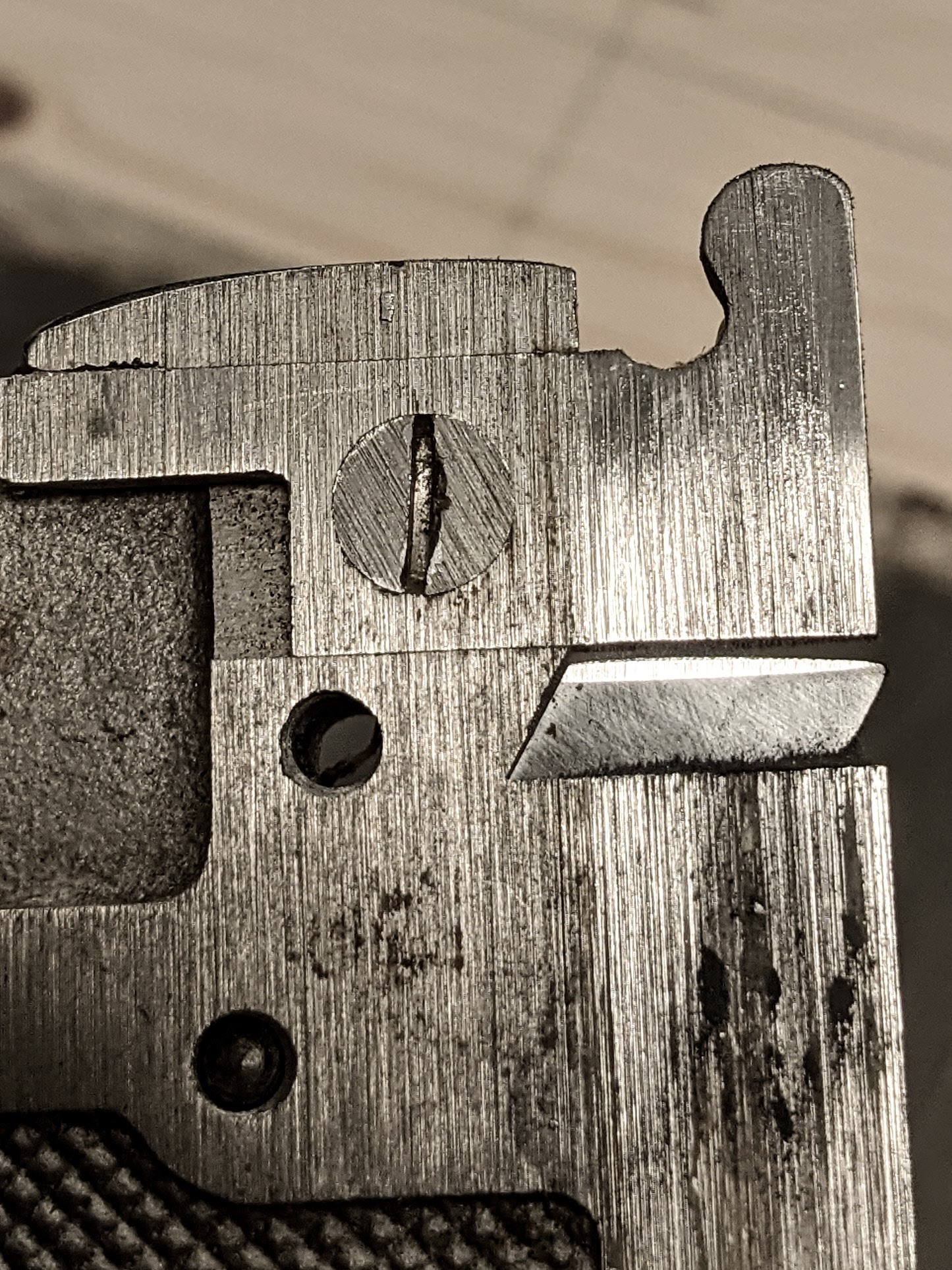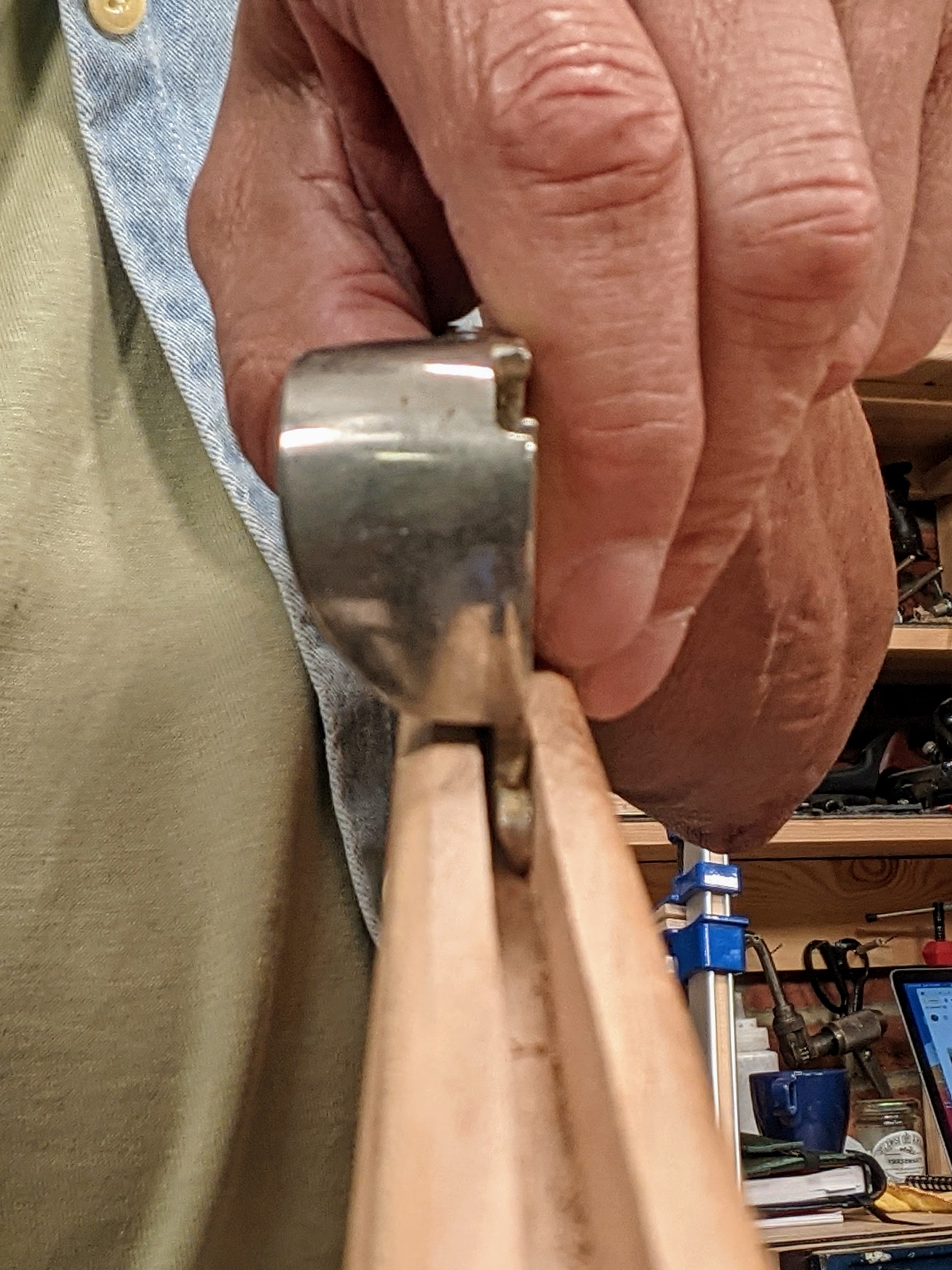 Here you can see how the shine on newly abraded metal shows the line we must now establish according to the recess in which the cutting iron lies and its relationship to the outside face as the sole of the plane. We call this the bed or bedding angle.