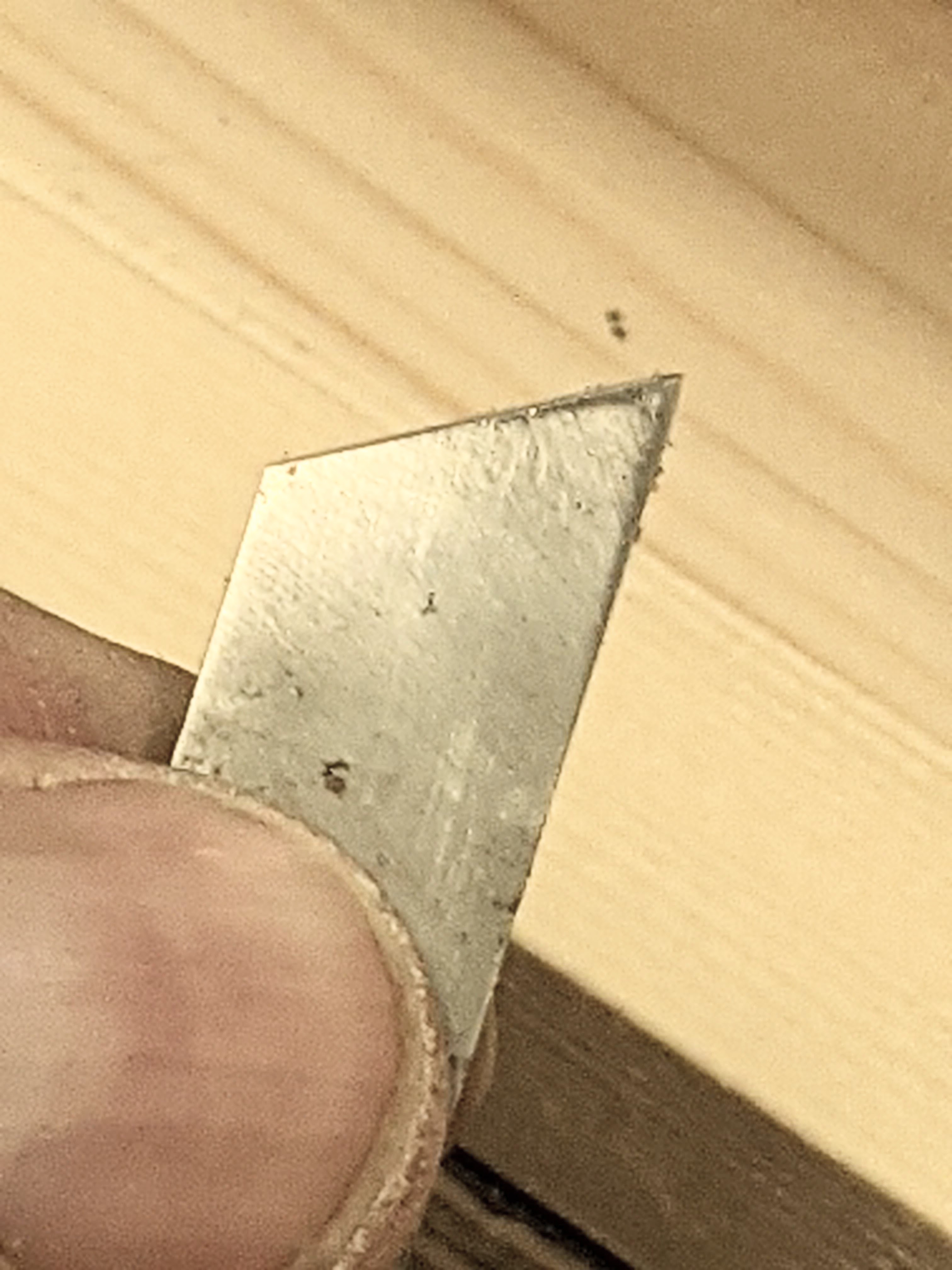 Once the angle is perfected, it is simply a question of beveling the bevel evenly across its width. These small and thin cutters can be hard on the fingers and this is why the bevels end up unevenly beveled. I suggest using something to grip the cutter with and in my case I just used a regular Eclipse #36 honing guide but NOT so as to guarantee an angle because of course, the bevel is angled and not square-ended as with regular planes and chisels. The honing guide just gives a better balance and control for reestablishing the bevel and then perfecting it, no more.