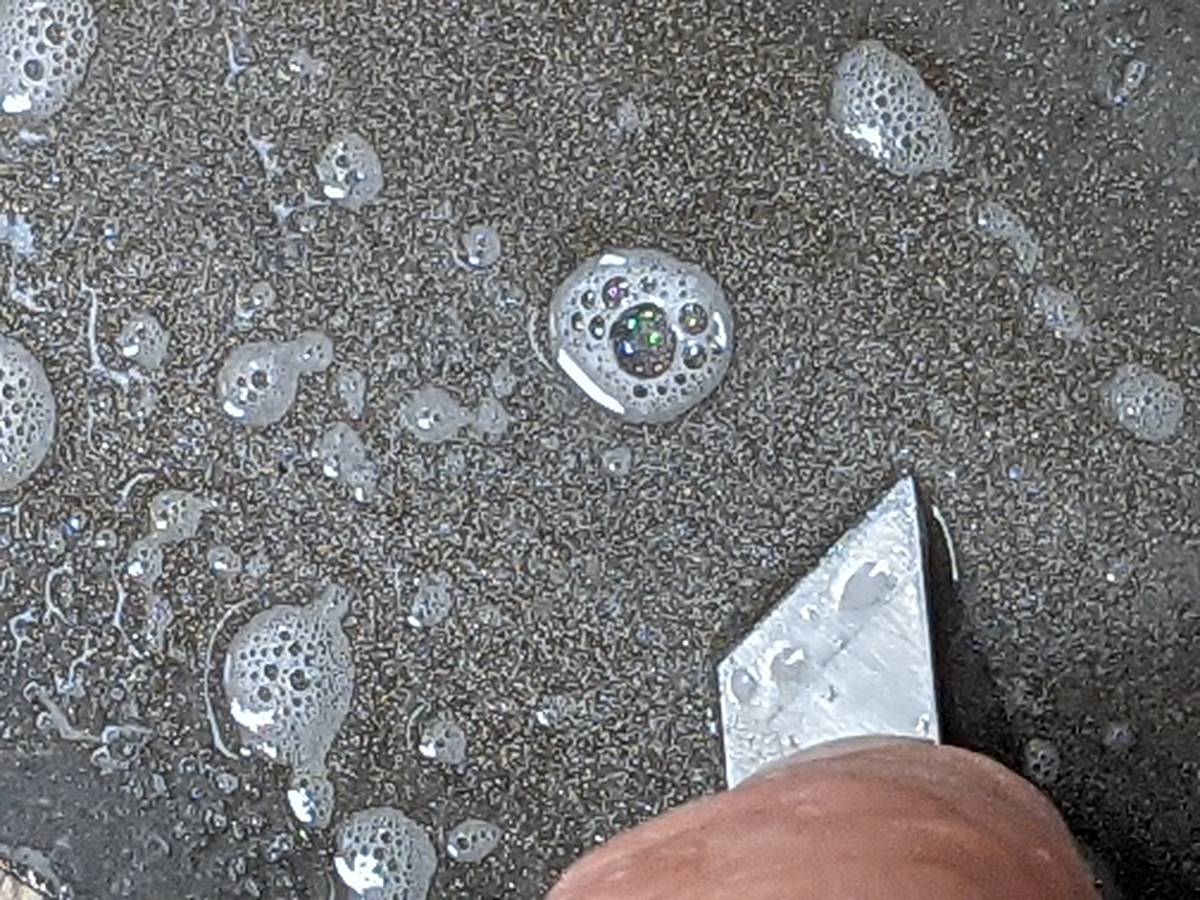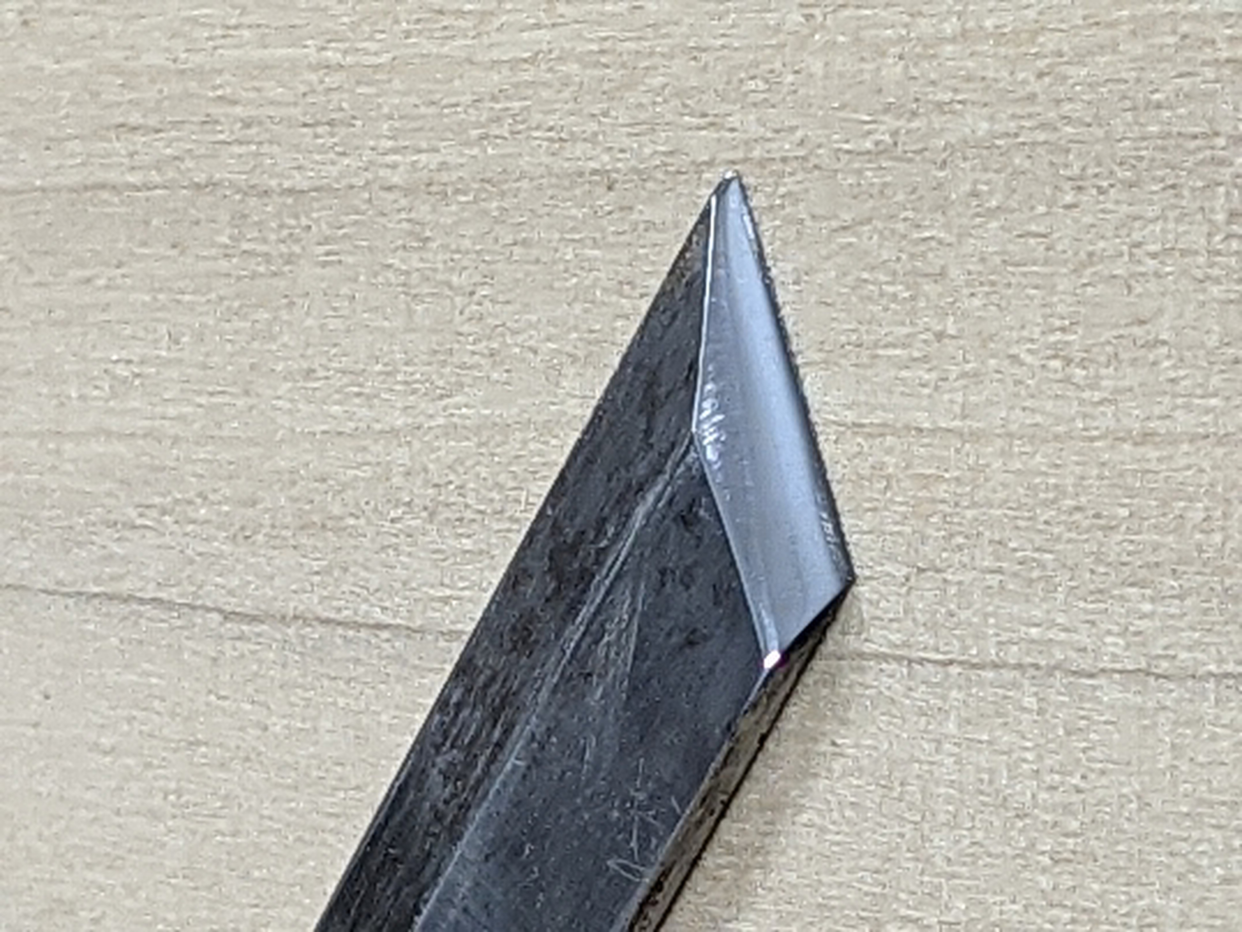 You can see now that I have filed the edge down to the edge of the bright-line and the meeting edge I have created is what I will now abrade the whole bevel to as I reestablish the cutting bevel.