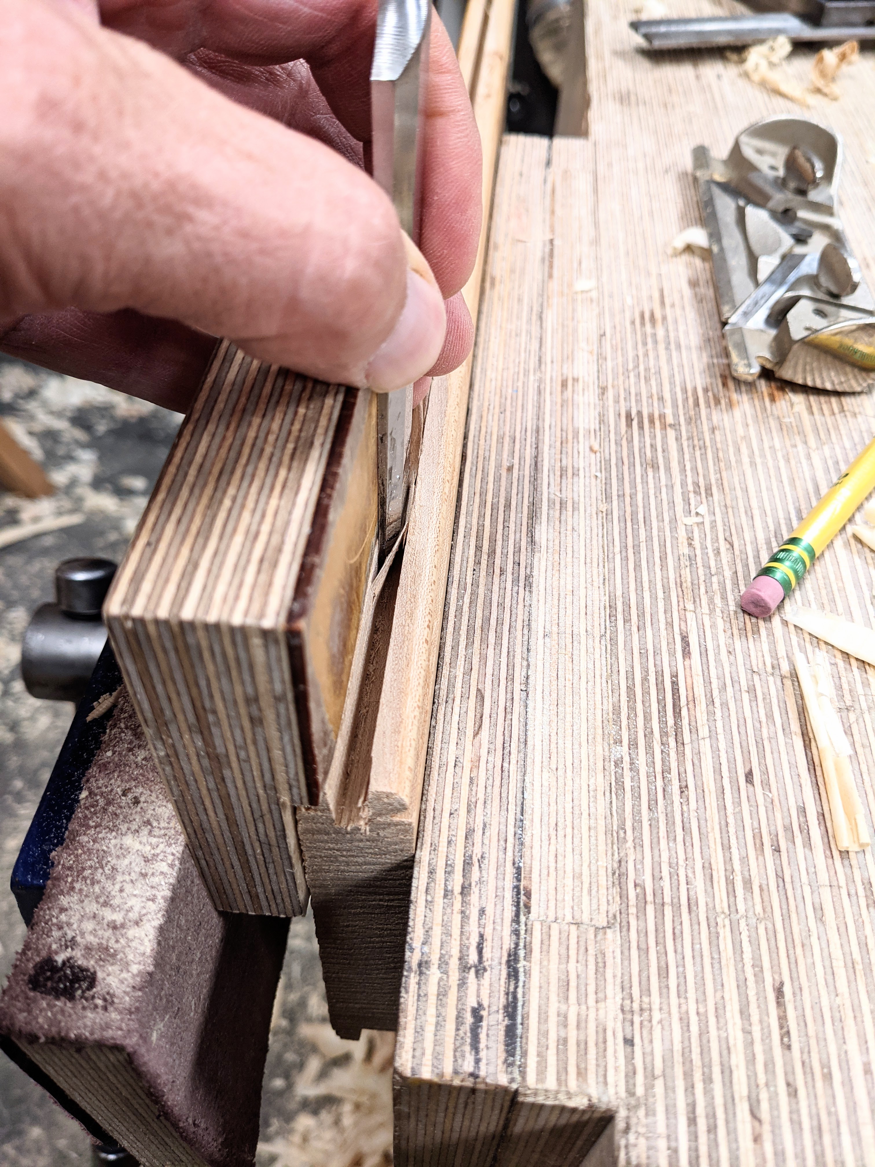 As I said, the side rebate plane is not an essential tool until you encounter many different-sized grooves according to pre-machined sizes in say manufactured sheet goods like MDF and plywood. 10mm is not 3/8" and 12 mm is not 1/2". The small differences can be reconciled with a side rebate plane but without one, you create a fence to guide a chisel as shown here. It is quick and effective.