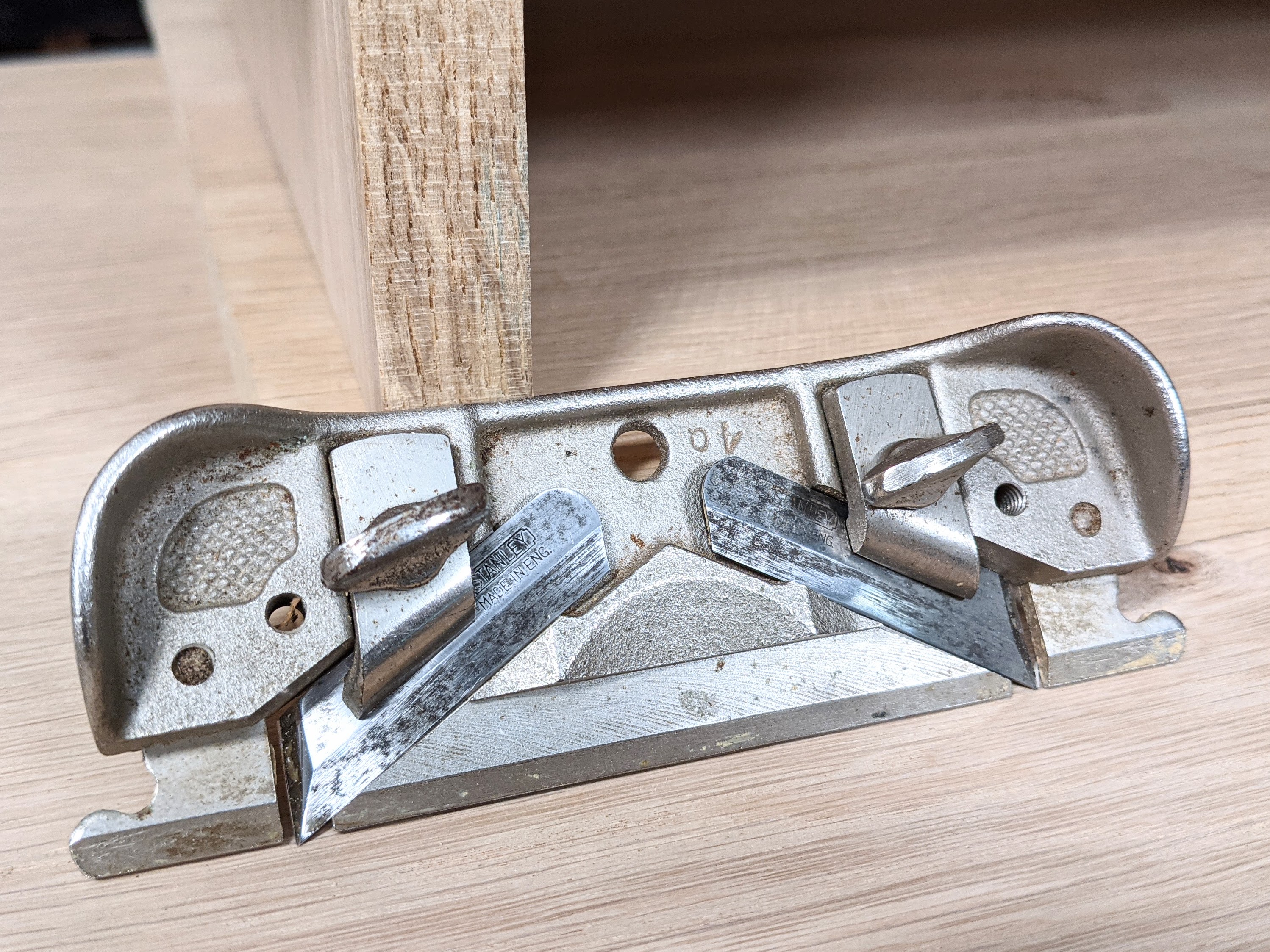 The plane I want to talk about is the side rebate plane produced by Stanley and then Record and then Preston too. Some side rebate planes have one blade in them and thereby require two such planes with the blades offered in two opposing directions to deal with opposing grain and the opposite sides of grooves and such. The two-bladed versions offer left- and right-handed in a single plane body so when you encounter situations where an opposite direction is required you can simply flip the plane over or end for end or use it on a pull stroke to resolve adverse grain issues.