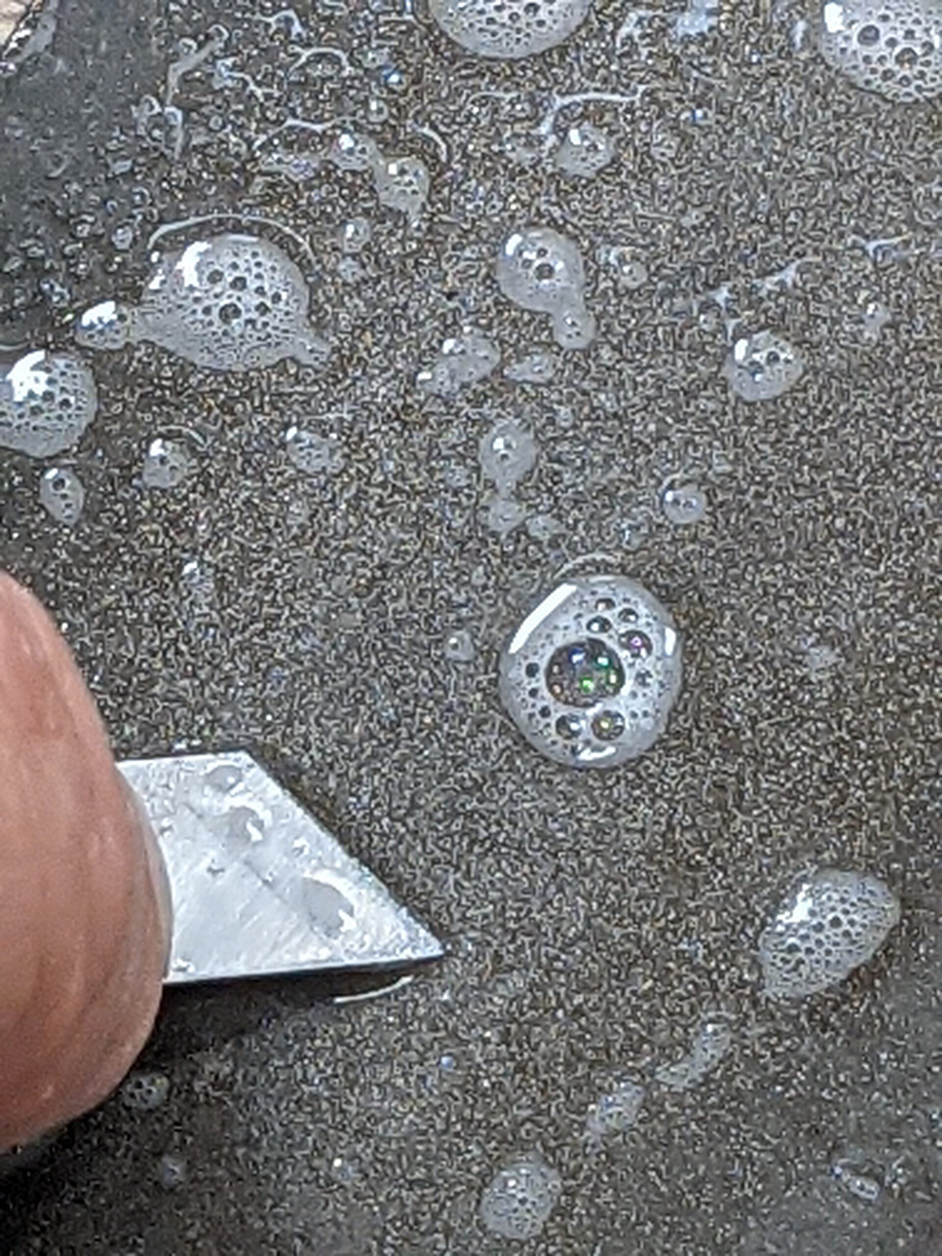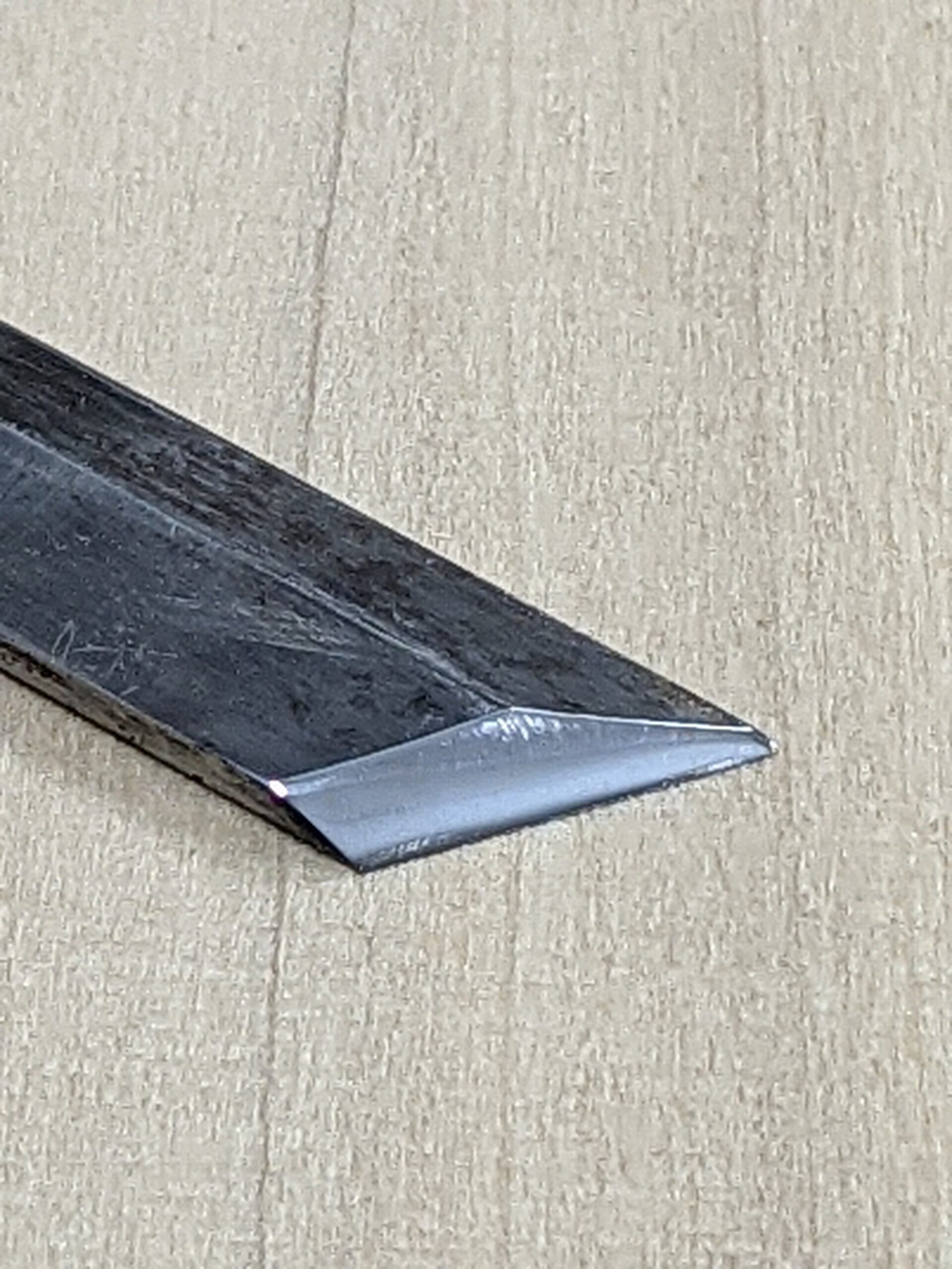 You can see now that I have filed the edge down to the edge of the bright-line and the meeting edge I have created is what I will now abrade the whole bevel to as I reestablish the cutting bevel.