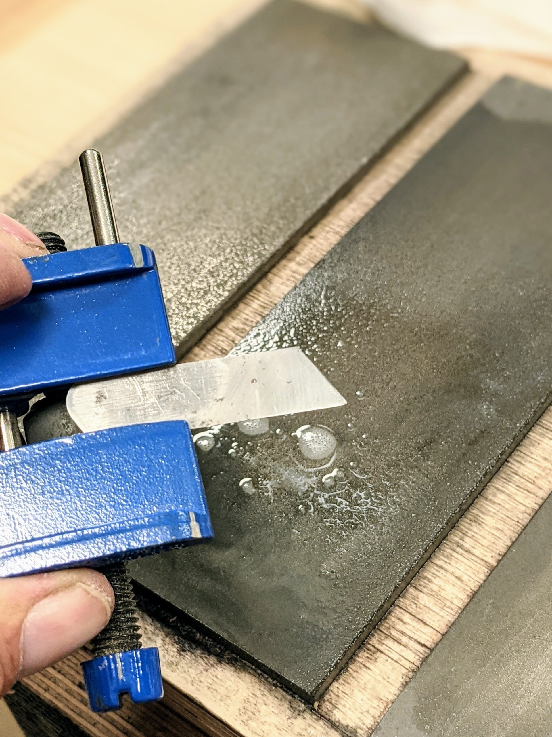Once the angle is perfected, it is simply a question of beveling the bevel evenly across its width. These small and thin cutters can be hard on the fingers and this is why the bevels end up unevenly beveled. I suggest using something to grip the cutter with and in my case I just used a regular Eclipse #36 honing guide but NOT so as to guarantee an angle because of course, the bevel is angled and not square-ended as with regular planes and chisels. The honing guide just gives a better balance and control for reestablishing the bevel and then perfecting it, no more.