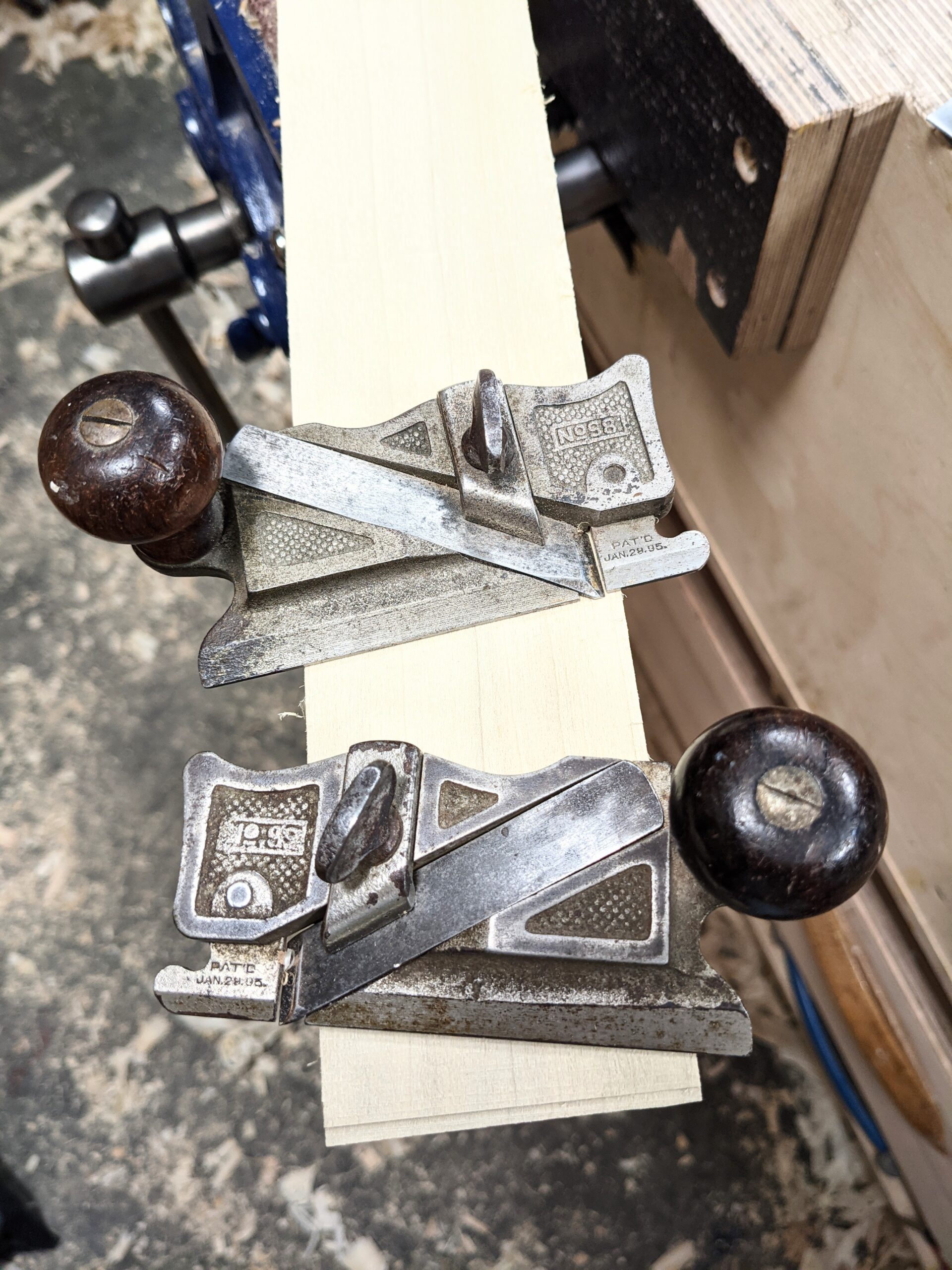 The plane I want to talk about is the side rebate plane produced by Stanley and then Record and then Preston too. Some side rebate planes have one blade in them and thereby require two such planes with the blades offered in two opposing directions to deal with opposing grain and the opposite sides of grooves and such. The two-bladed versions offer left- and right-handed in a single plane body so when you encounter situations where an opposite direction is required you can simply flip the plane over or end for end or use it on a pull stroke to resolve adverse grain issues.