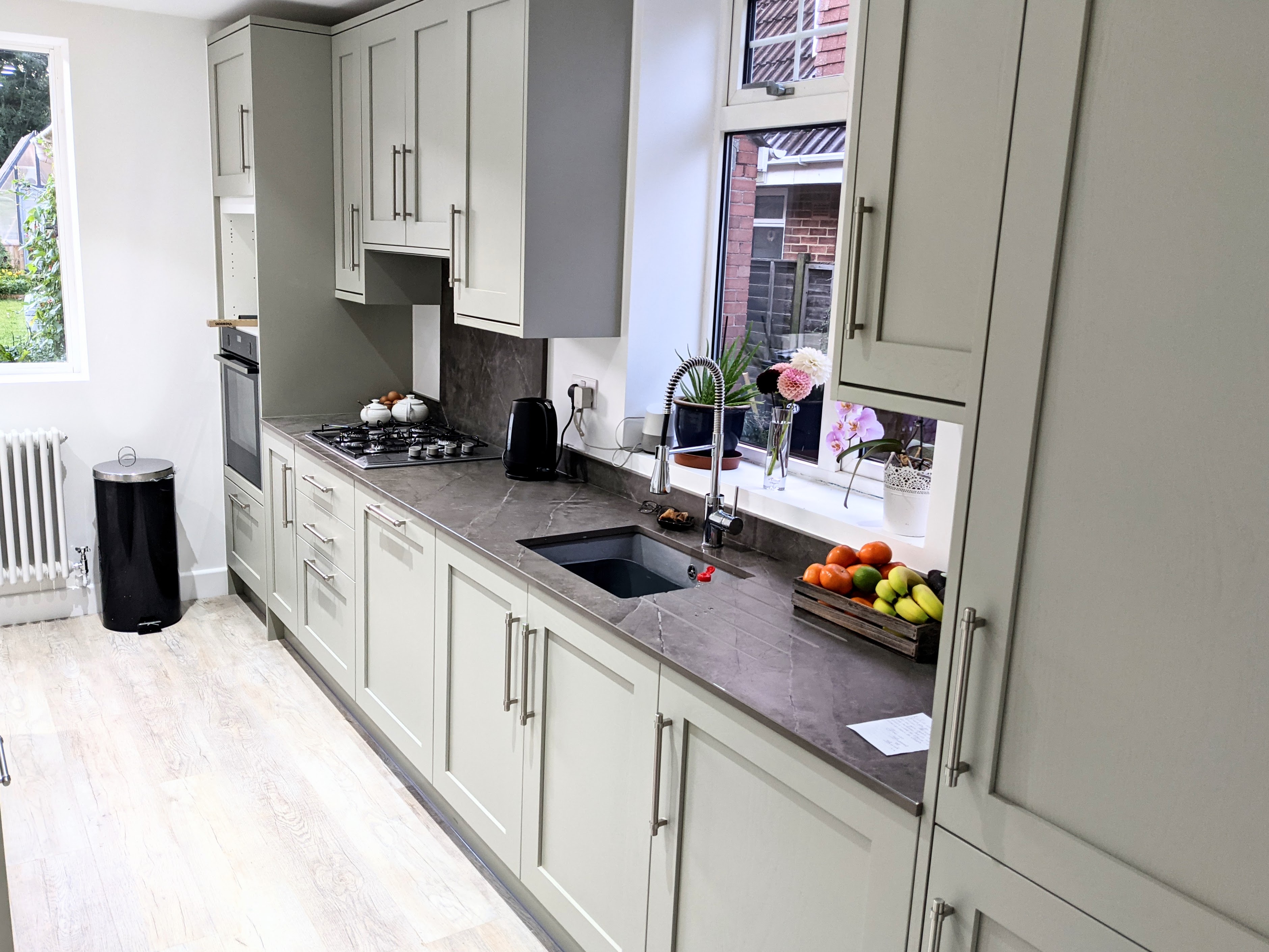 With LED lighting and roof lights above, lots of large windows and openness, unlike before the demolition of walls, a conservatory and such, the whole area is flooded with good light and has a bright and airy feel to it. We've ordered a couple of armchairs to relax in because there is a wall of glass doors and windows overlooking the width and length of the rear garden. The windows are currently being made from wood instead of the plastic ones that were previously installed and will arrive mid September for installation. Until then we have a temporary wall and door.