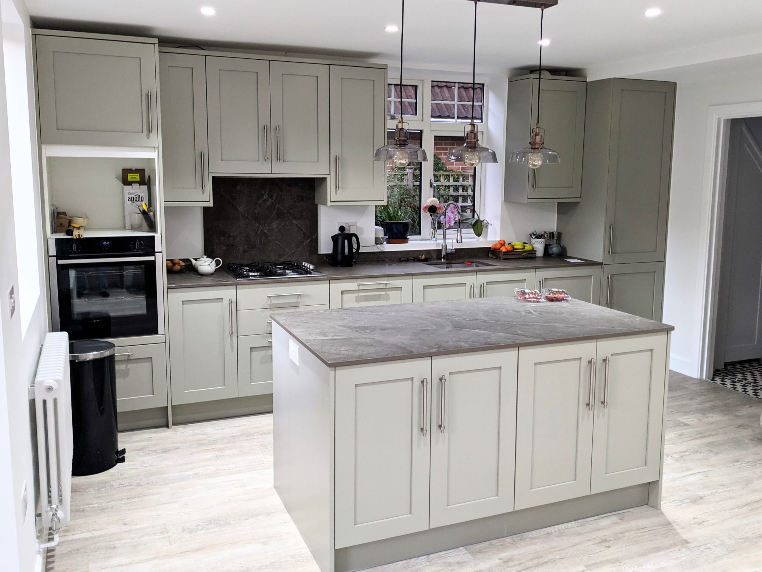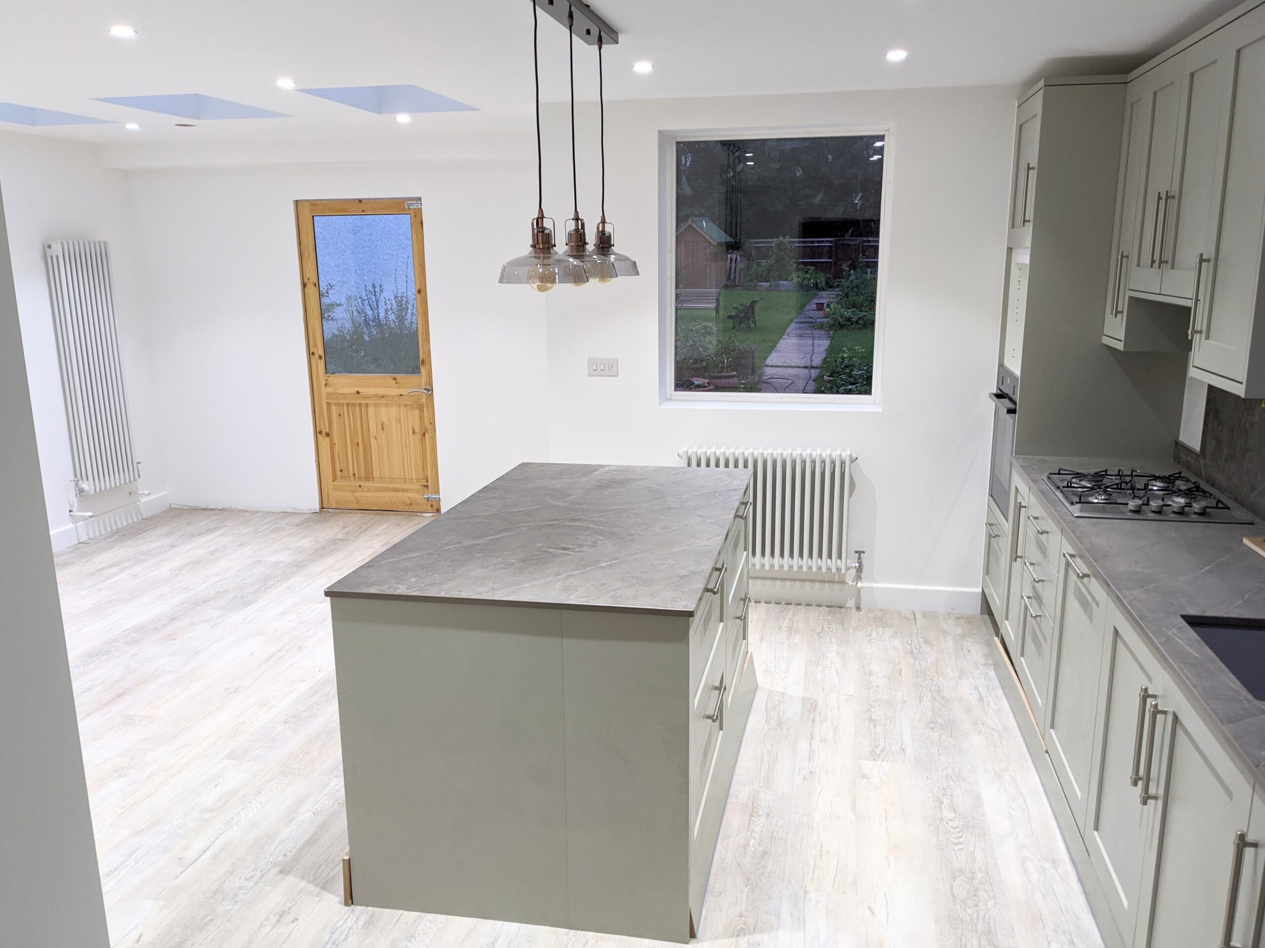 With LED lighting and roof lights above, lots of large windows and openness, unlike before the demolition of walls, a conservatory and such, the whole area is flooded with good light and has a bright and airy feel to it. We've ordered a couple of armchairs to relax in because there is a wall of glass doors and windows overlooking the width and length of the rear garden. The windows are currently being made from wood instead of the plastic ones that were previously installed and will arrive mid September for installation. Until then we have a temporary wall and door.
