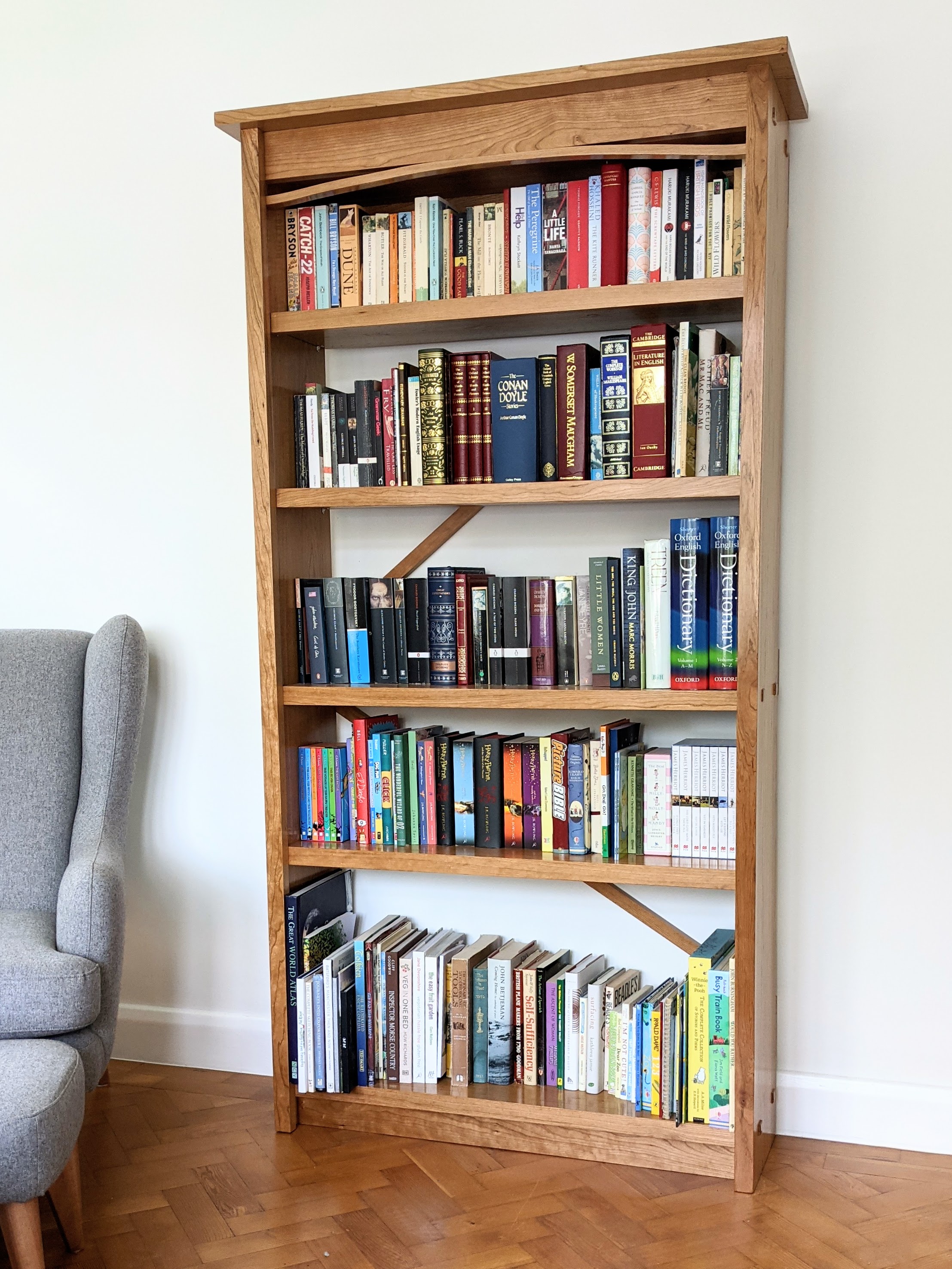 The bookcase I made below in cherry with seven shelves plus a spare, two sides and many other bits, might total 100 square feet. It would be handy if I could divide that hundred square feet by a set amount to calculate my miles per inch surface area and say I will need to sharpen up nine times to true-up and smooth and size all of the components to complete the job. Where I hit the bumps and forks in the road is that no two pieces of wood, even within the species and even in the same board, will wear down the cutting edge of my plane irons at the same rate. This, I am confident, is invariably incalculable, thank goodness!