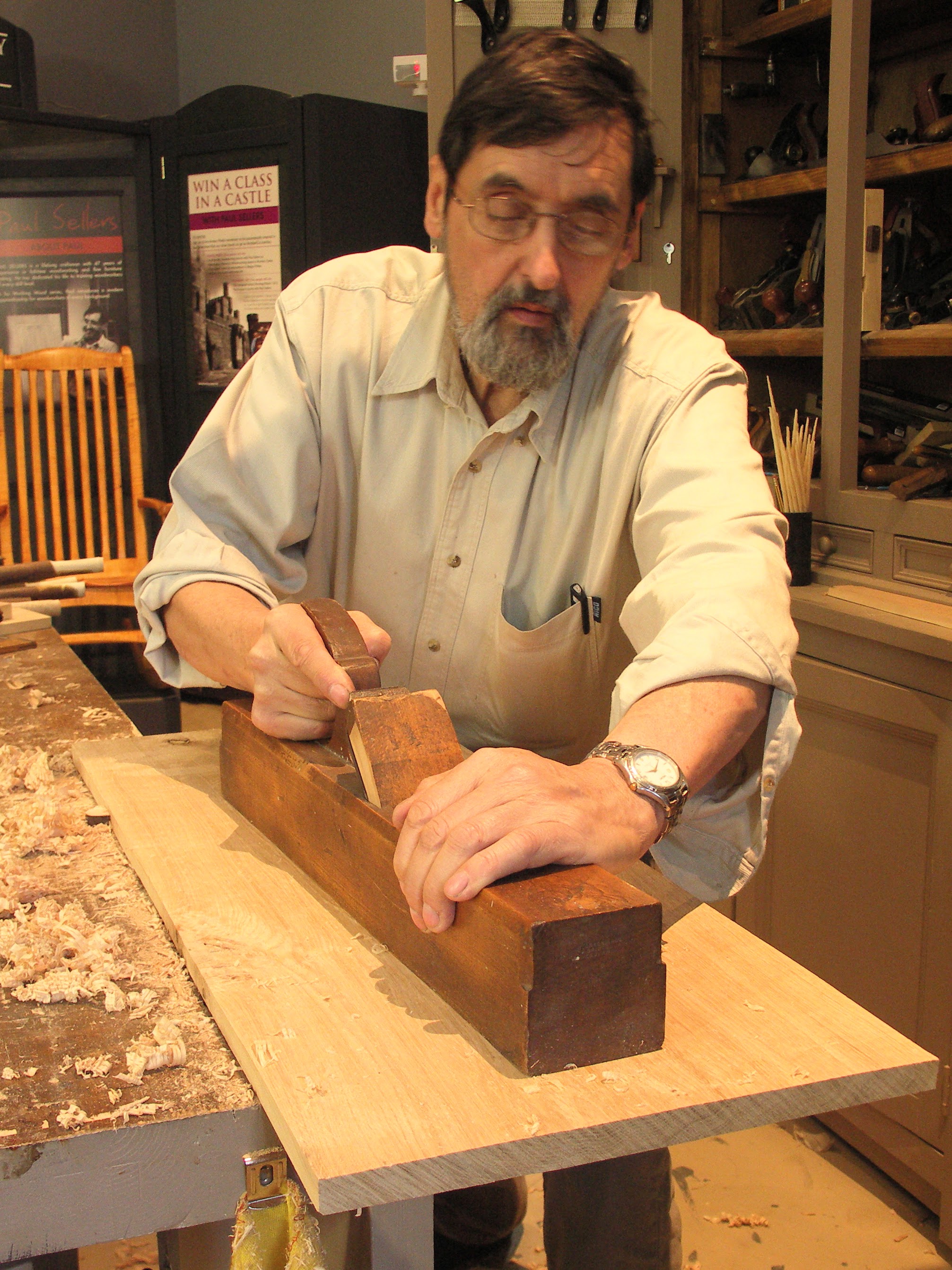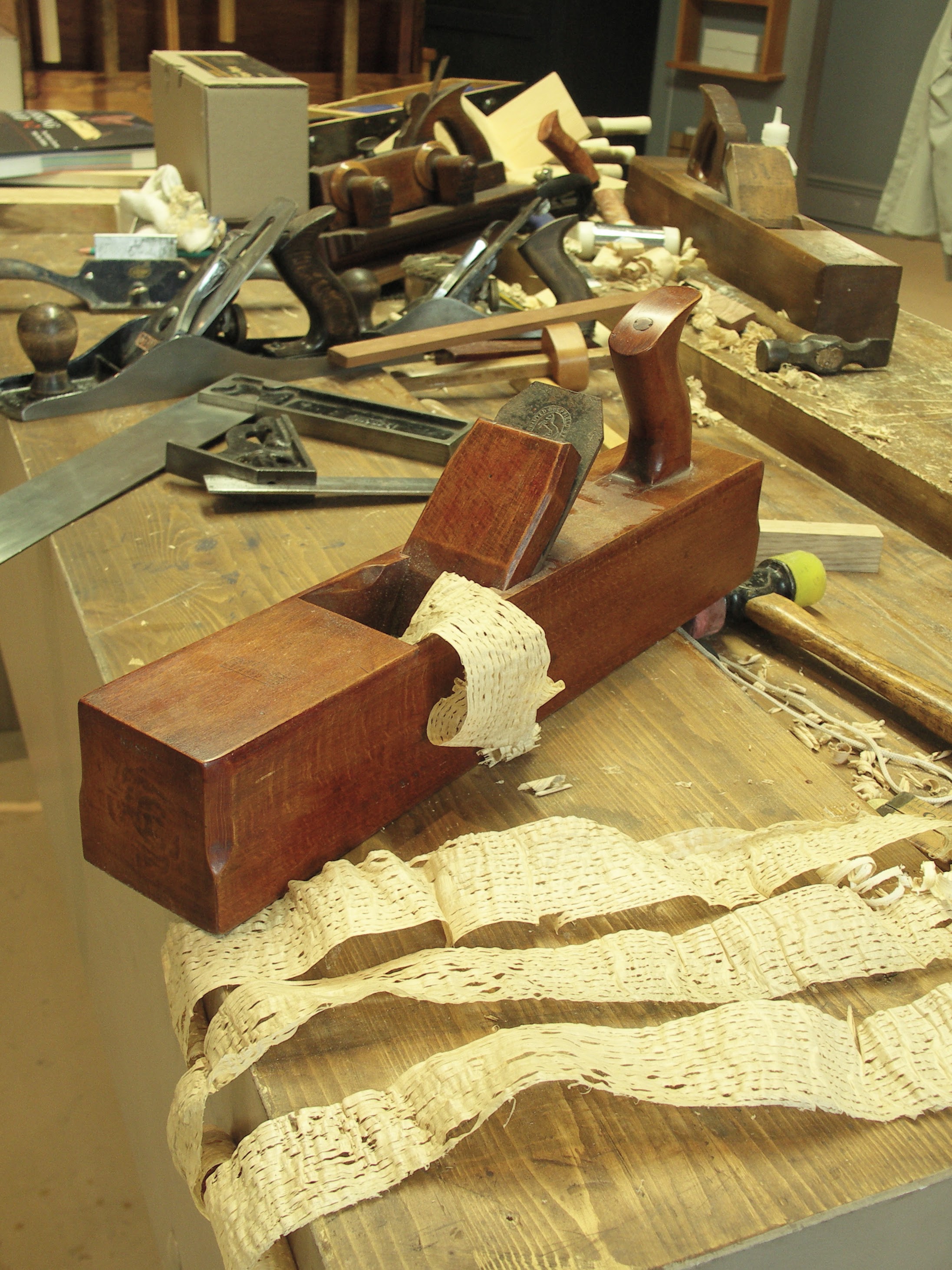 Sliding a large and blocky wooden plane into the wood brings with it the pleasant surprise that often defies describing. The cherry wood that I am currently planing is pure joy to me. Once planed, if I were to withdraw the cutting iron, I could shove the plane and it would glide across the surface for a couple of feet or more. That would not happen with a metal plane. The pleasant surprise of planing with a wooden plane is mostly about the lightness but then too the reality that you can actually plane for longer and I might suggest more accurately. The verticality of the plane is easier with an overhand grip at the fore-end and the push hand firmly enclosing the rear tote.