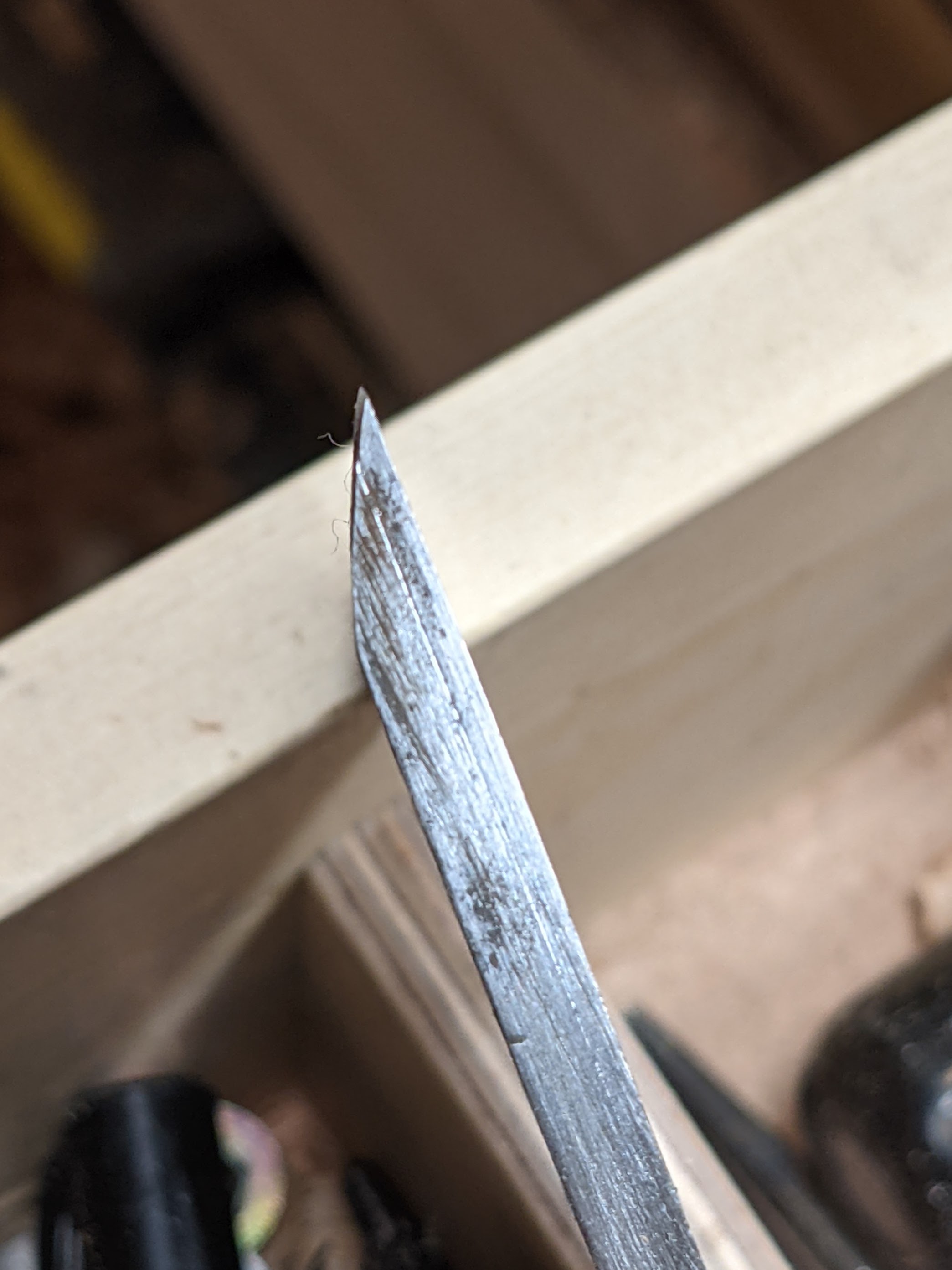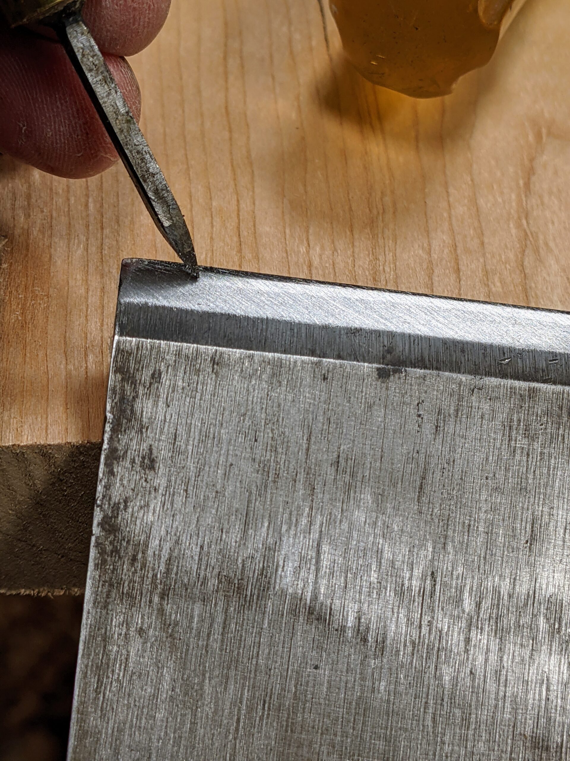 Sometimes a commenter somewhere will draw a comparison between the thicker blades in the old planes with the newer heavyweights, saying that they had thick irons too and that they were comparable in thickness to the modern ones and that it must have been because of chatter associated with thinner plates but that was not the case at all. There are differences between the new plate steels used today and hammer-forged steel cutting irons where a trip hammer compels steel into itself with repetitive blows while the steel is yellow-hot throughout the process. Mid process, a hardened plate was hammer forge-welded to softer steel, making up two-thirds of the thickness of the new iron, the iron of which was tapered from around 4mm to 2mm over a five-inch distance. This meant that the sharpening process was less laboursome than the new steels because the hard part of the bevel was only one-third or so of the width of the bevel -- about the same as a Stanley cutting iron bevel.