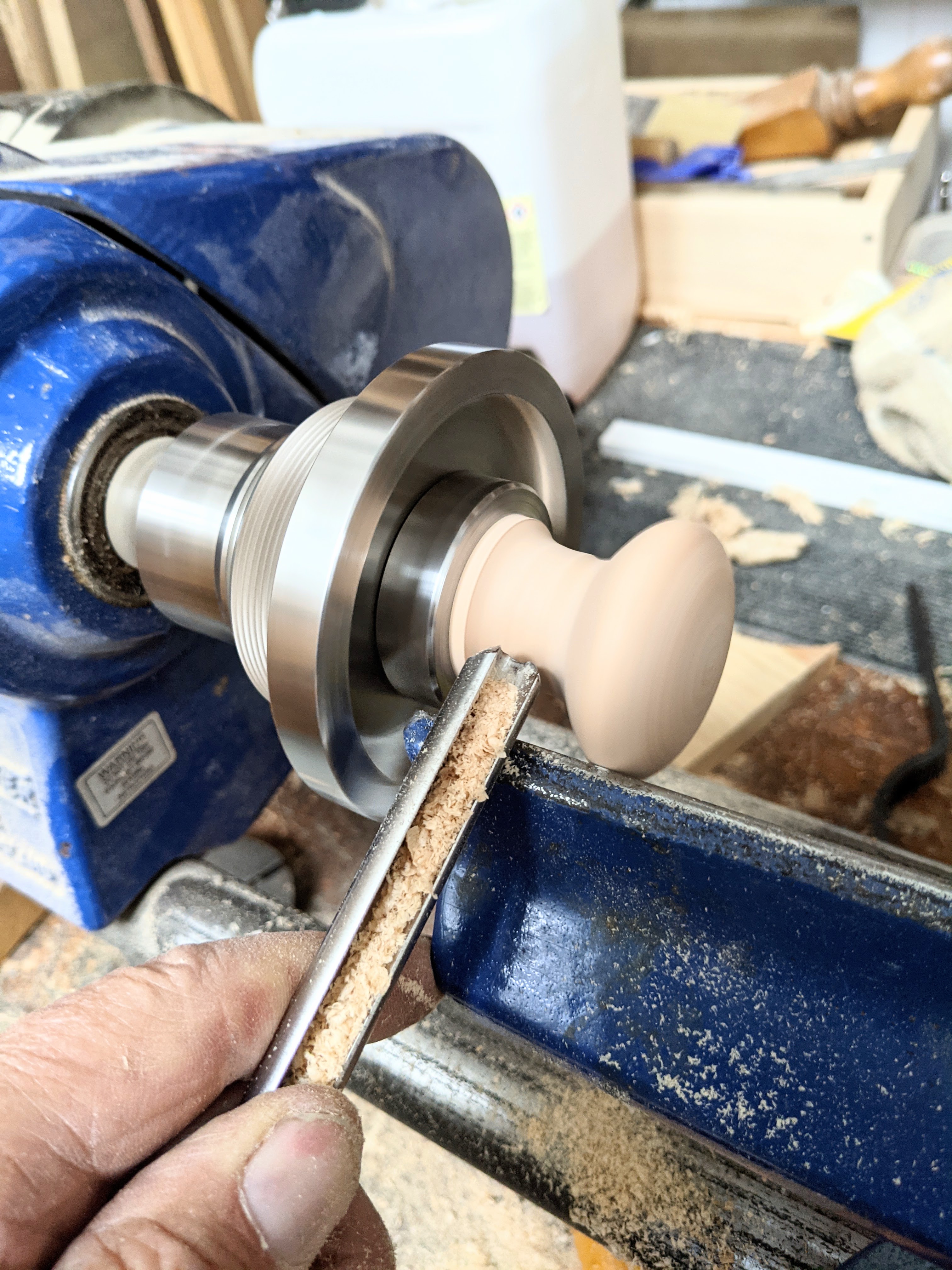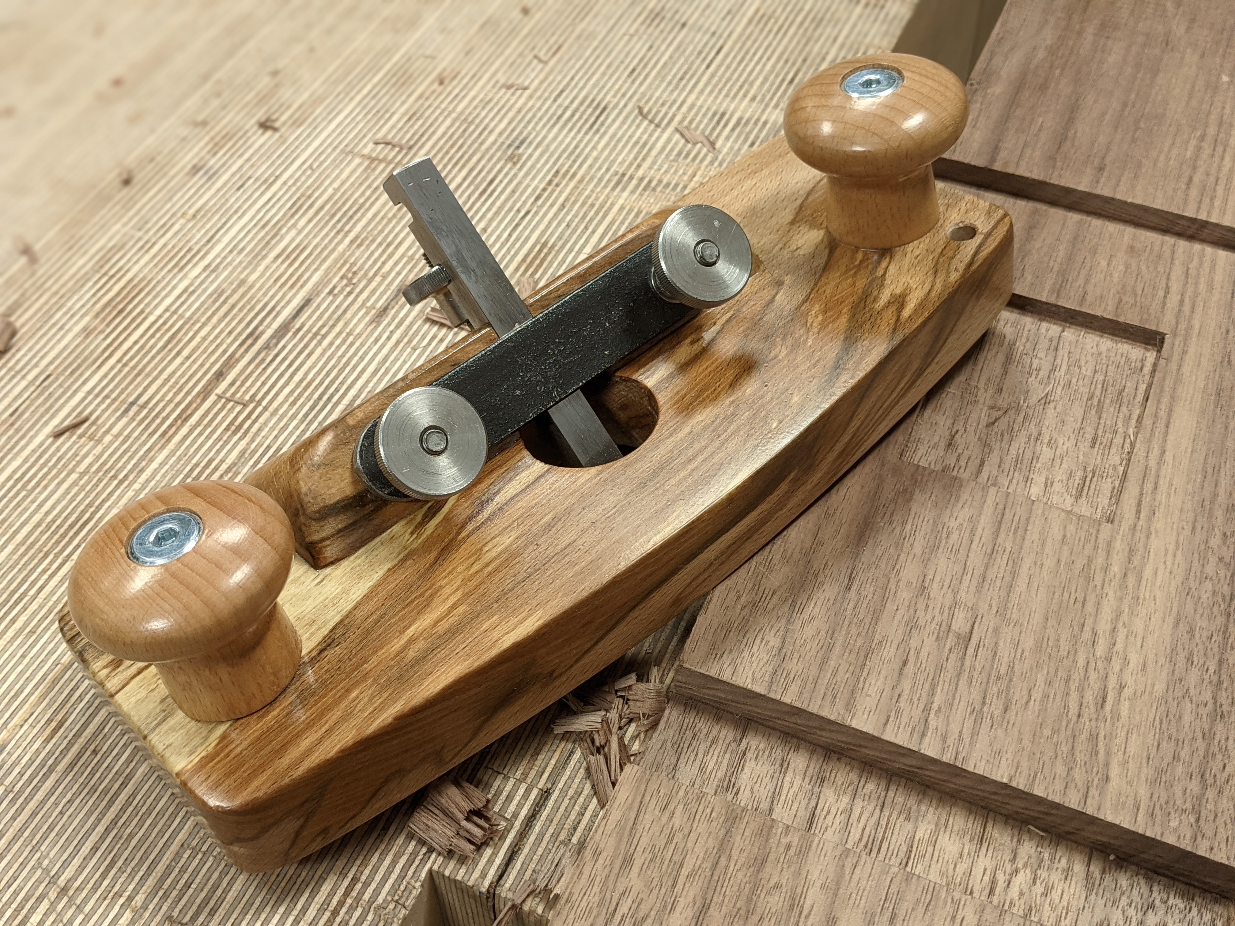 At first, I refined the doorknobs by rechucking them in the lathe and turning them to give better handling for plane use and less of a doorknob look too. The problem I then faced was that `I was telling my audience to go out and buy a lathe! I couldn't do that. My audience is global and I cannot assume that everyone has access nor did they have to own a lathe. I came up with a much better alternative.