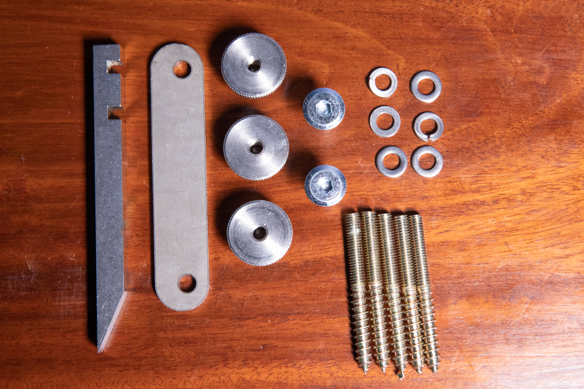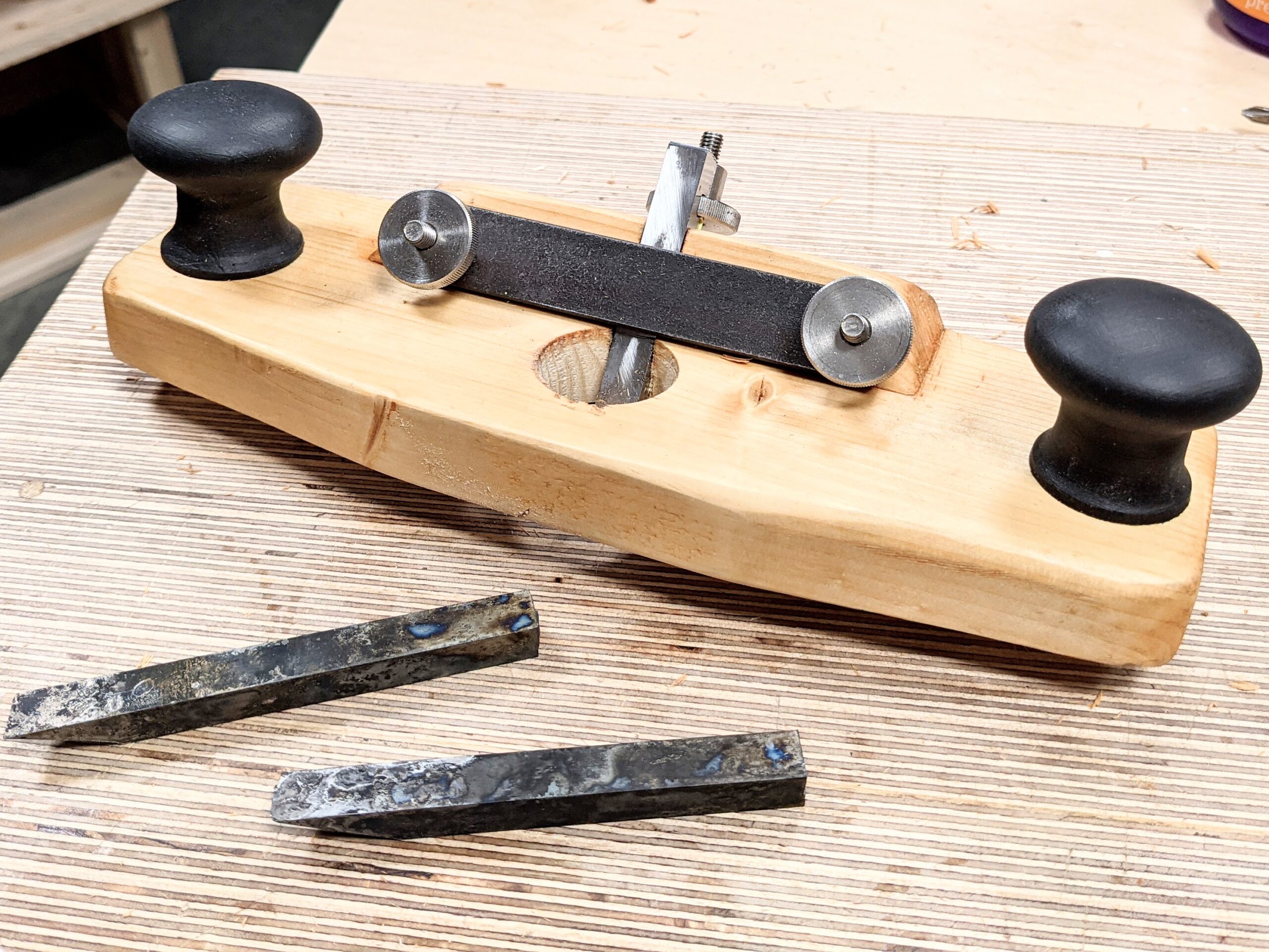We have put together all the metal parts needed to make your own router plane. The parts are high quality off the shelf parts in the case of the washers, bolts, and nuts. In the case of the retainer bar and blade those are both made here in the UK by trusted manufacturers to a high standard. The blade is made from O1 tool steel and hardened, tempered, and ground to a 25-degree angle. You just need to hone the edge and it is ready to use in your router plane.
