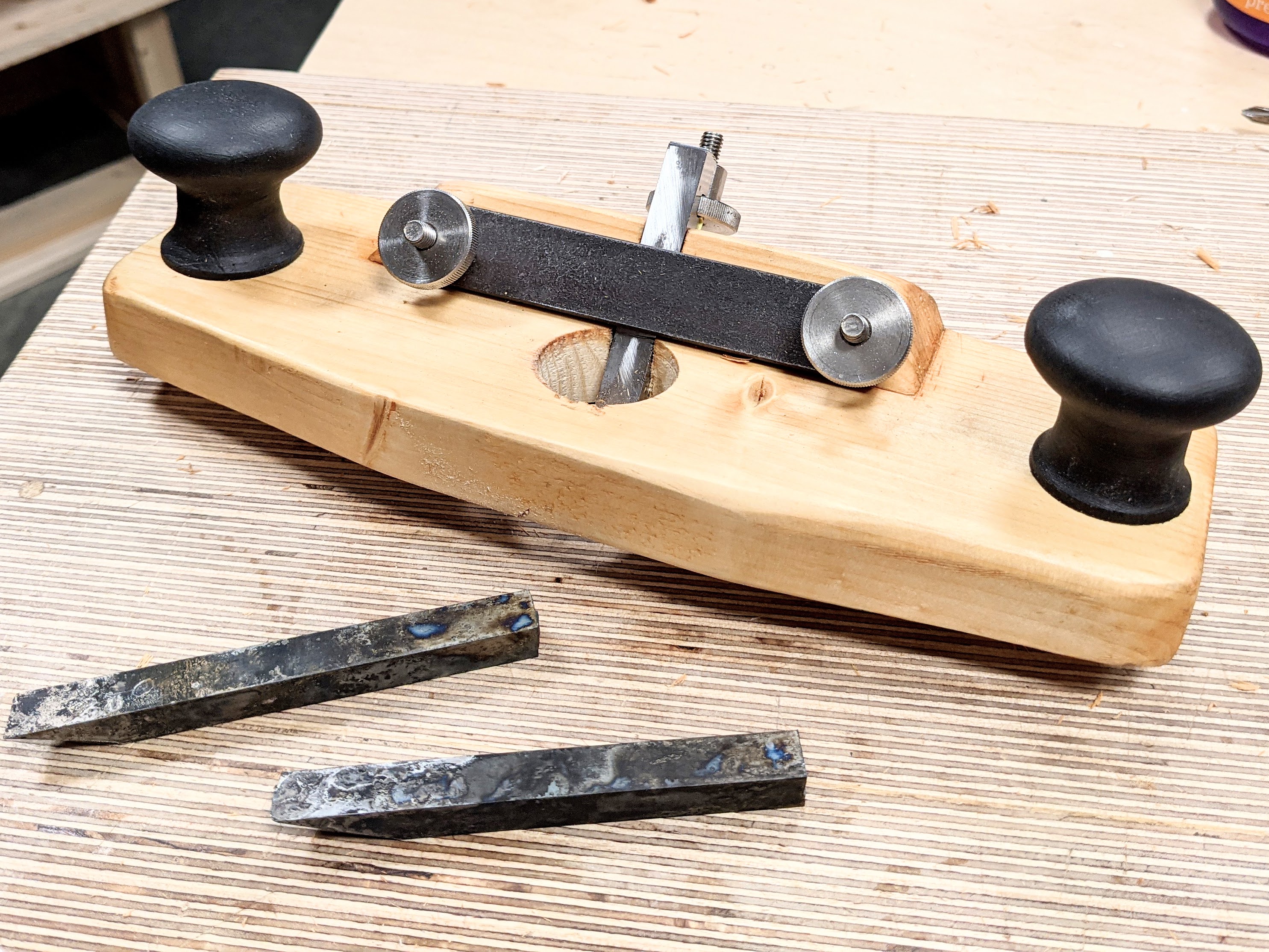 If you read my previous blog on why I made a wooden router plane you will better understand why I felt it was so very necessary to come up with my own for people to make. The one below was my very first prototype and since then I have made several variations to cater to different user scenarios. I took a 10" length of a 4x2 (2x4 USA) SP&F stud and worked it into the plane to establish blade presentations to see which worked best for me. I found that any bed angle between 45-55-degrees worked well but that the steep angle gave clearer visibility at the cutting edge. Things like this make a big difference as does making sure the cutting edge isn't too far forward to the front of the plane (though this can sometimes be a benefit for certain tasks too).