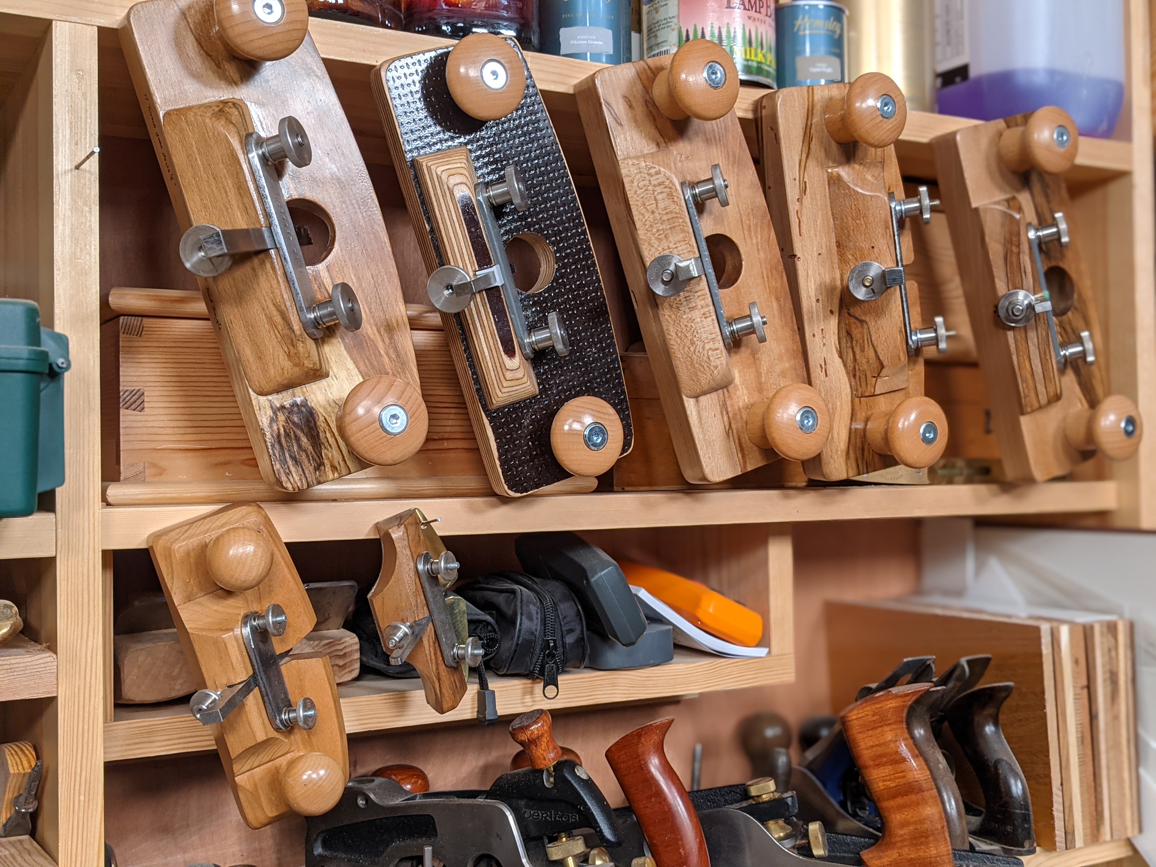 Ultimately I worked on a couple of iterations before I arrive at my spalted beech version which I just loved when done and in use. All in all, I made sixteen hand router planes before `I was done which gave me half a dozen variations on the theme and planes that would ultimately tackle every task I face using a hand router. I repeated my favourite version three times too and that is because I find it most useful to have a couple that I adjust in establishing different depths and one that I keep fixed for total control on repeatable final depths. This is perfect for things like bookcases where several shelves must be fitted.