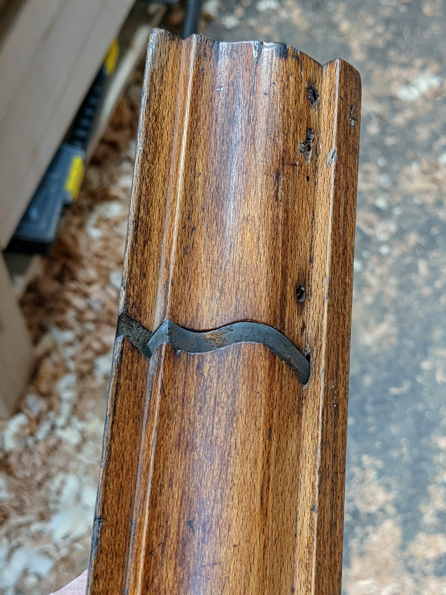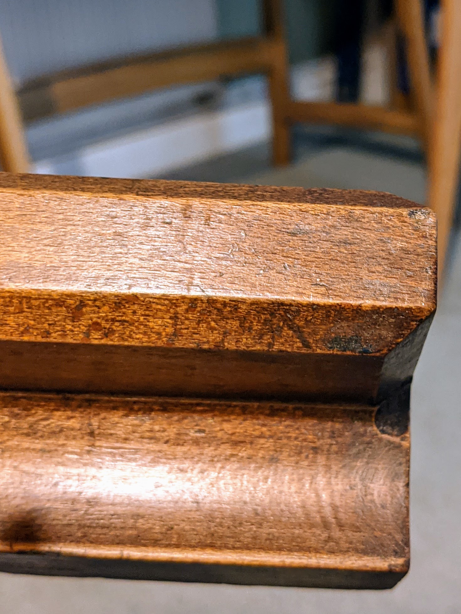My Madox moulding plane came from the eBay seller well packed, padded and wrapped with secondhand but good quality materials. Overall, the condition of the plane was excellent, with no staining, evidence of mistreatment, watermarking, etc. There was some evidence of changes made but all in all the seller gave good pictures and enabled me to look for flaws I might not like. Things the seller might not know of or have experience of were the condition of the cutting iron bevel, nails into the sole leaving either small rust stainage, holes or broken off nails left in the sole. I'm looking for other telltale signs like wormholes, powdered wood, staining to mask flaws, remakes and the like. I am happy through and through. It came with a rough cutting edge and bevel to the iron and I am not altogether sure why it was in such a condition but it is 250 years old, perhaps I should cut some slack here. But the good news is, rough as the bevel is, the cutting iron still gave me near-perfect shape and followed the sole contours perfectly with no adverse dips to deal with from grinding wheels and angle grinders -- and, yes, this happens. Why did I want a faithfully shaped cutting iron to follow the sole shape? I naturally wanted to restore the cutting bevel and sometimes an overzealous restorer can cause serious and even irreversible damage necessitating major remedial work or replacing the cutting iron altogether. This matters very little in terms of functionality but when it comes to time and value it can make a huge difference. Had it not been in pretty good shape, I would have had to reshape it with files, diamond abrasives, and such. I always look for authenticity.