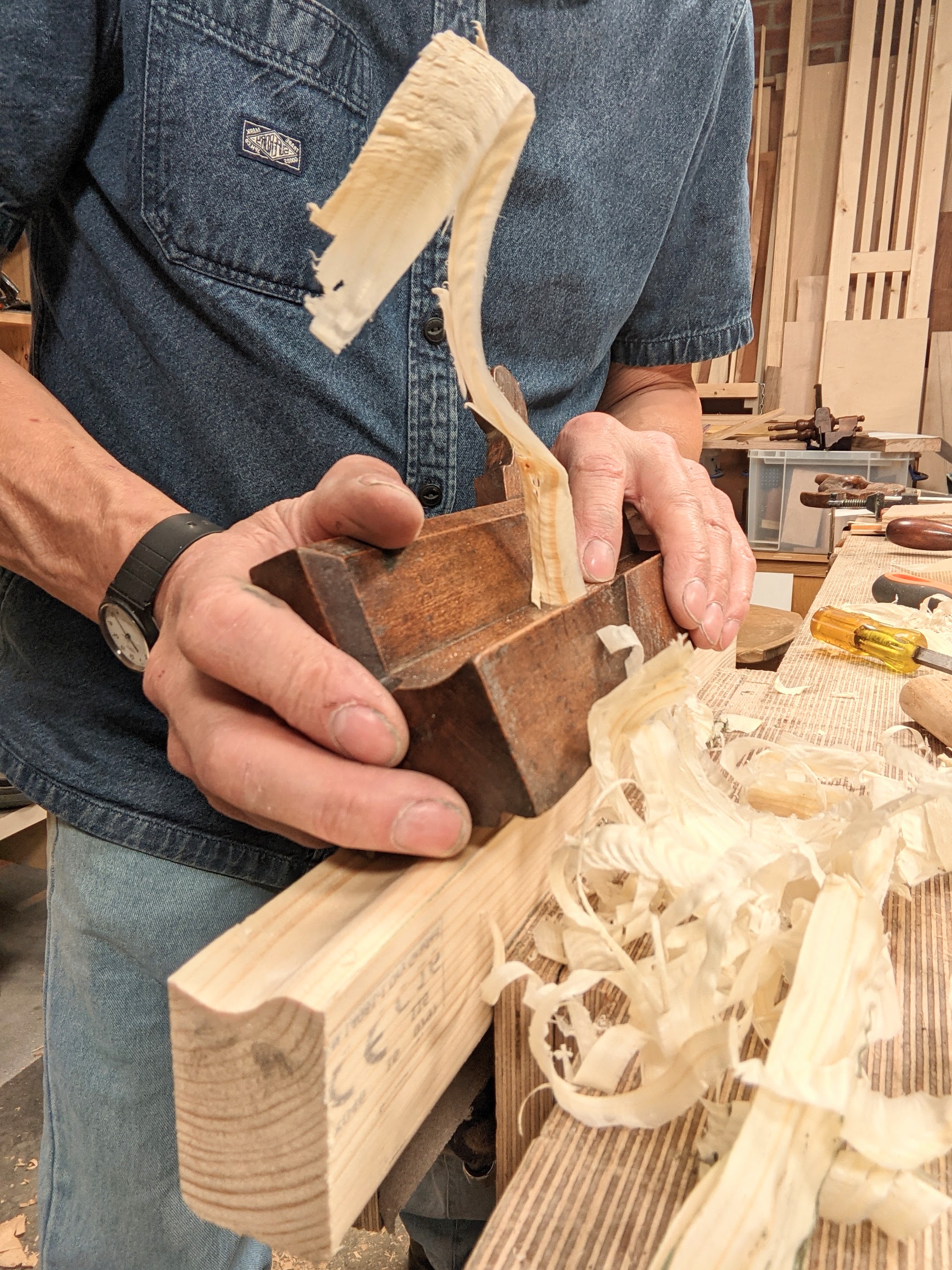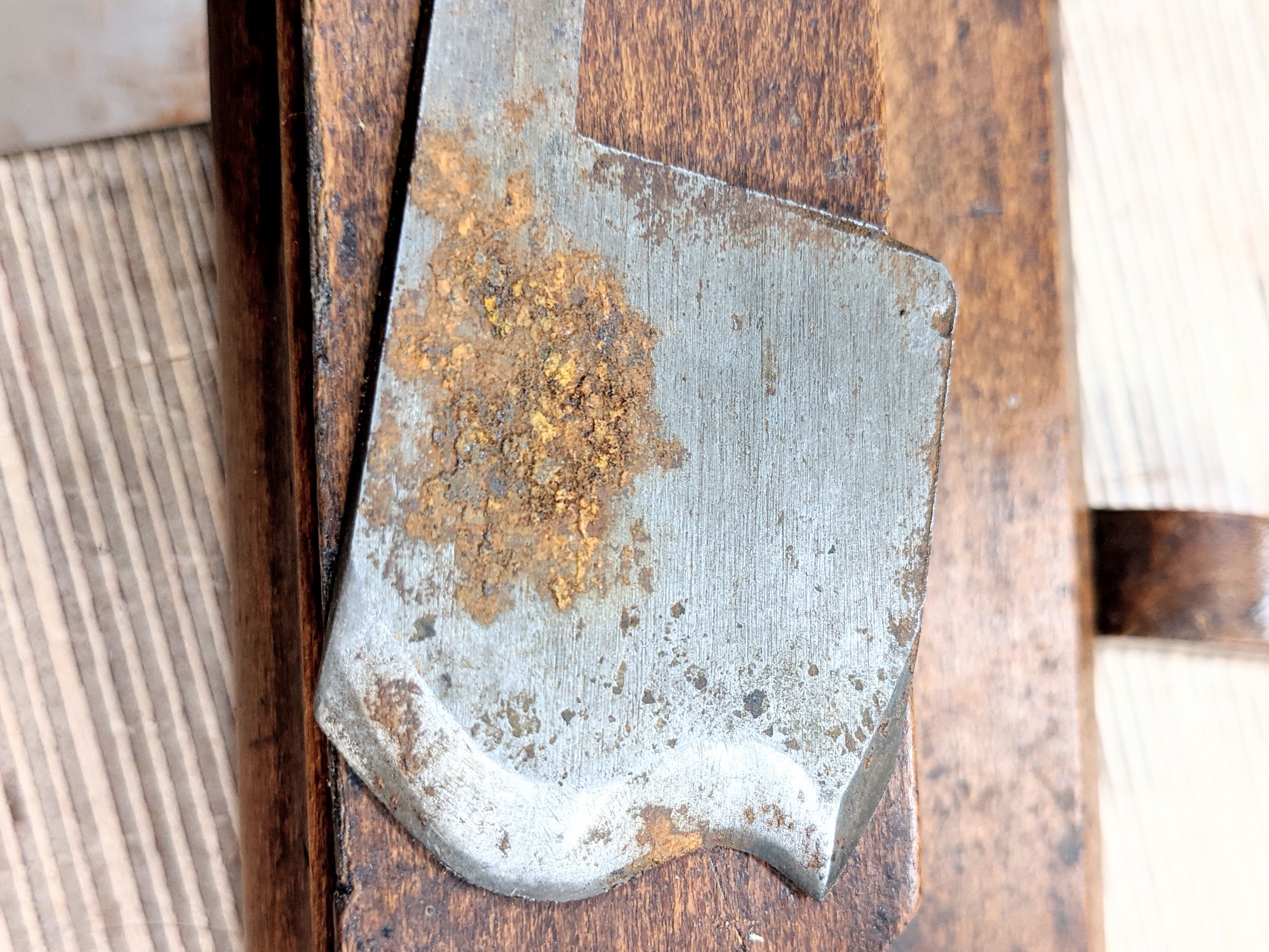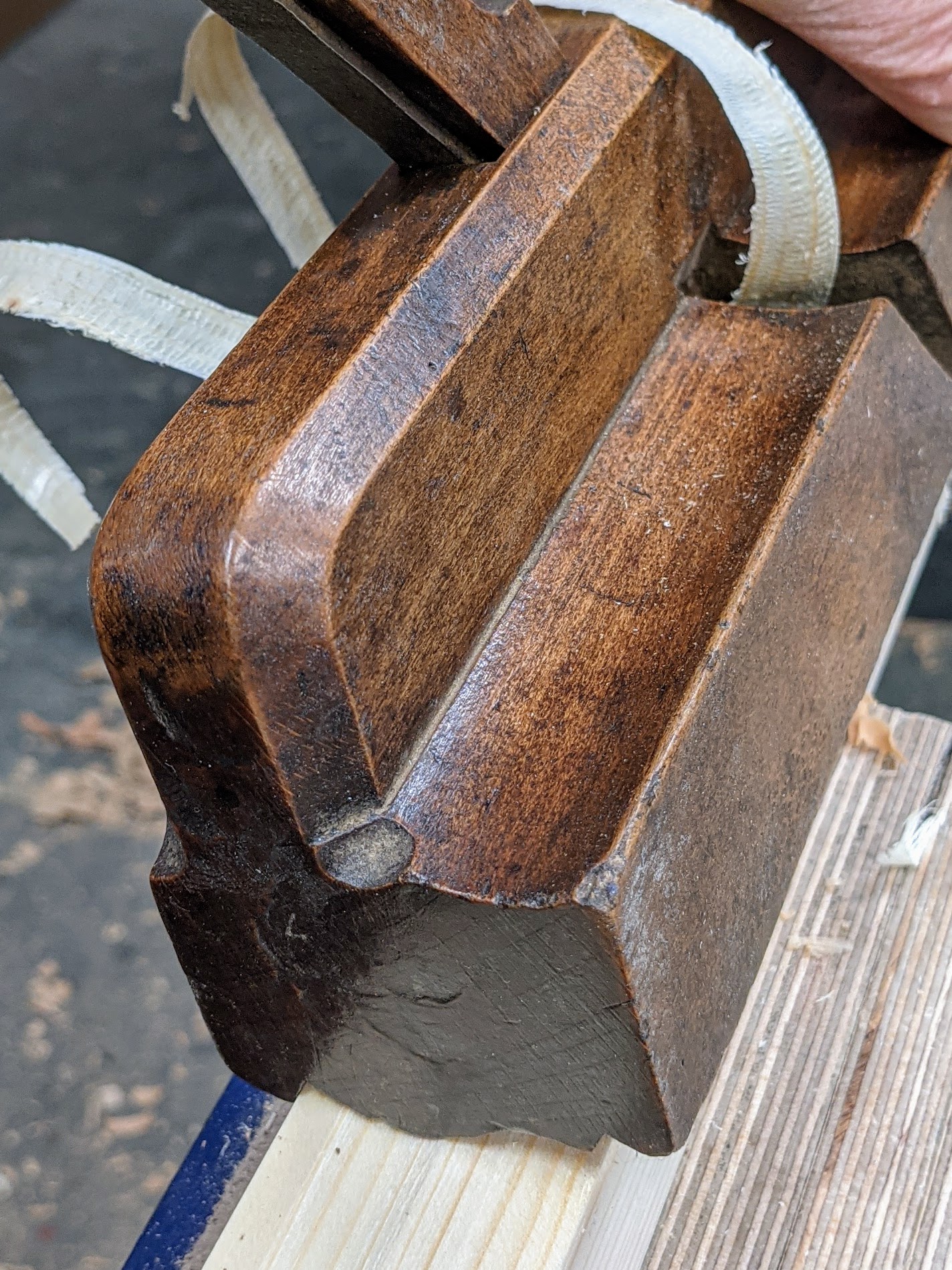 Opening up my restoration and examination began with using the plane to create a fully formed moulding following full depth from the plane. By the time I had achieved the full-width cut and shape, the shaped wood looked quite rugged. The ground bevel seemed less unrefined than it should and looked as though it had never been sharpened but of course it had because the plane was quite well used. Evidence of the blacksmith's hand forging and hammering was present clearly in and throughout the cutting iron as expected. I can see the clear line of a laminated blade where the smith hammer-forged hard steel to softer steel for added durability and the development of as keen and durable an edge as possible. It's good to note this now as the oxidation evidencing this will soon disappear when the blade is abraded, sharpened, polished and used.